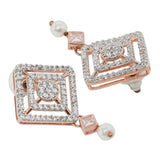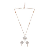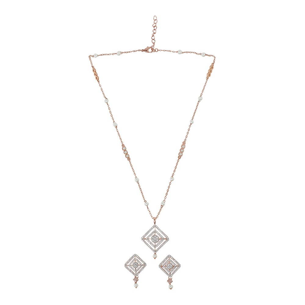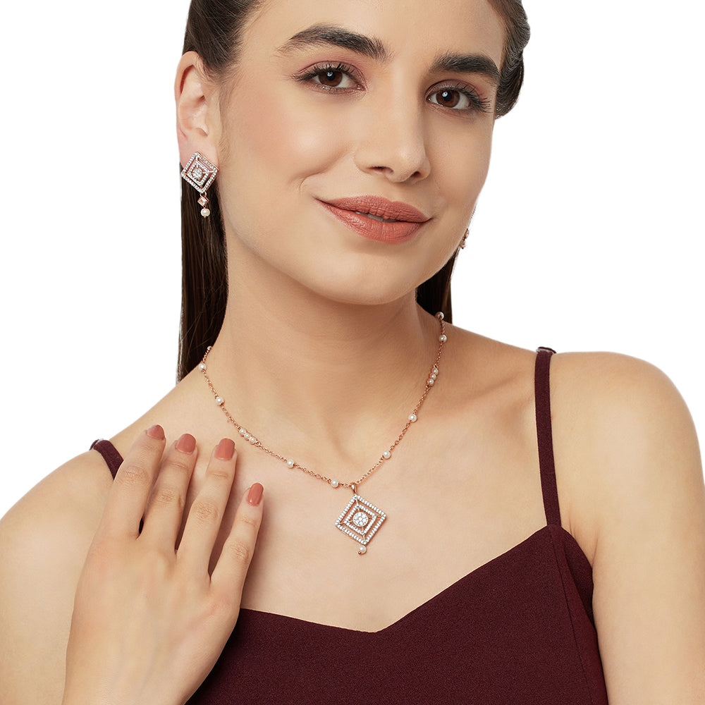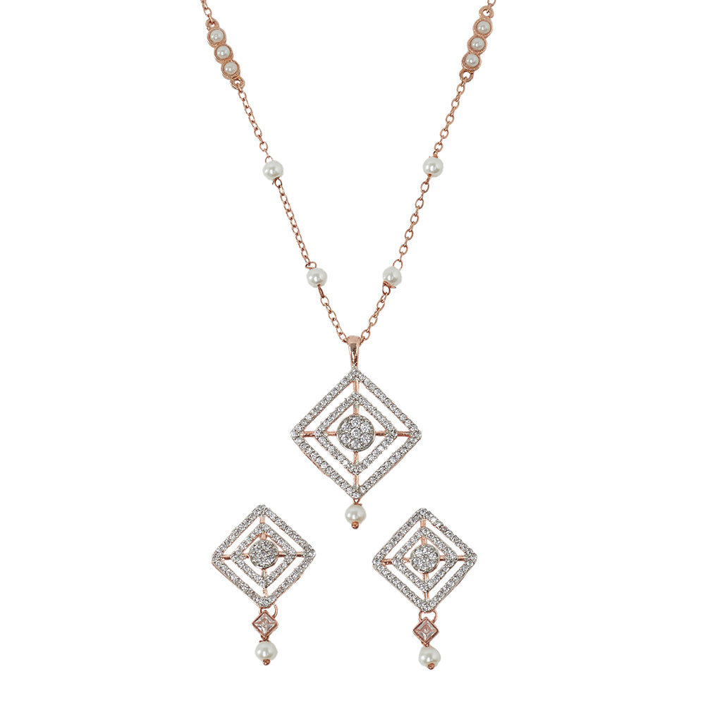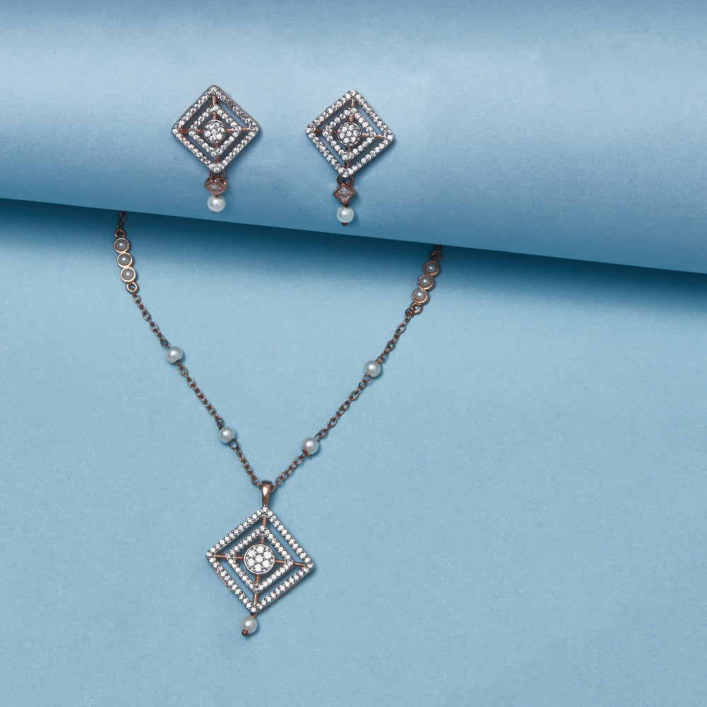 Pendant set featuring a contemporary, edgy design, fashioned out of brass and yellow gold plated. Embellished with faux pearls and CZ gemstones, the pendant, attached with a thin chain, and earrings are versatile, lightweight and promise to be a comfortable wear at all times.