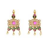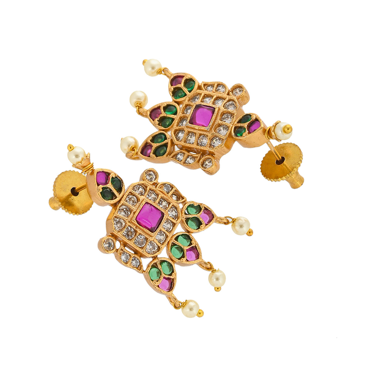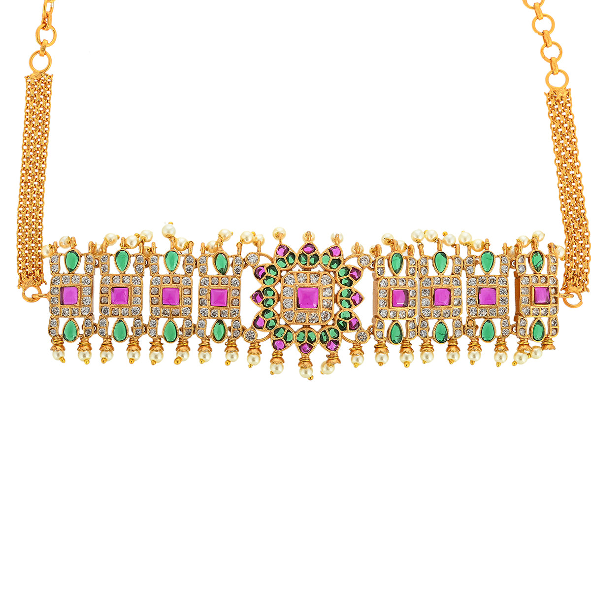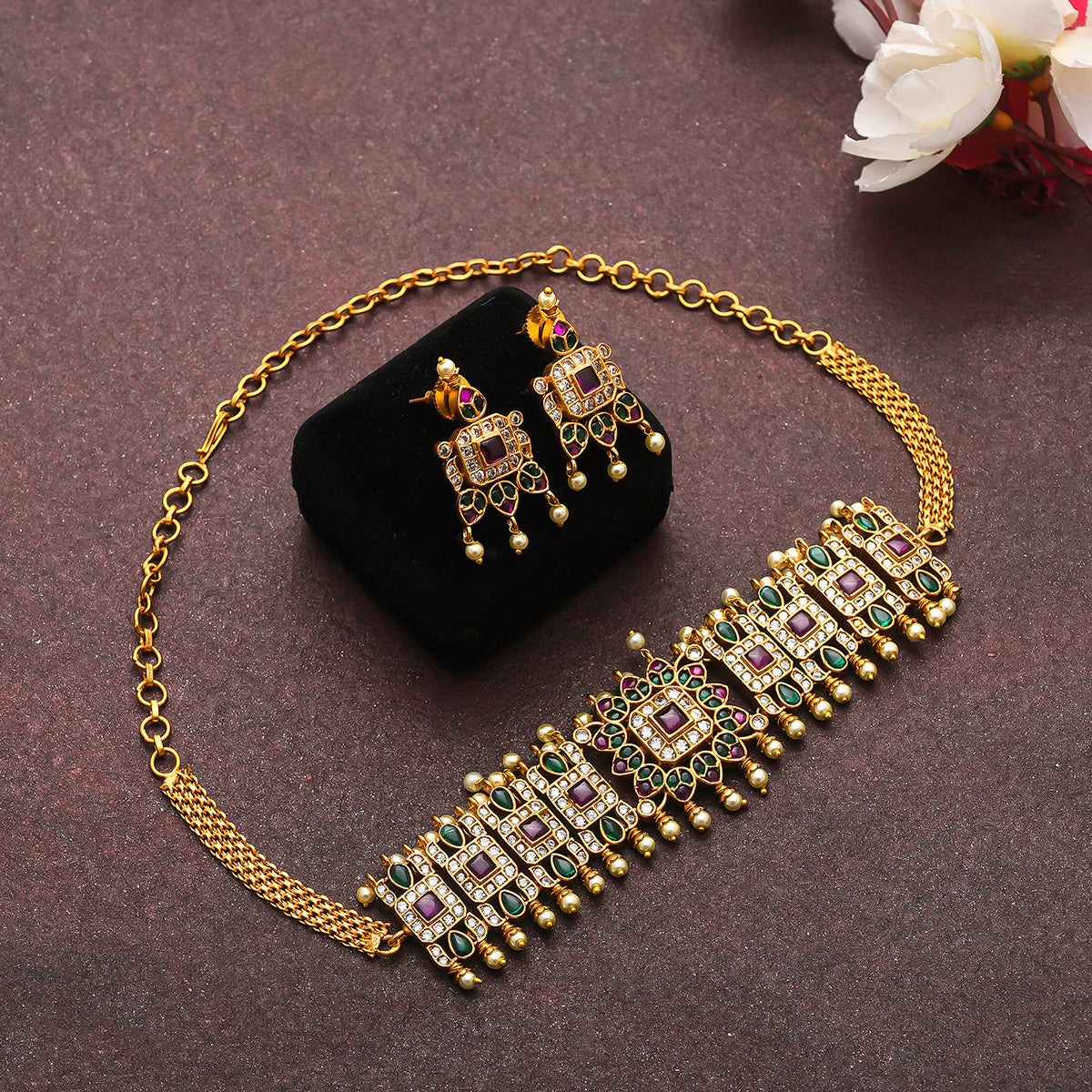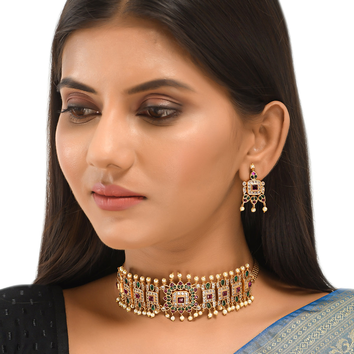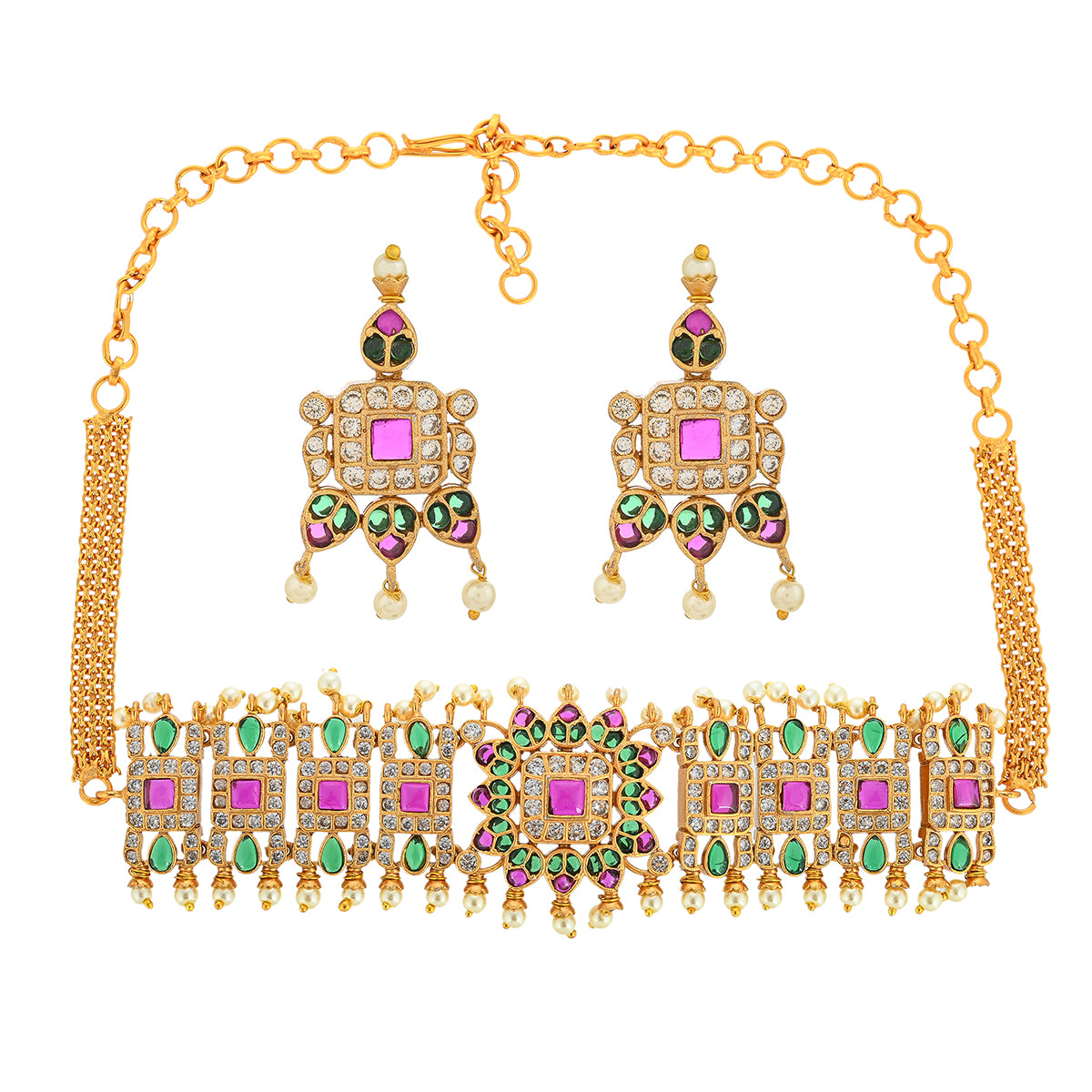 Ethnic design jewellery set, fashioned out of brass and yellow gold plated. The choker necklace and matching drop earrings have been embellished with zircon gems and faux pearls. Lightweight and comfortable, yet opulent, this set will pair well with traditional outfits.