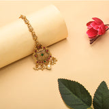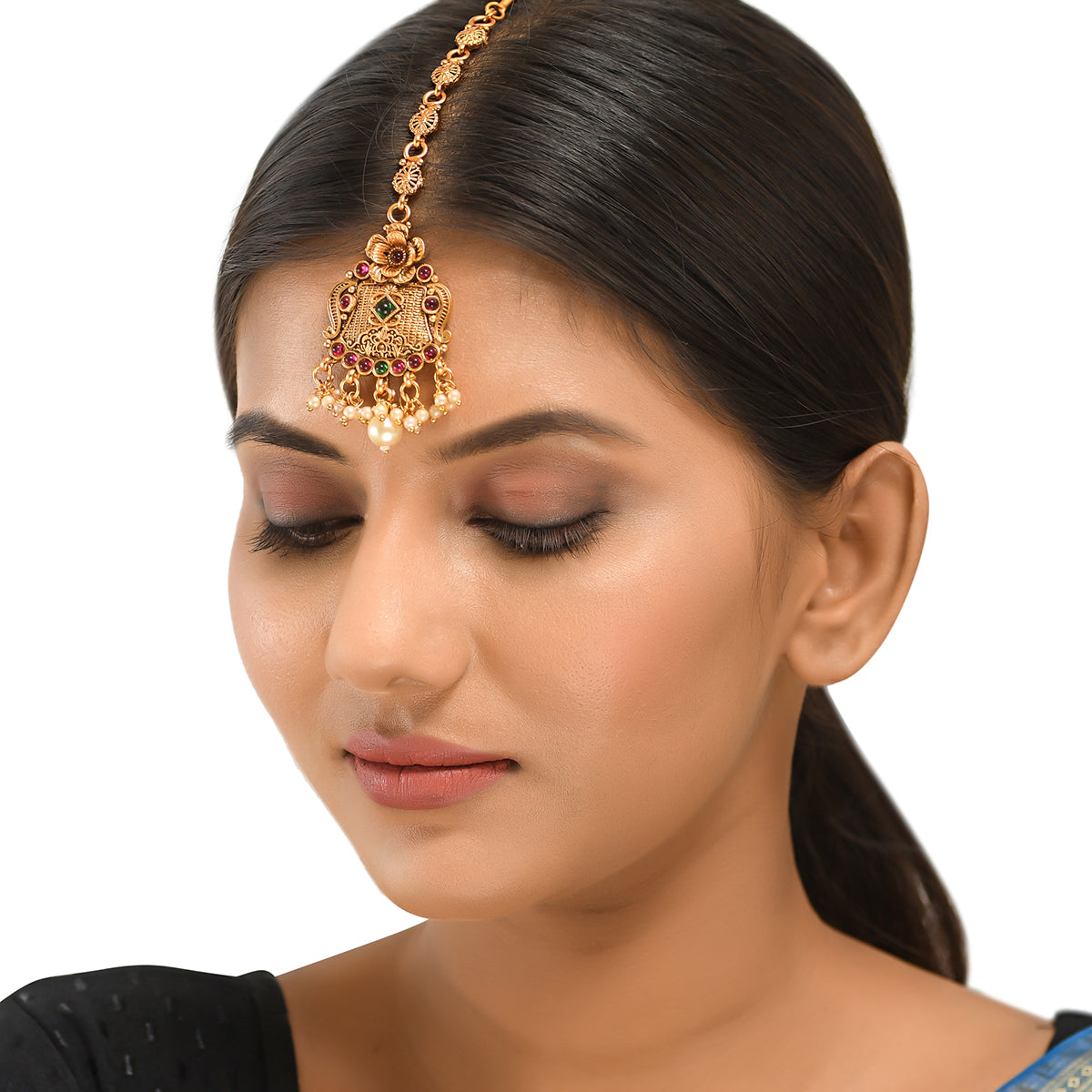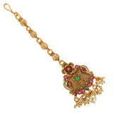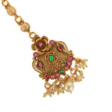 Faux Pearls and Kundan Adorned Opulent Yellow Gold Plated Brass Maang Tika