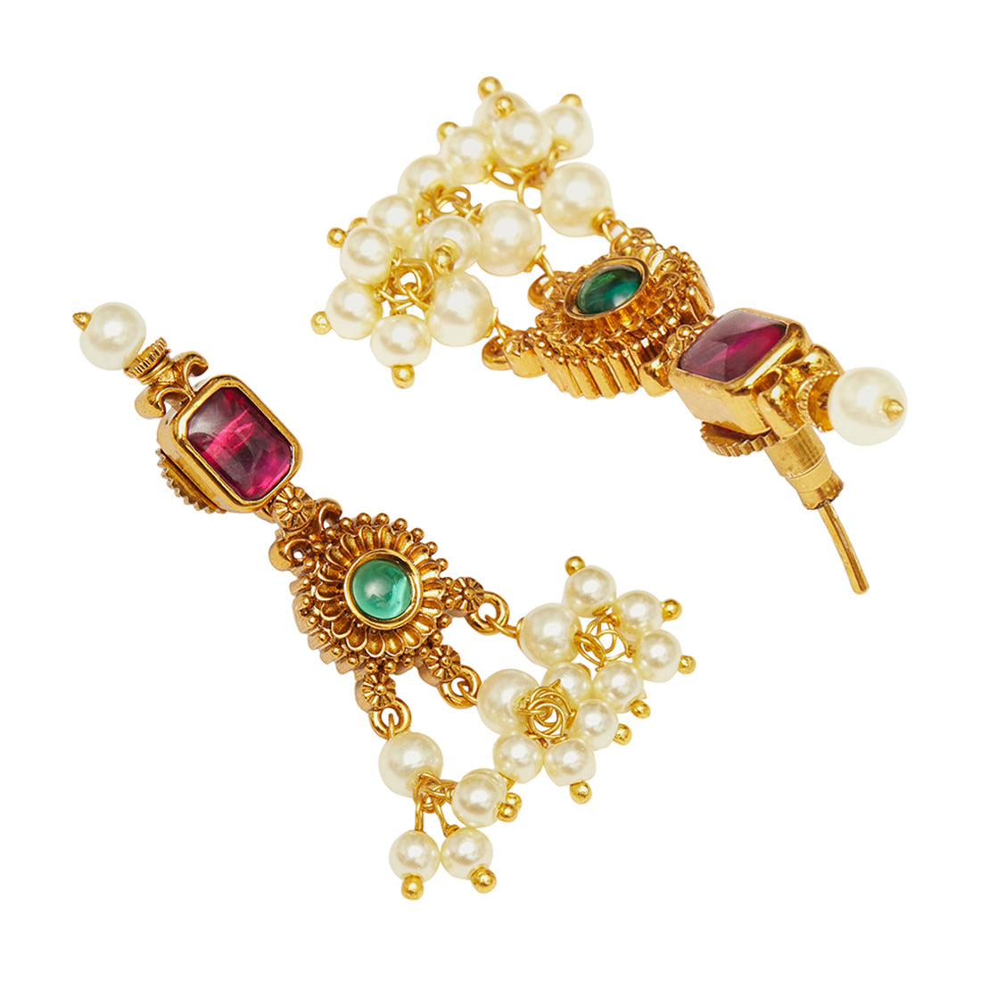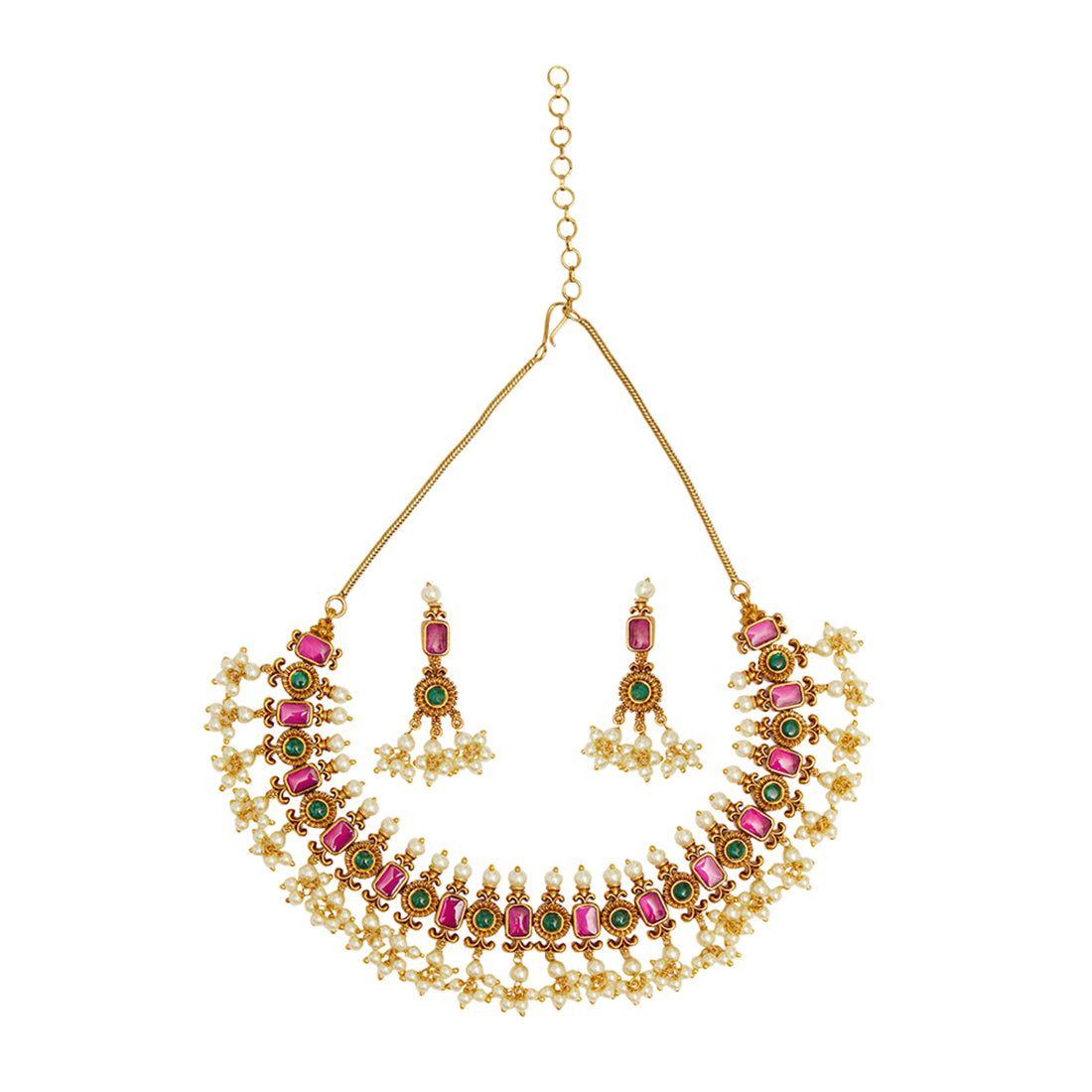 Embellished with faux white pearls and square cut zircon gemstones, this brass jewellery set has been given a classic yellow gold plating. The choker necklace and drop earrings promise to be a lightweight and comfortable wear at all times. Pair with ethnic outfits.