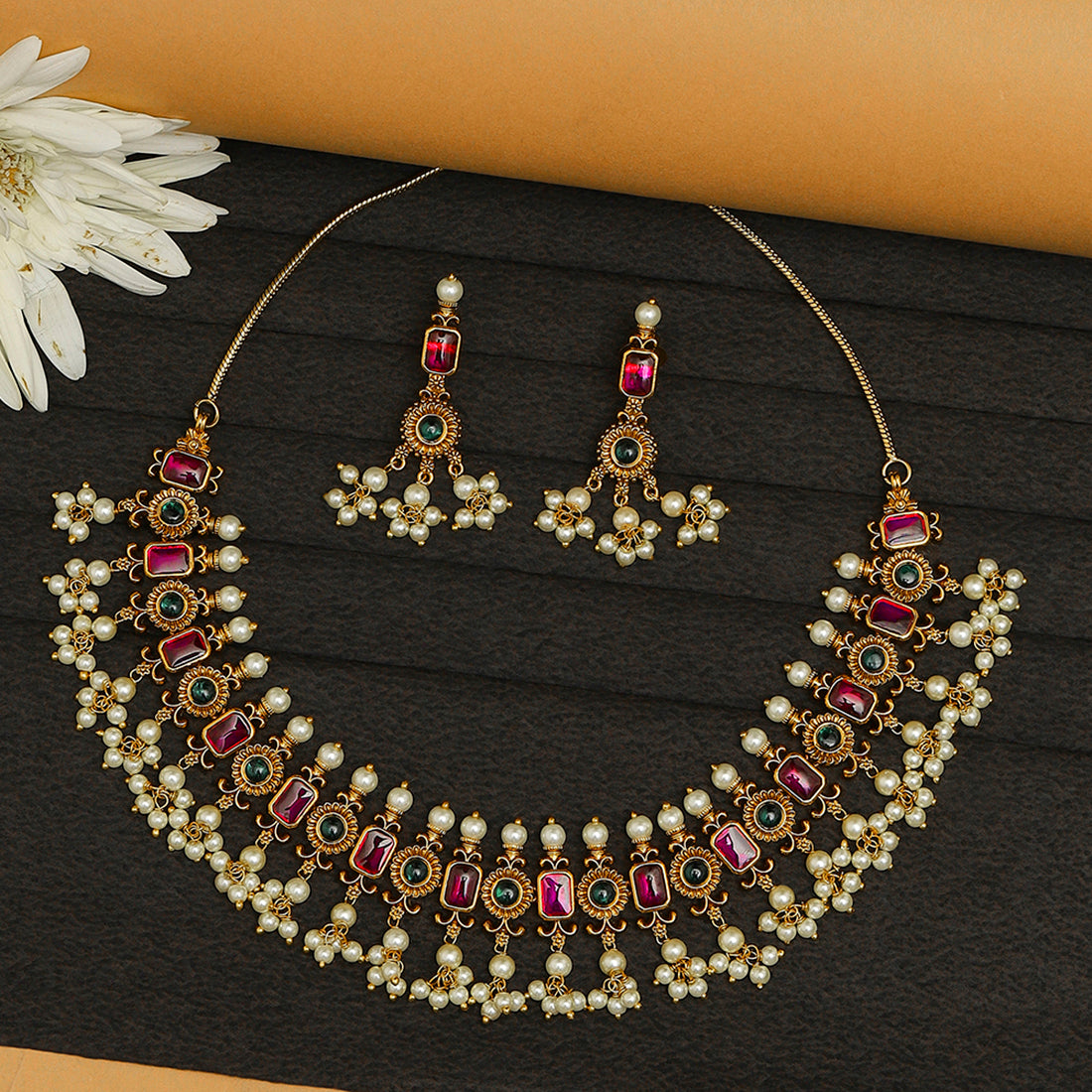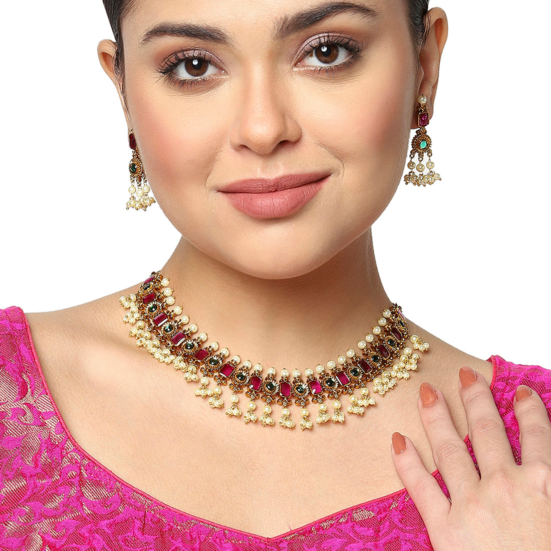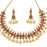Faux Pearls and Square Cut CZ Adorned Brass Gold Plated Choker Jewellery Set