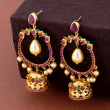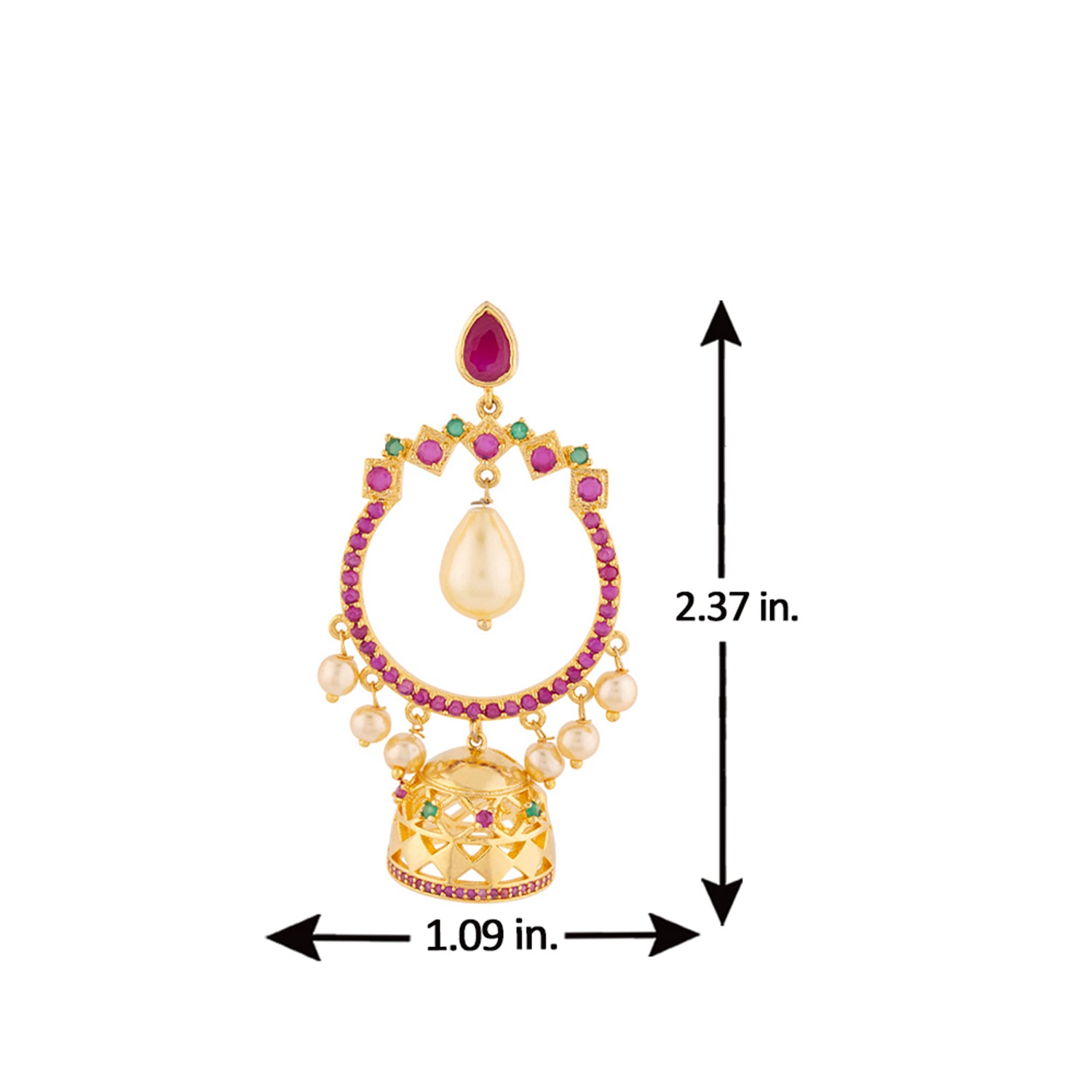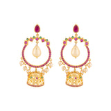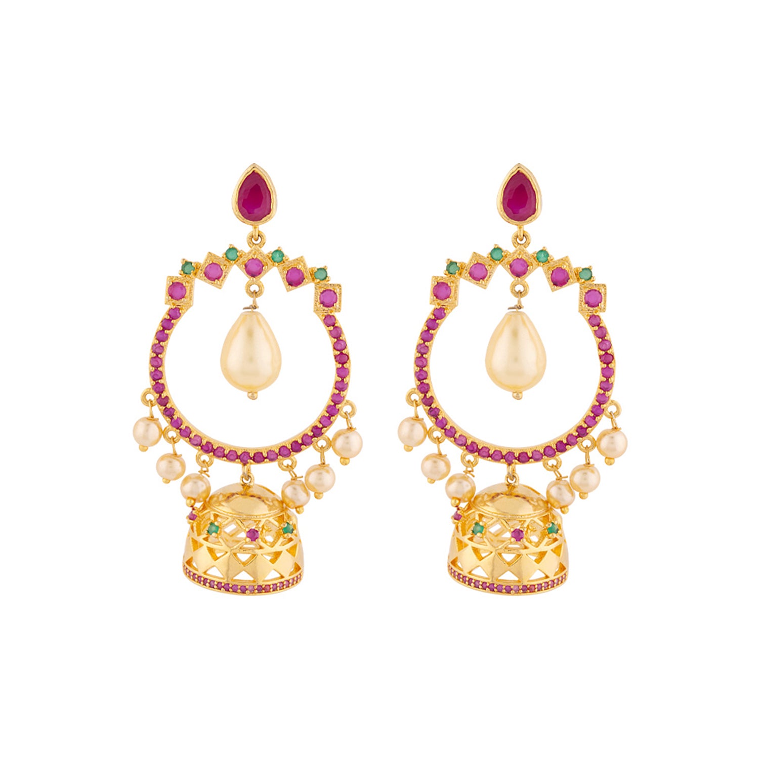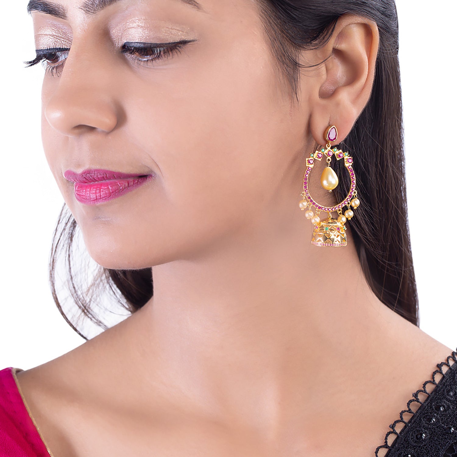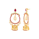 Embellished with faux pearls and American Diamond gems, these jhumka drop earrings have been fashioned out of brass. Yellow gold plated and good for ethnic looks.