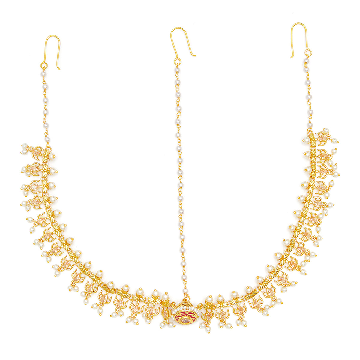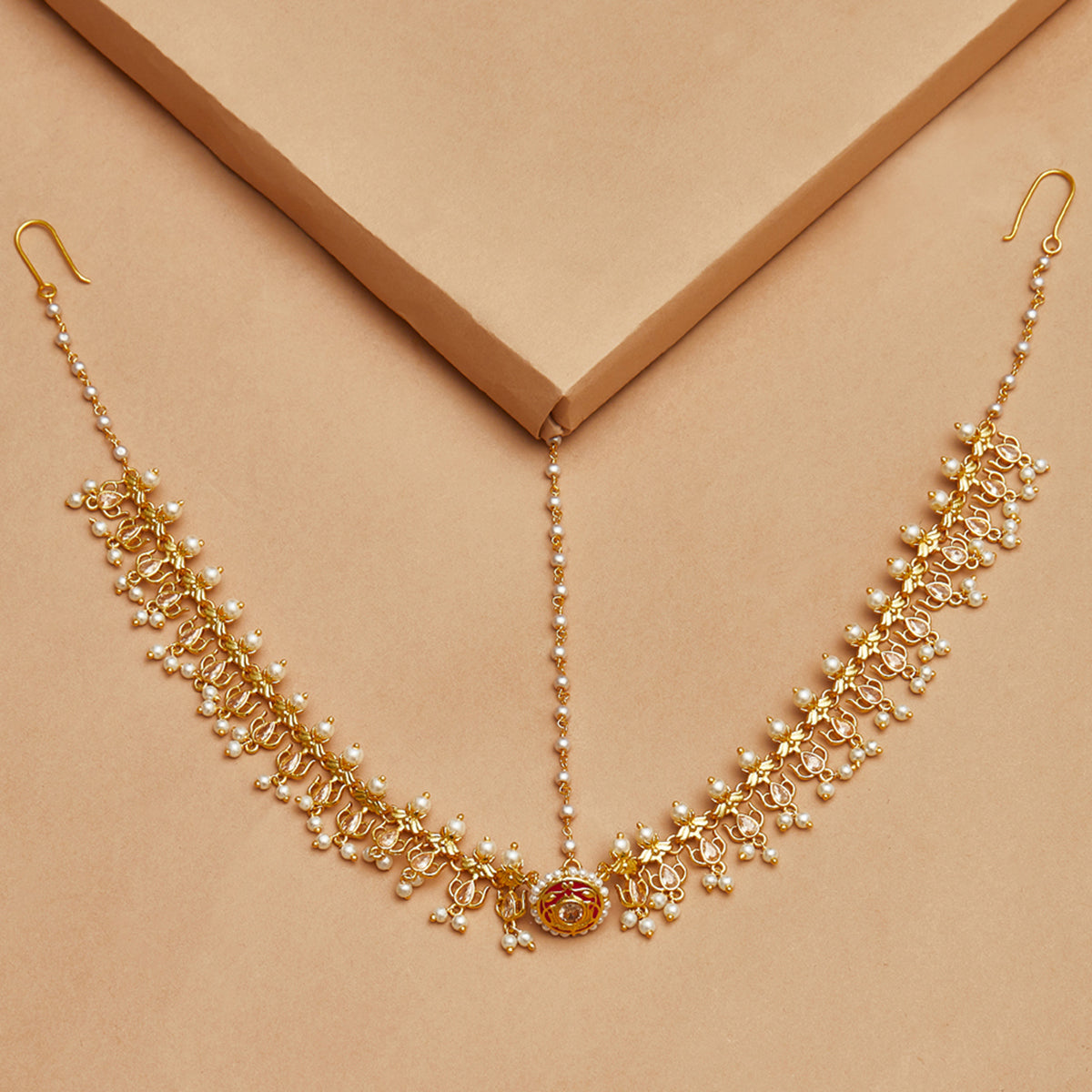 A classic matha patti maang tika, which has been fashioned out of high quality brass. Gold plating and heavy faux pearl embellishments add to the allure of this traditional piece, which can be paired with formal ethnic outfits of all kinds. It will also make the perfect bridal accessory.