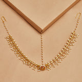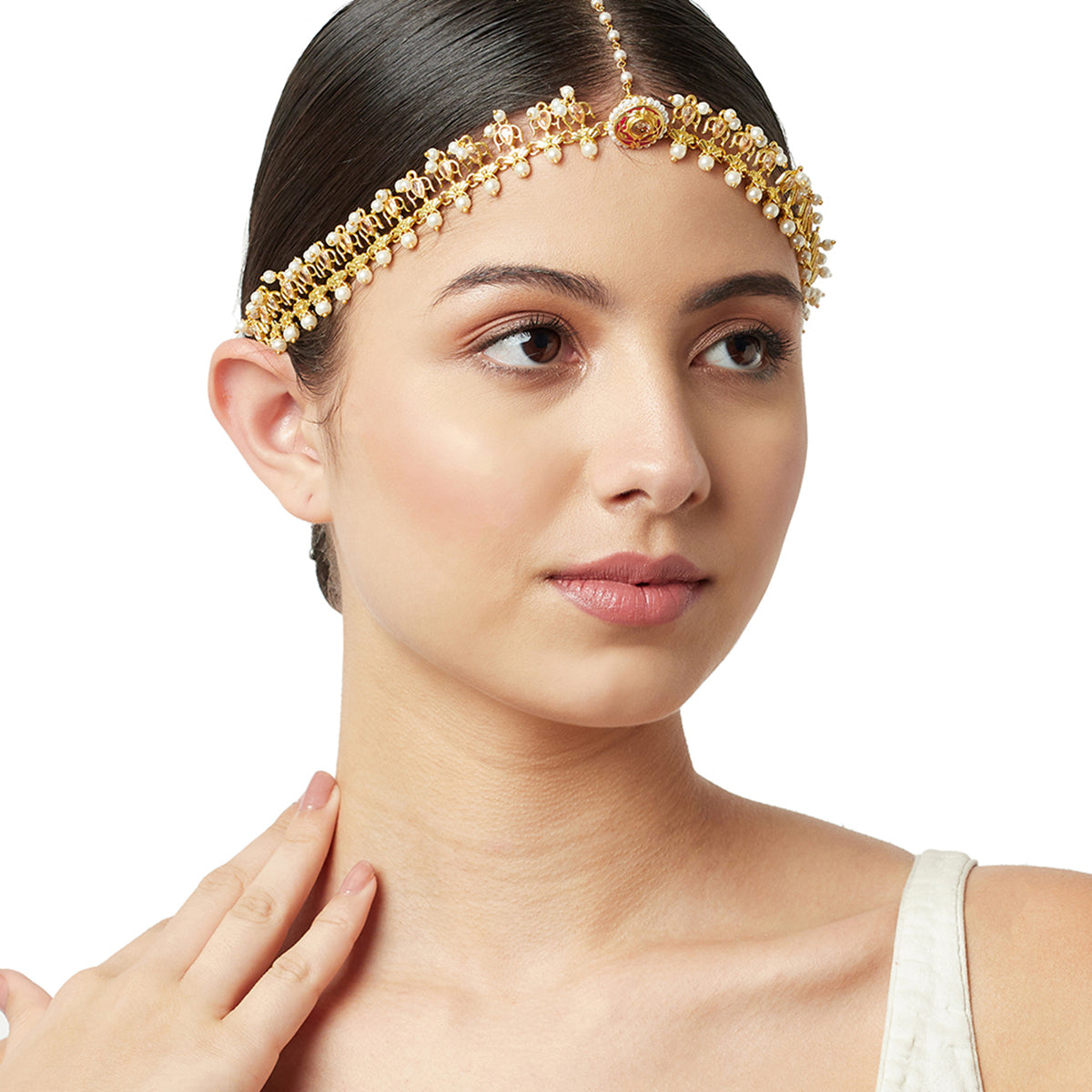 Faux White Pearls Embellished Brass Gold Plated Matha Patti Maang Tika