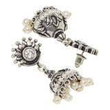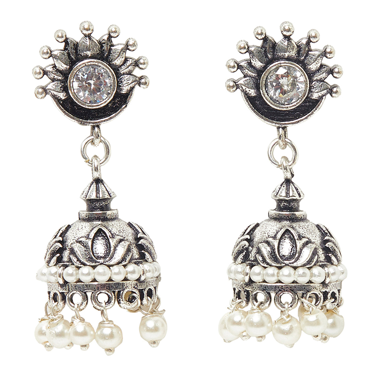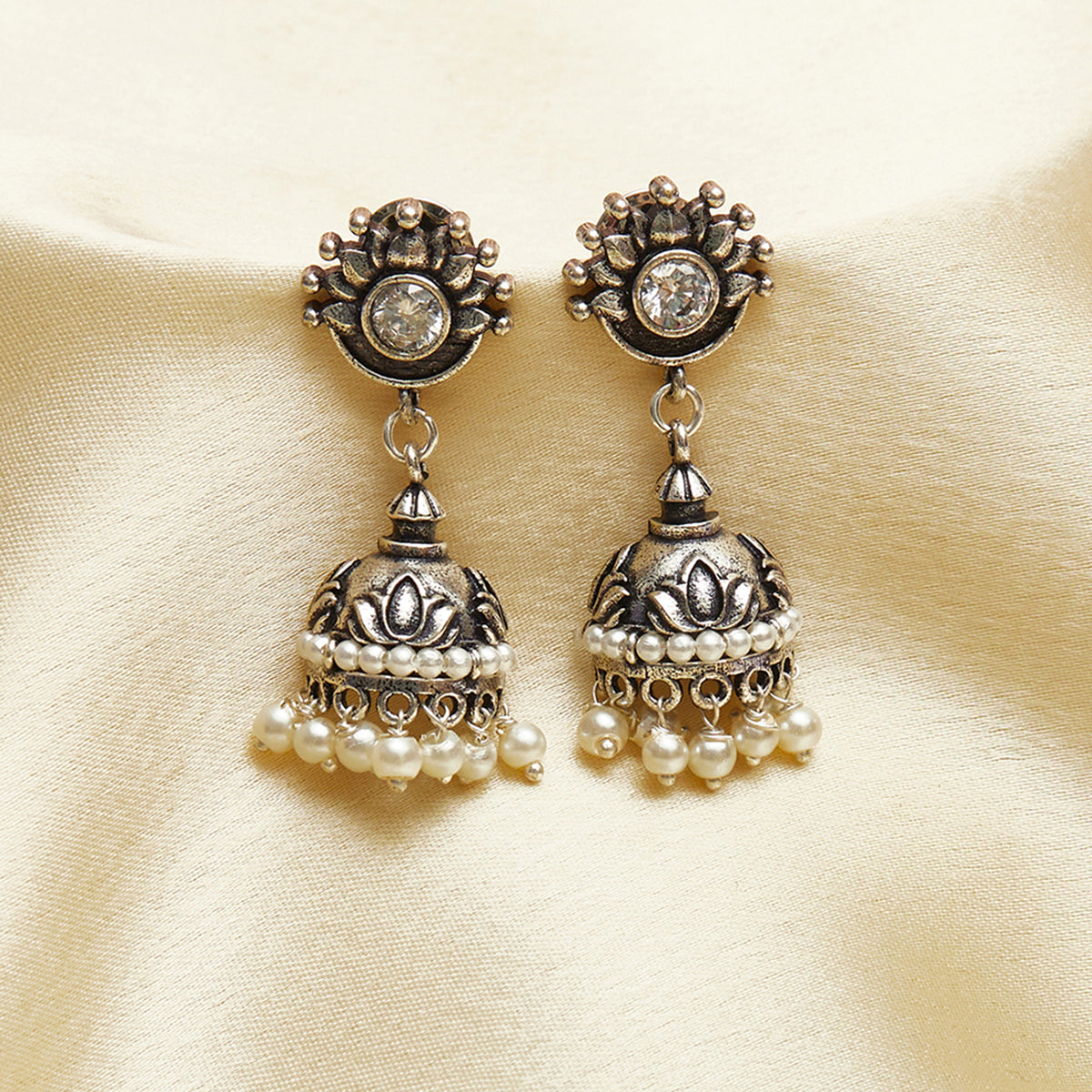 Faux White Pearls Embellished Brass Silver Plated Jhumka Earrings