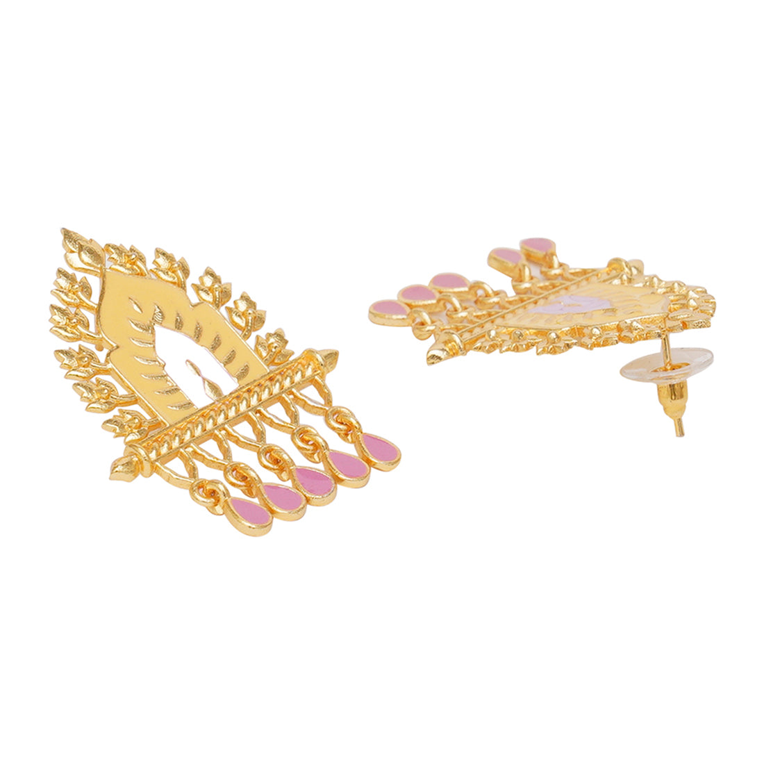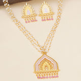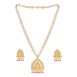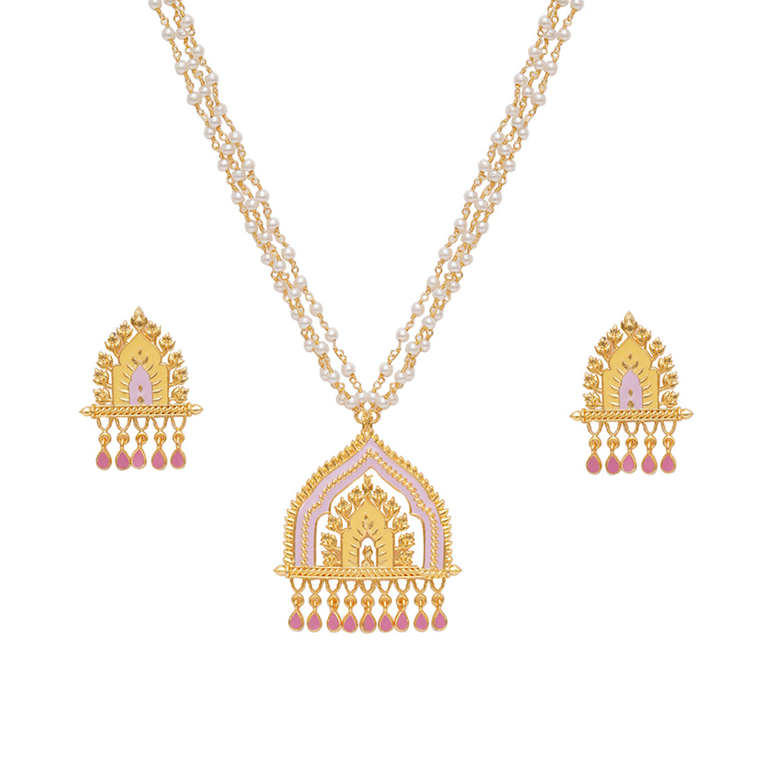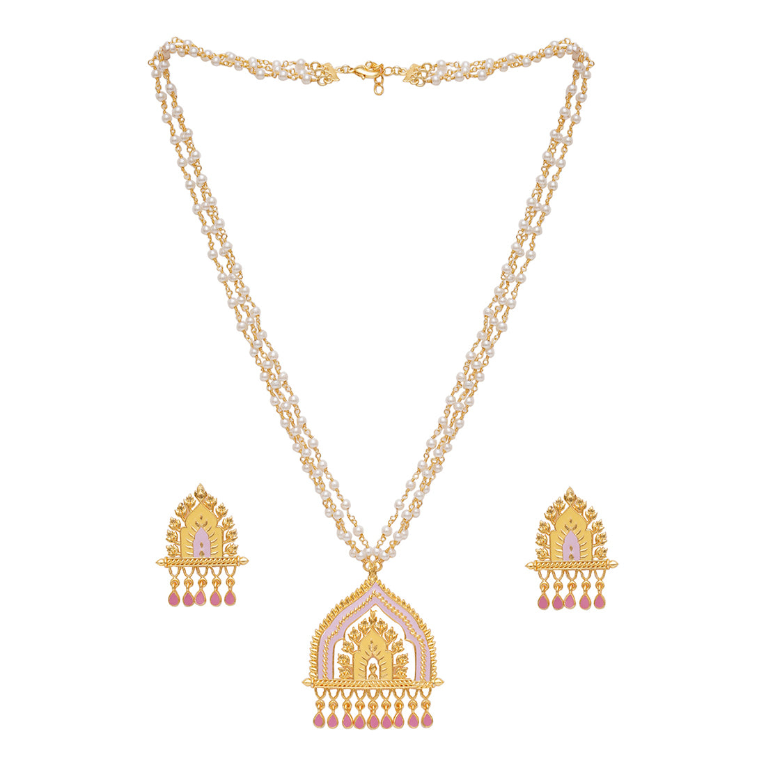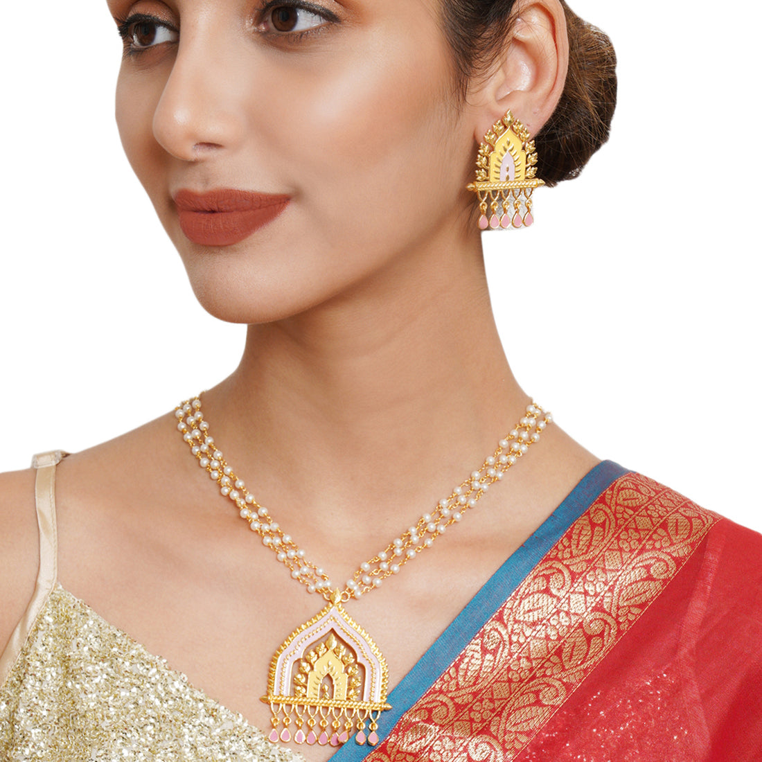 Embellished with lovely white faux pearls, this ethnic jewellery set has been fashioned out of brass. Yellow gold plating adds to the opulence of this charming set, which features enamelled details. The versatile set can be paired with Indian formal looks of all kinds.