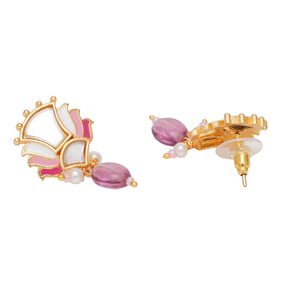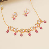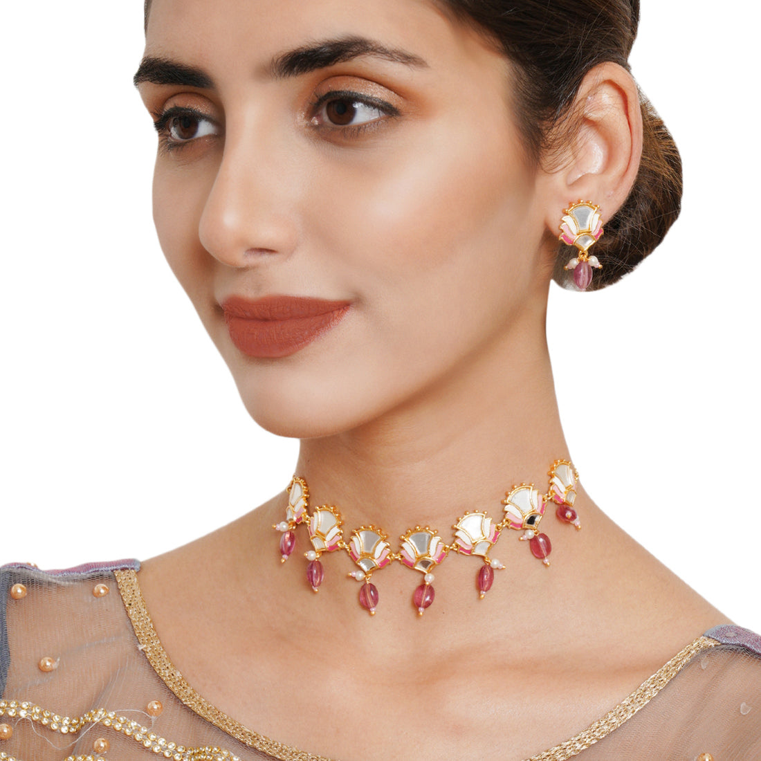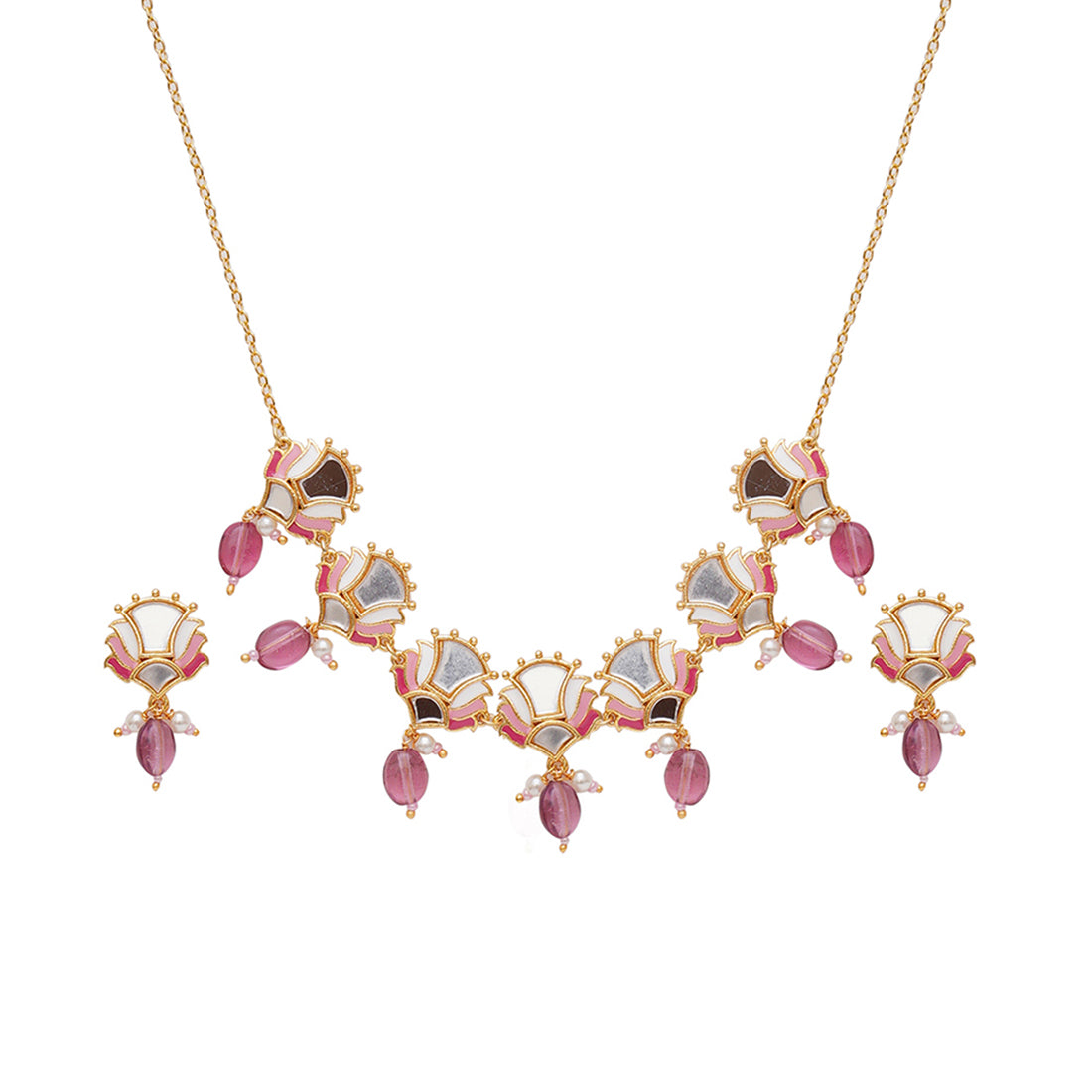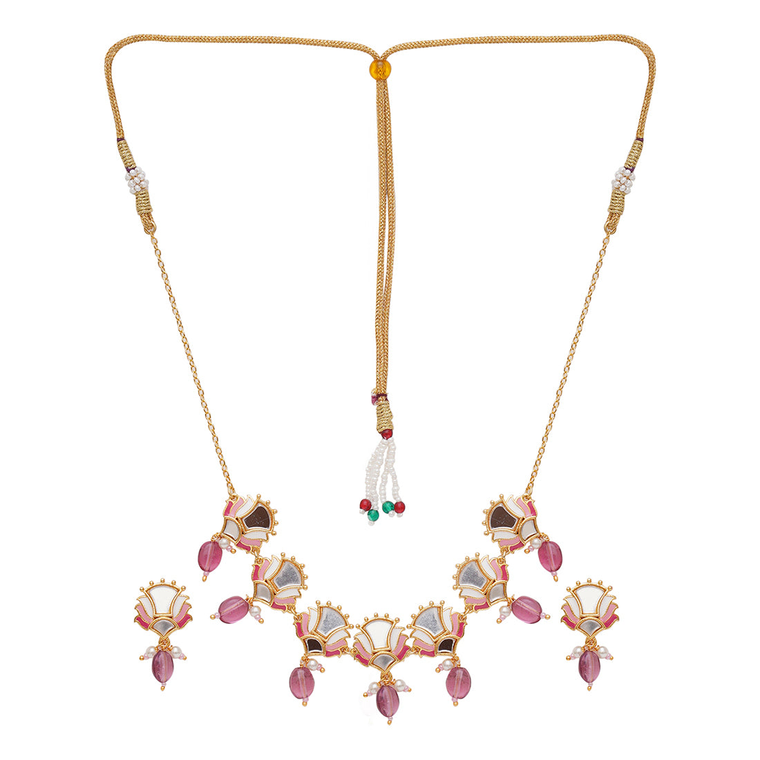 Fashioned from brass into delicate floral motifs, this jewellery set has been given a yellow gold plating and features mirror work details. The enamelled choker necklace and matching earrings are lightweight and comfortable. Pair with any of your favourite Indian or Indo