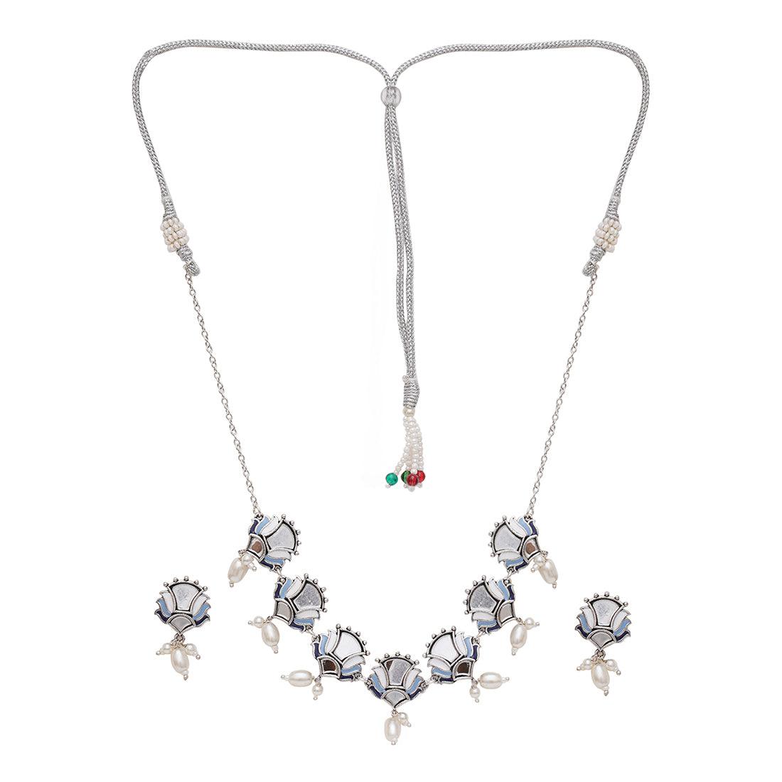 Crafted from brass into delicate floral motifs, this oxidised silver plated jewellery set is lightweight and comfortable. Enamelled and featuring mirror details, the set will make a good addition to your jewellery collection. Versatile enough to be paired with just about everything.