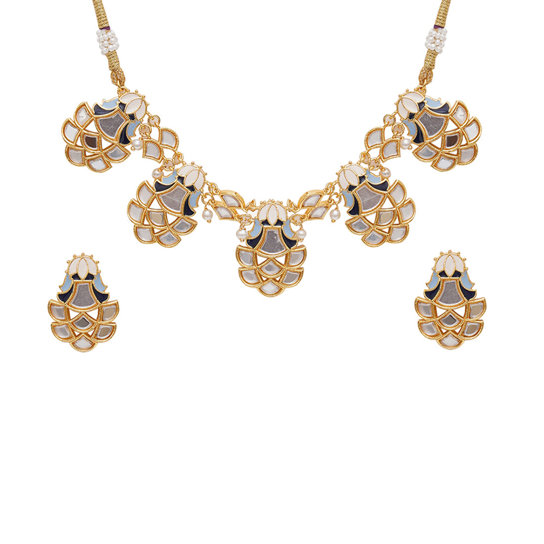Jewellery set with delicate mirror work and enamel details. Brass has been used in the making of the choker necklace and matching earrings. Pair the set with formal ethnic outfits or even Bohemian looks.