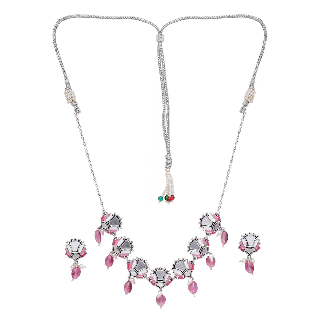 A lightly embellished jewellery set, fashioned from brass into floral motifs and lightly embellished. Oxidised silver plating and mirror details add to the allure of this set, which will add a definite sparkle to all your formal and casual ethnic and Boho looks.