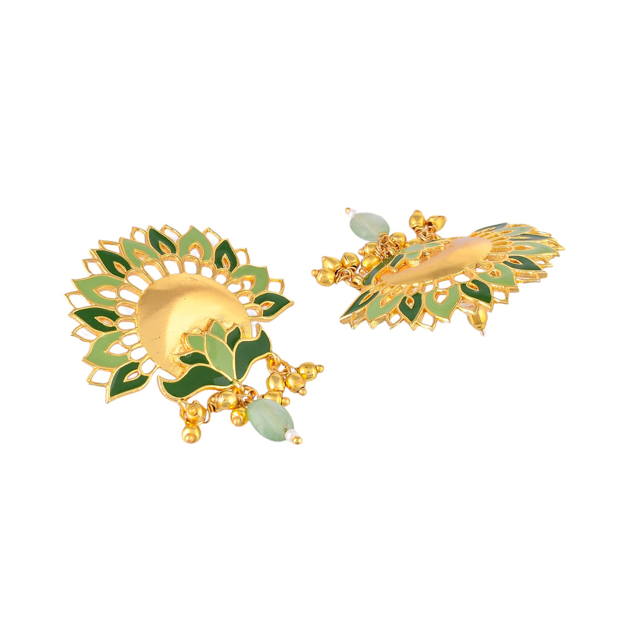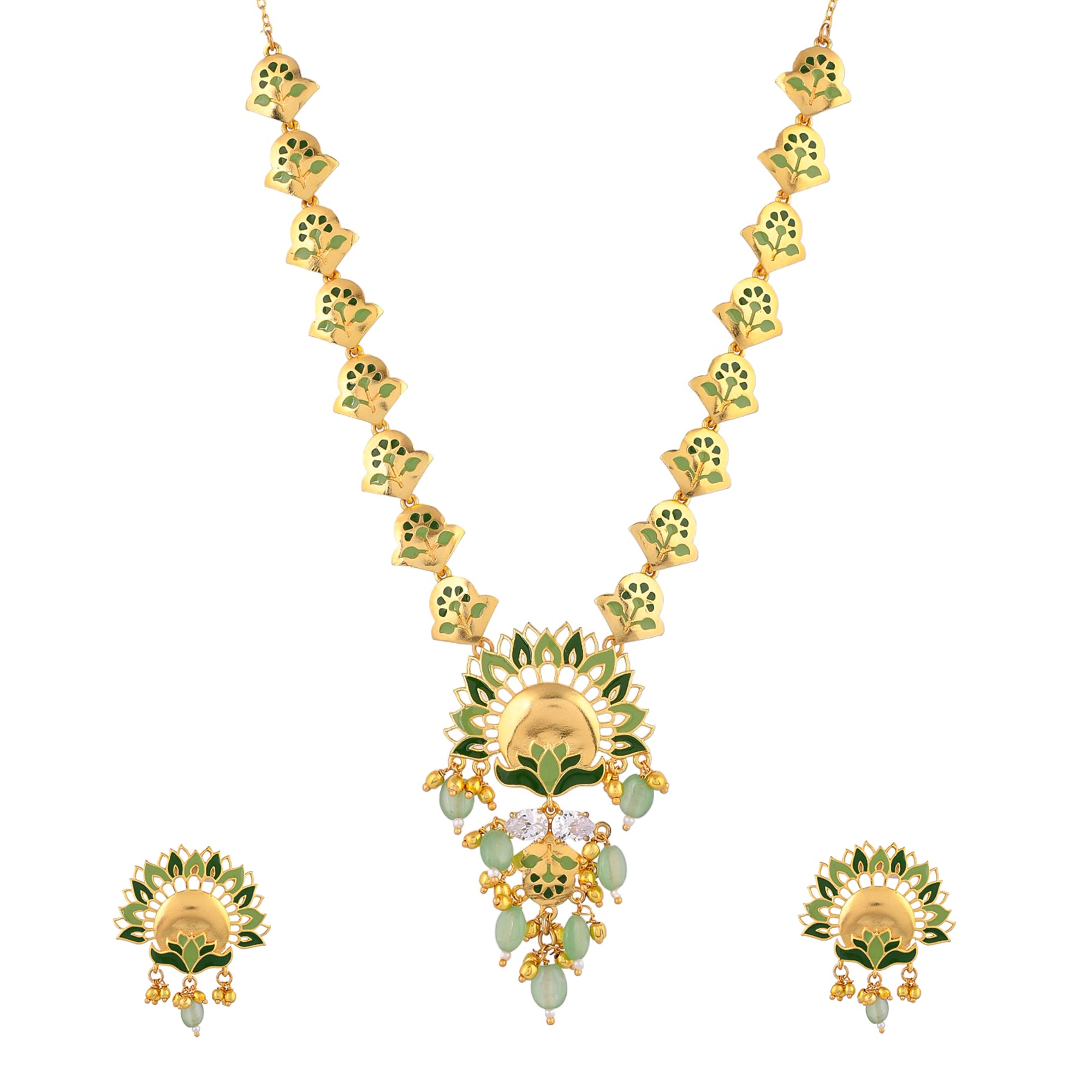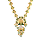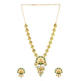 Go dressy and festive with the beauty of feathers and the divinity look added with the help of peacock colours. A masterpiece in artisanship, this necklace comes with an antique finish and beautiful earrings that are statement pieces of jewellery as well. Style Tip: Choose to wear this beautiful set on festive occasions or reserve it for the wedding of a special friend or family member.