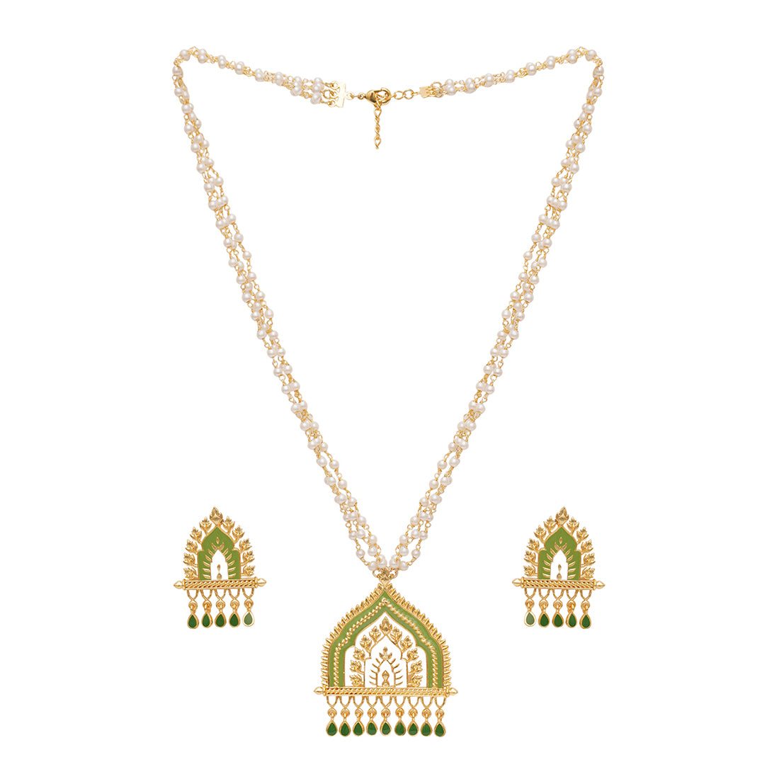 Festive Hues Pearls and Zircons Adorned Gold Plated Jewellery Set