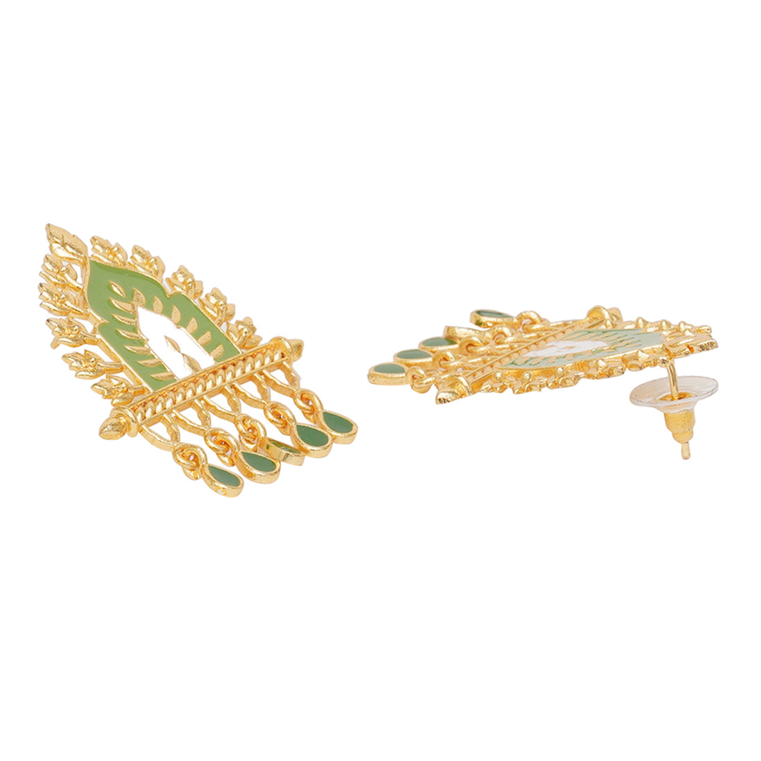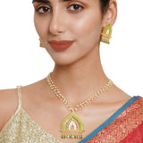 A classic temple jewellery set, fashioned out of brass and yellow gold plated. Faux pearls and zircon embellishments add to the opulence of this charming set, which is lightweight and comfortable. Versatile enough to be paired with formal Indian and Indo