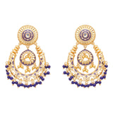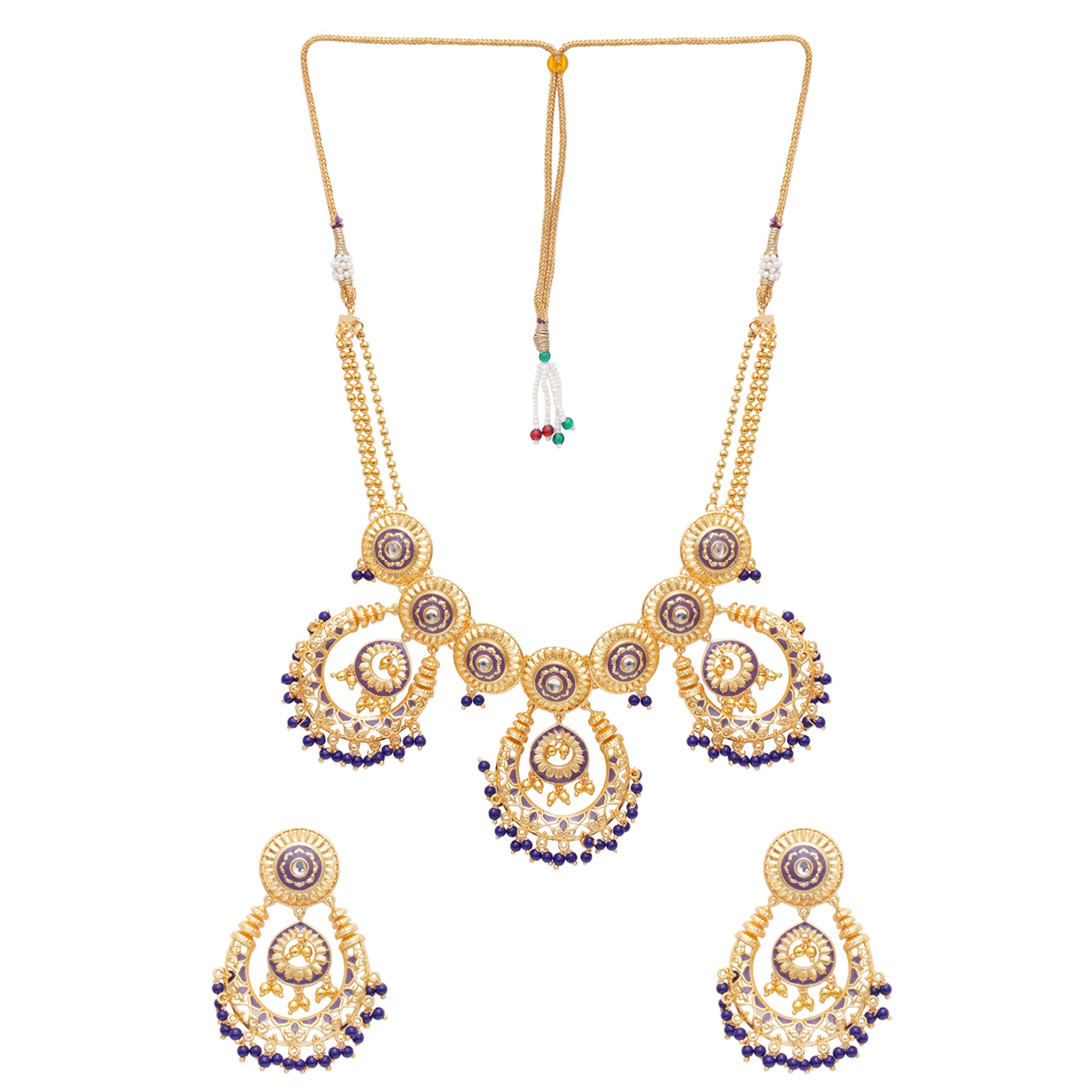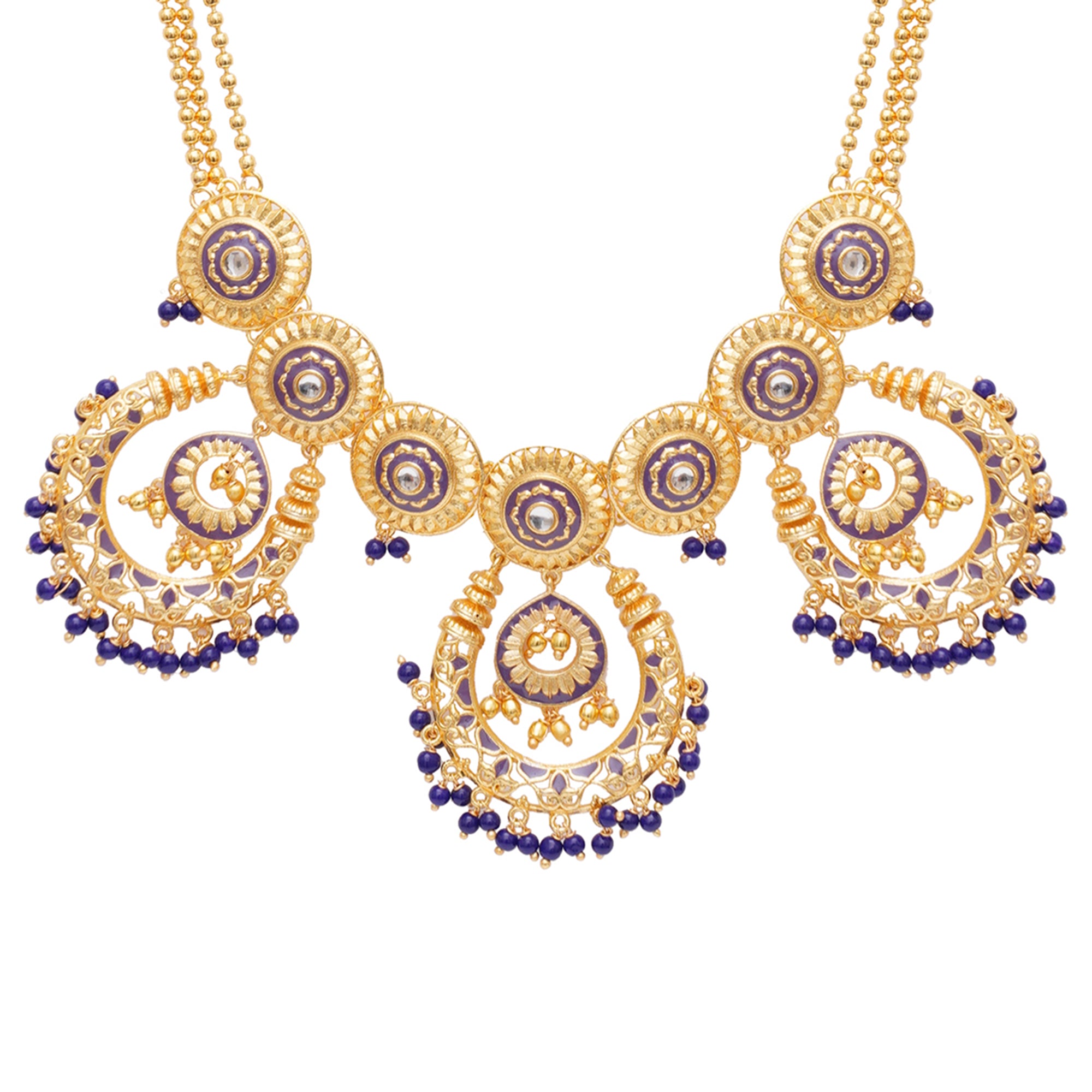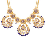Brass jewellery set with classic yellow gold plating and purple enamel. High polish gemstones adorn the necklace and drop earrings, which promise to be a comfortable wear at all times. Pair the set with a saree or ethnic skirt.
