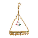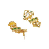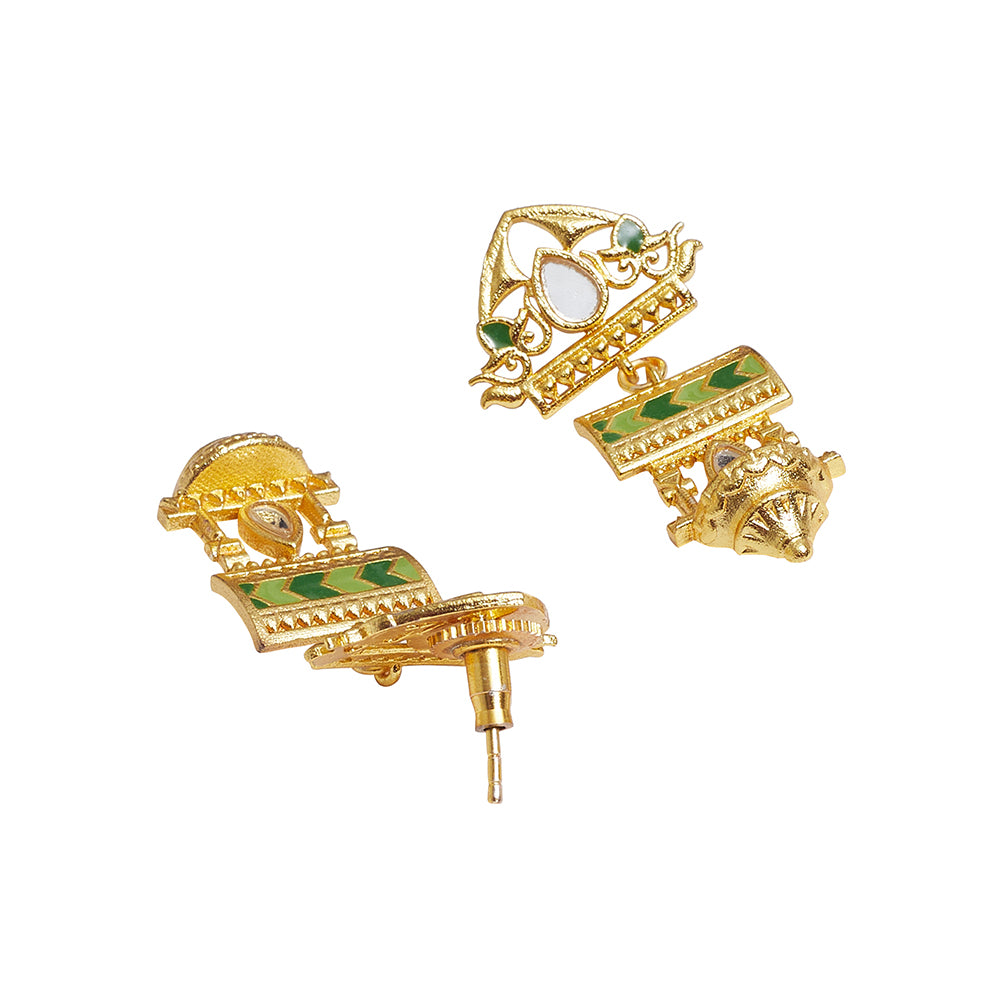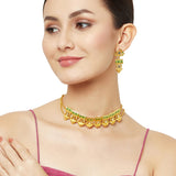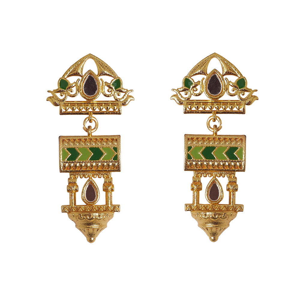 Dye gold plated classic jewellery set, inspired by traditional temple jewellery. The lightly embellished necklace and earrings have been fashioned out of brass and feature some delicate meenakari patterns. Pair the set with a silk saree.