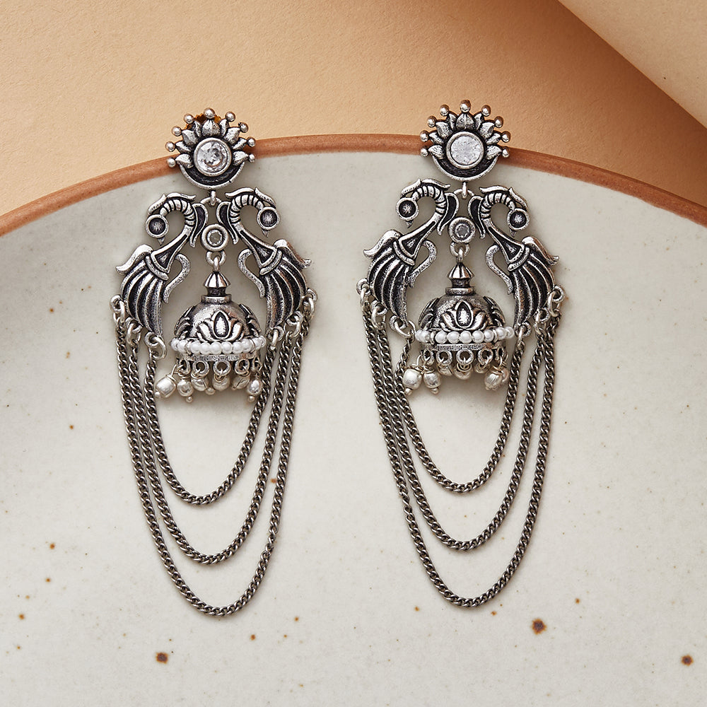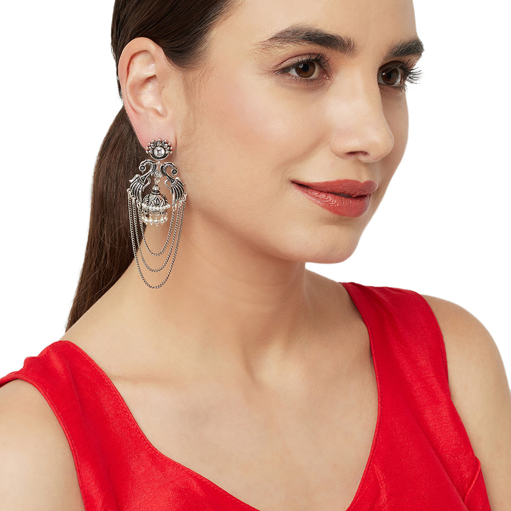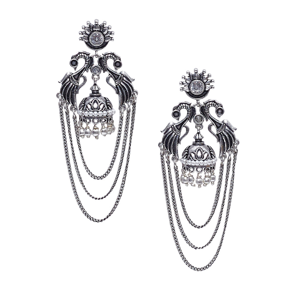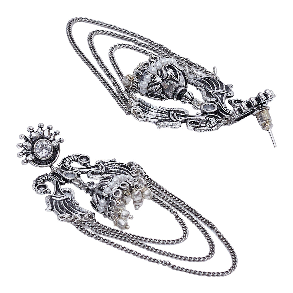 Festive Silver Tone Dangler Earrings With Pearl Beads