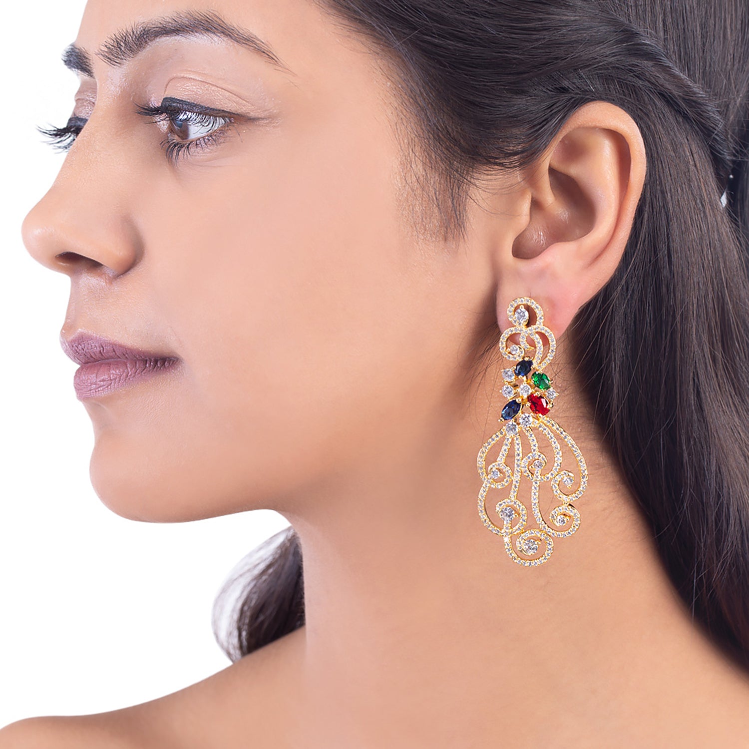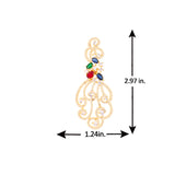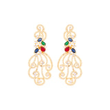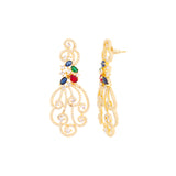 Drop earrings fashioned from brass into a classic filigree design. Embellished with zircon gemstones and yellow gold plated. Wear with a cocktail dress.