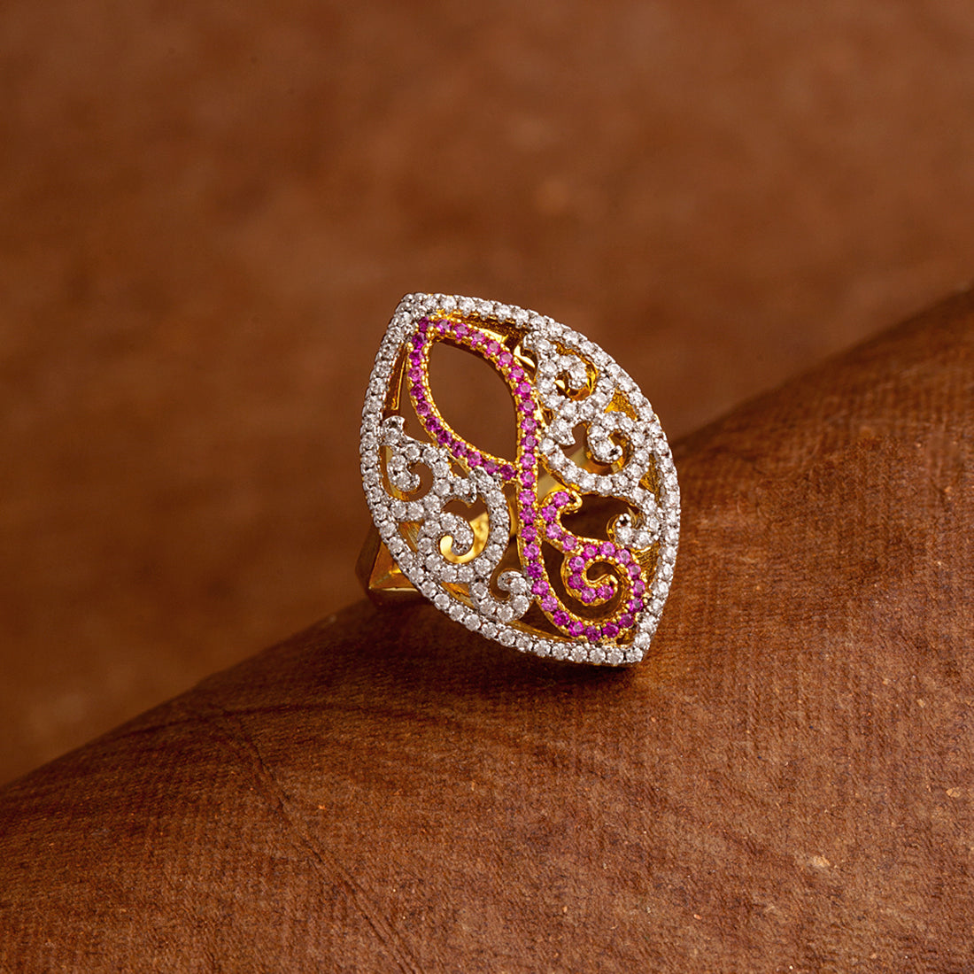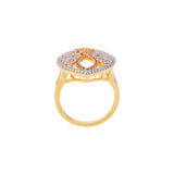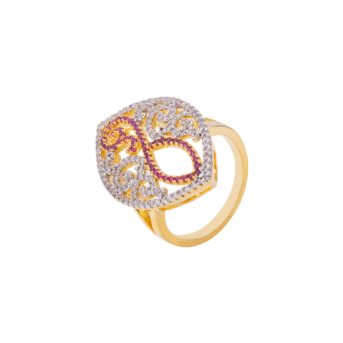 Filigree design statement ring with CZ gems. Made from brass and two tone plated. Pair with formal looks. This piece of jewelry comes with the Voylla assurance of quality and durability.
