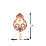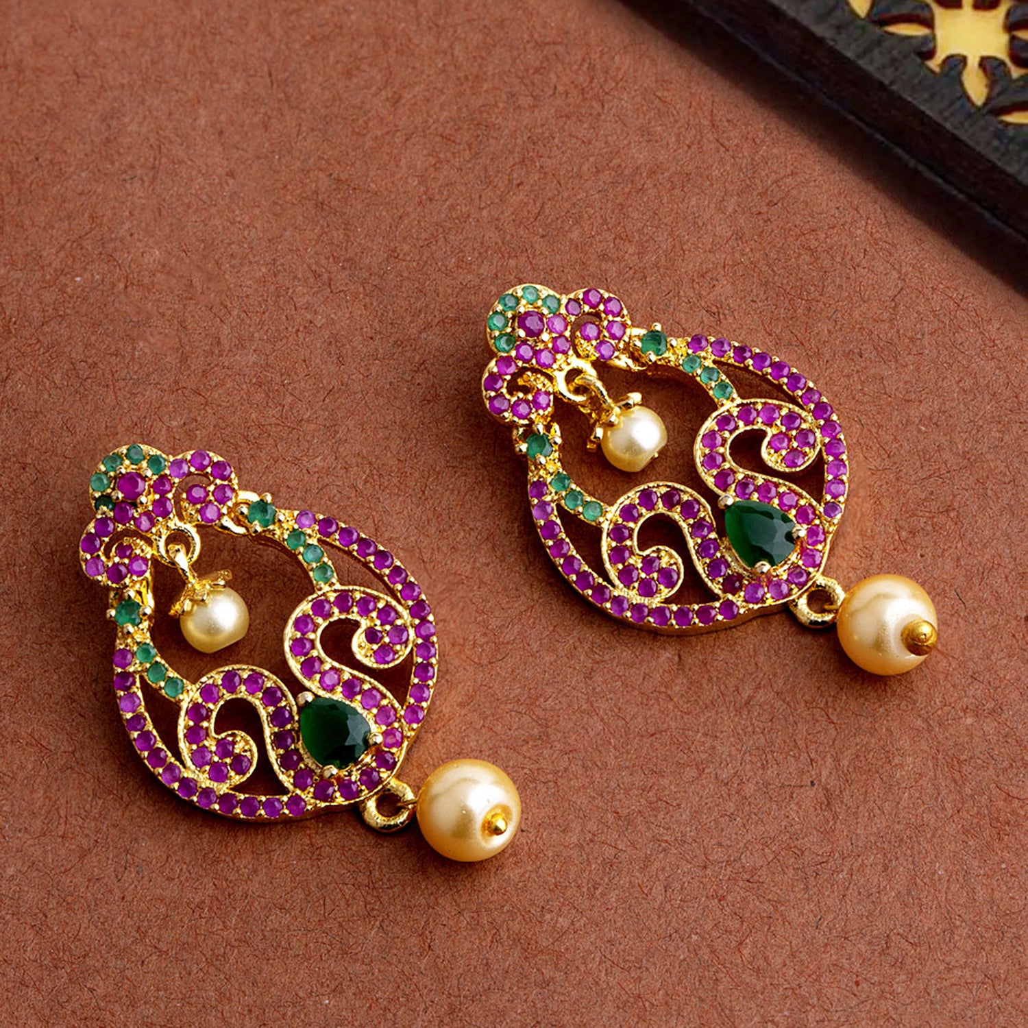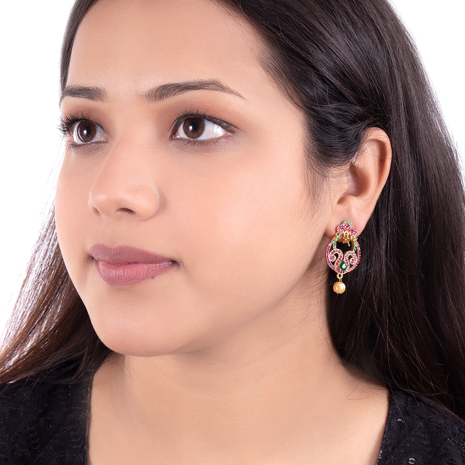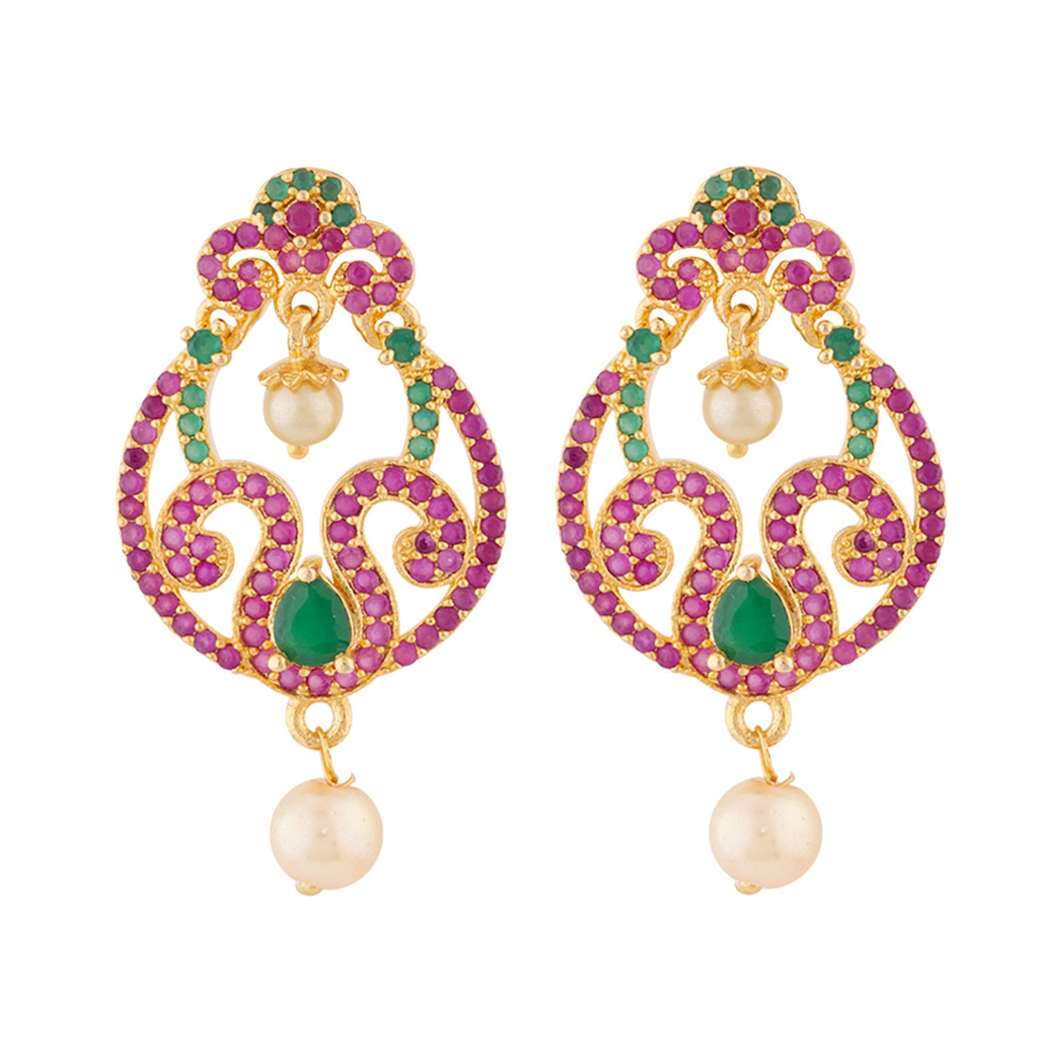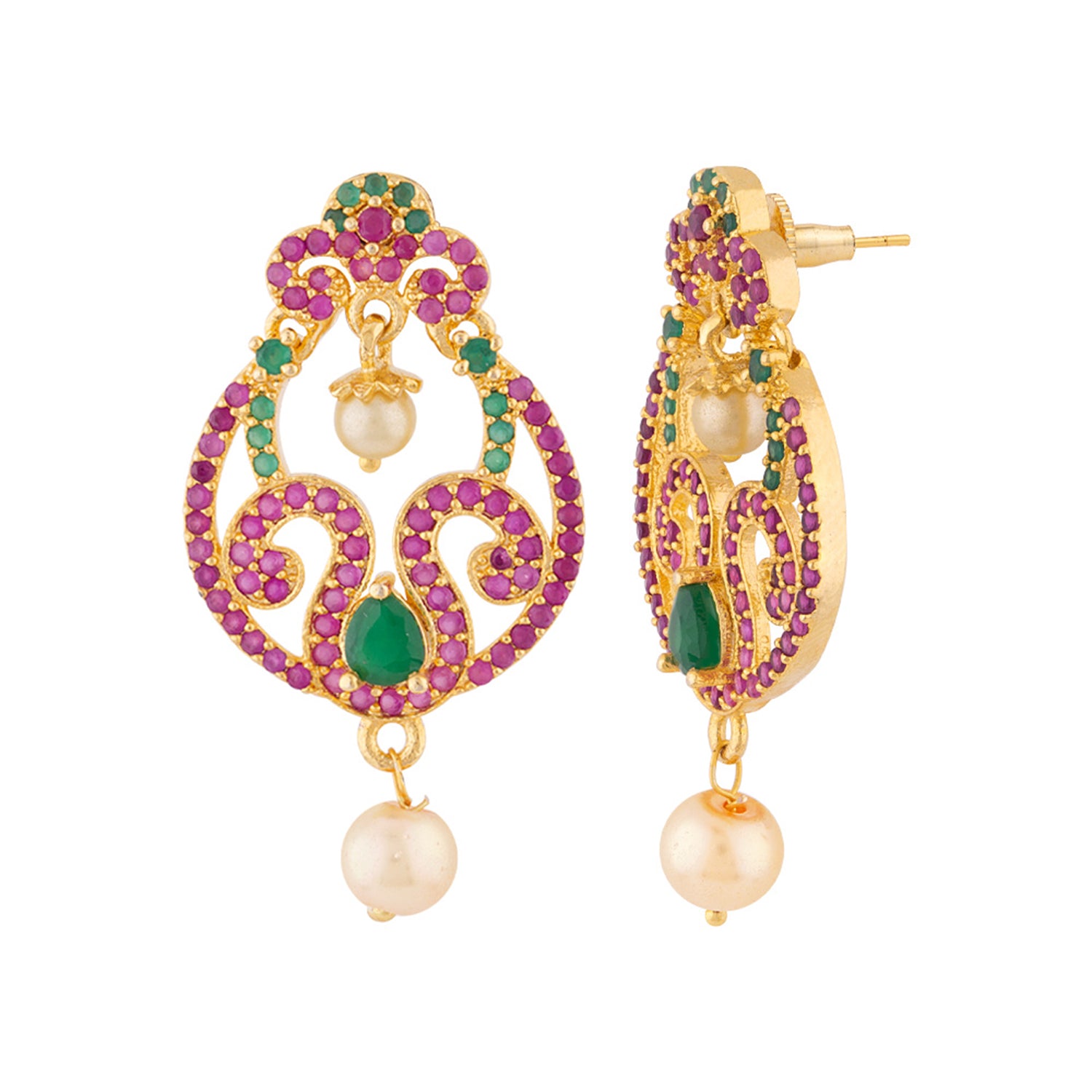 Ethnic earrings fashioned from brass into a filigree design. Faux pearls and American Diamond gems embellished, the yellow gold plated earrings are good for formal and casual wear.