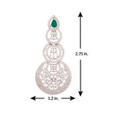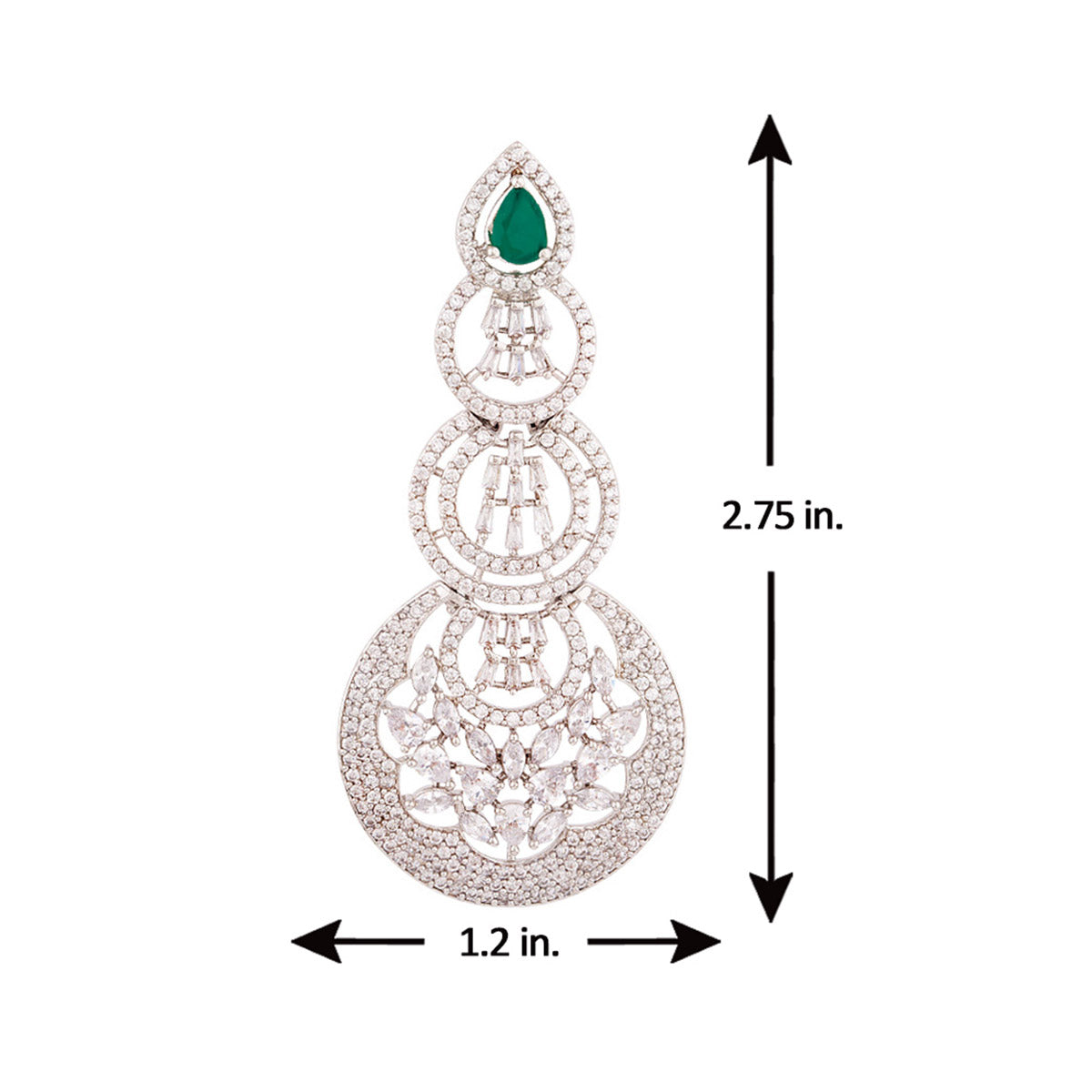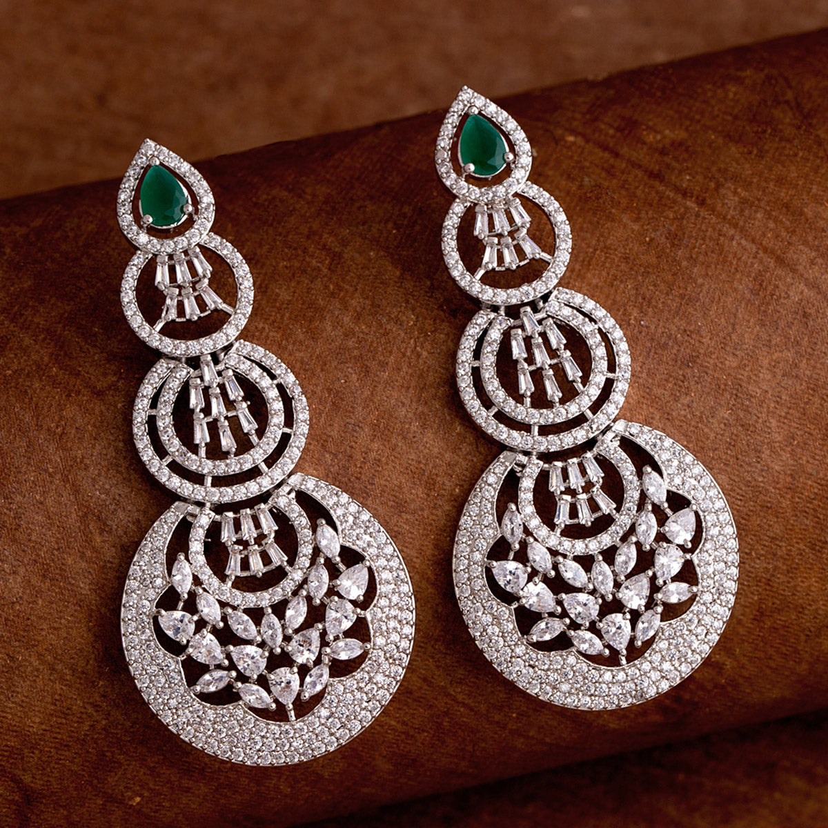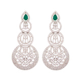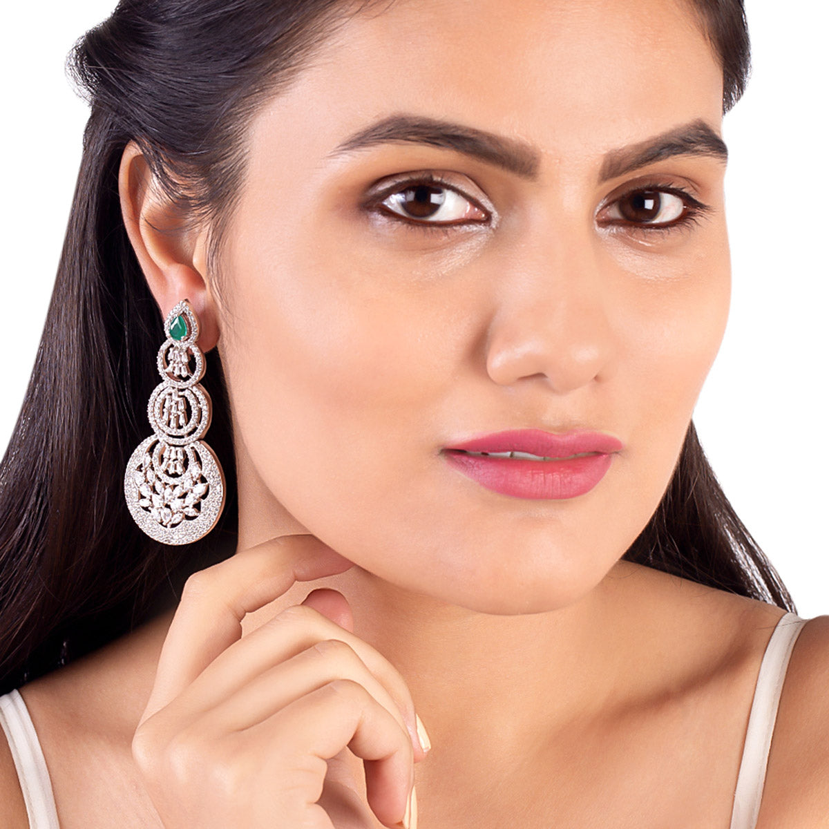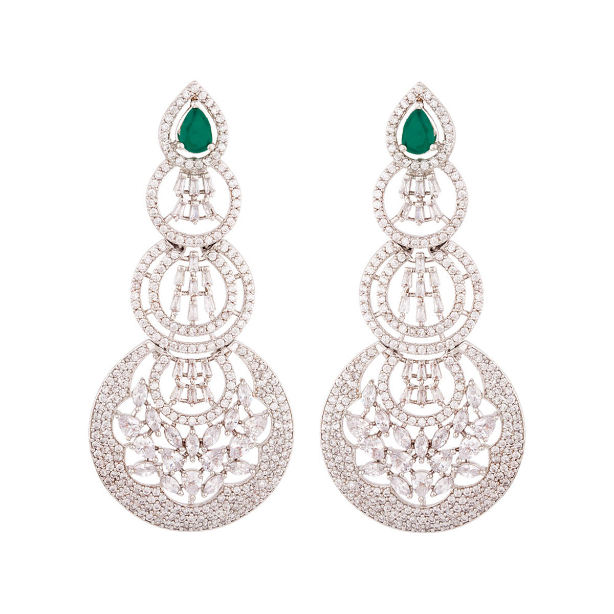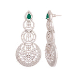 Filigree pattern layered drop earrings fashioned out of brass. Silver plated and American Diamond gems embellished. Pair with a cocktail dress.