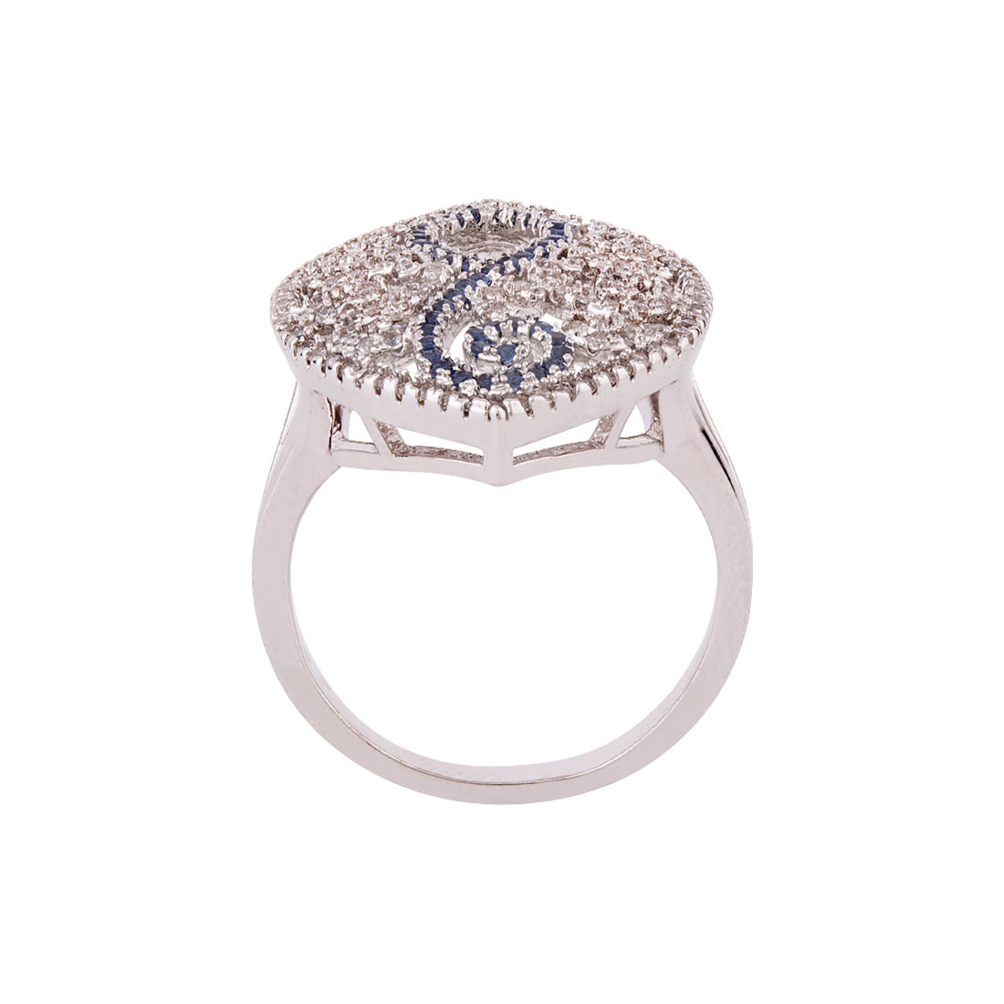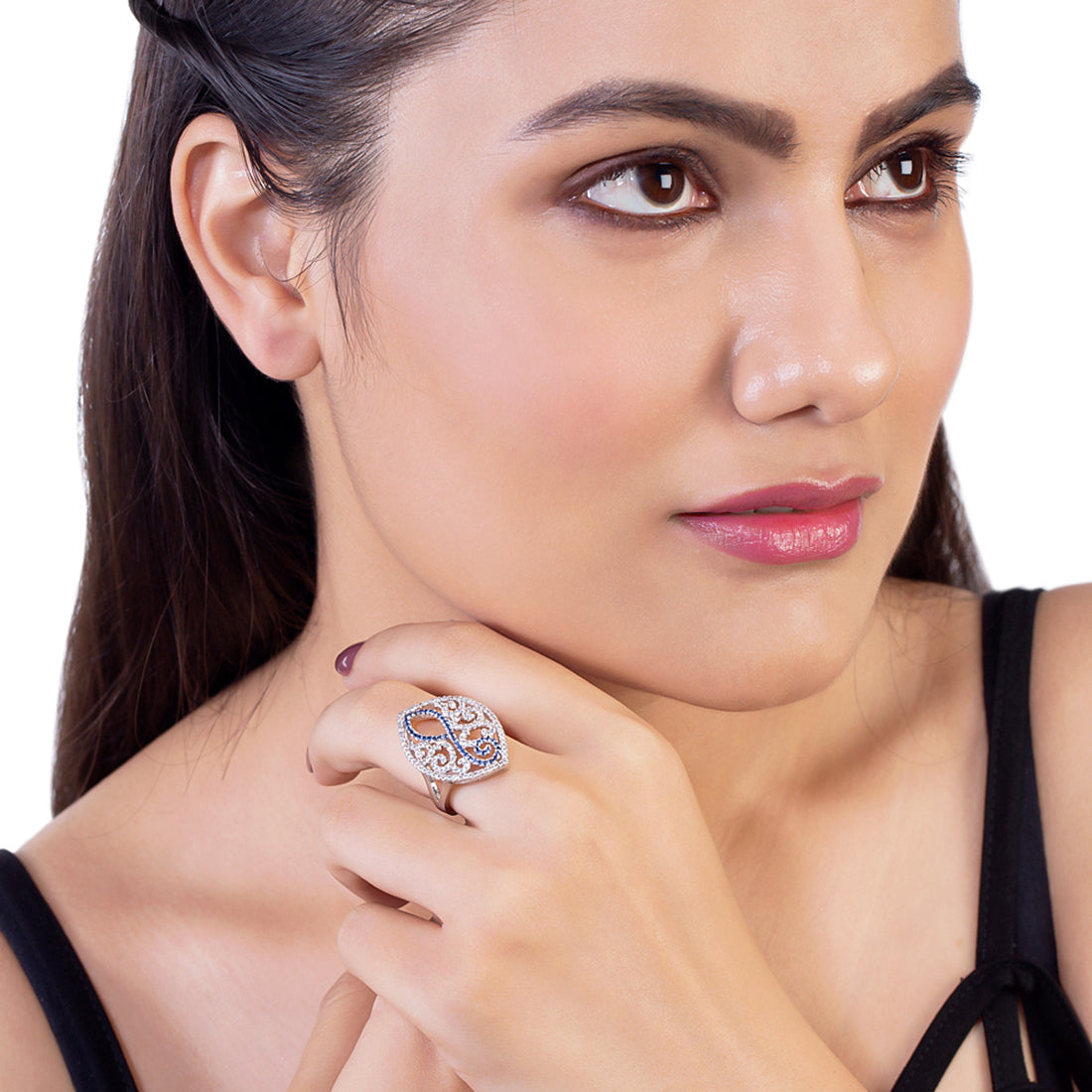 Filigree design brass ring with silver plating. Embellished with zircon gemstones and good for formal looks. This piece of jewelry comes with the Voylla assurance of quality and durability.
