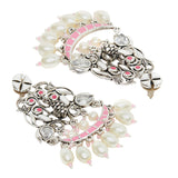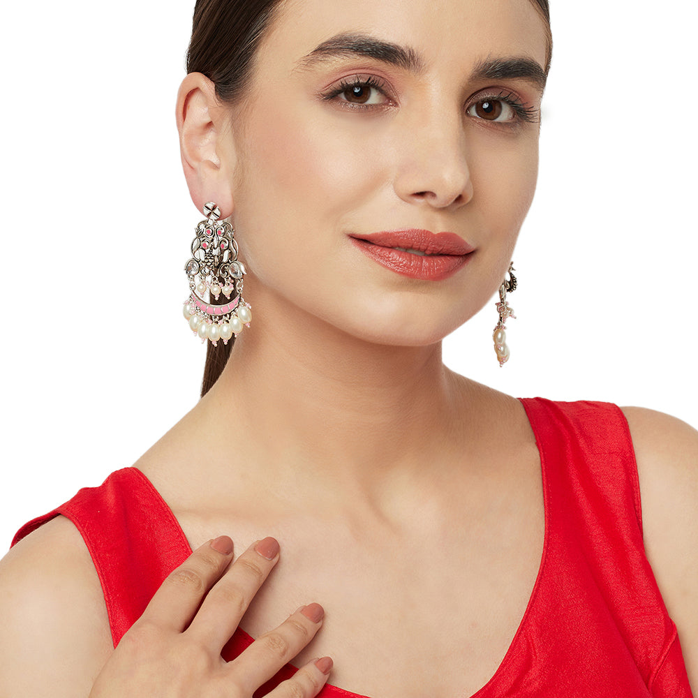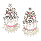 Crafted from brass into a classic filigree design, these silver plated earrings feature light enamel details. Embellished with white faux pearls, the earrings will look splendid when paired with a casual kurta or even a designer, understated saree.