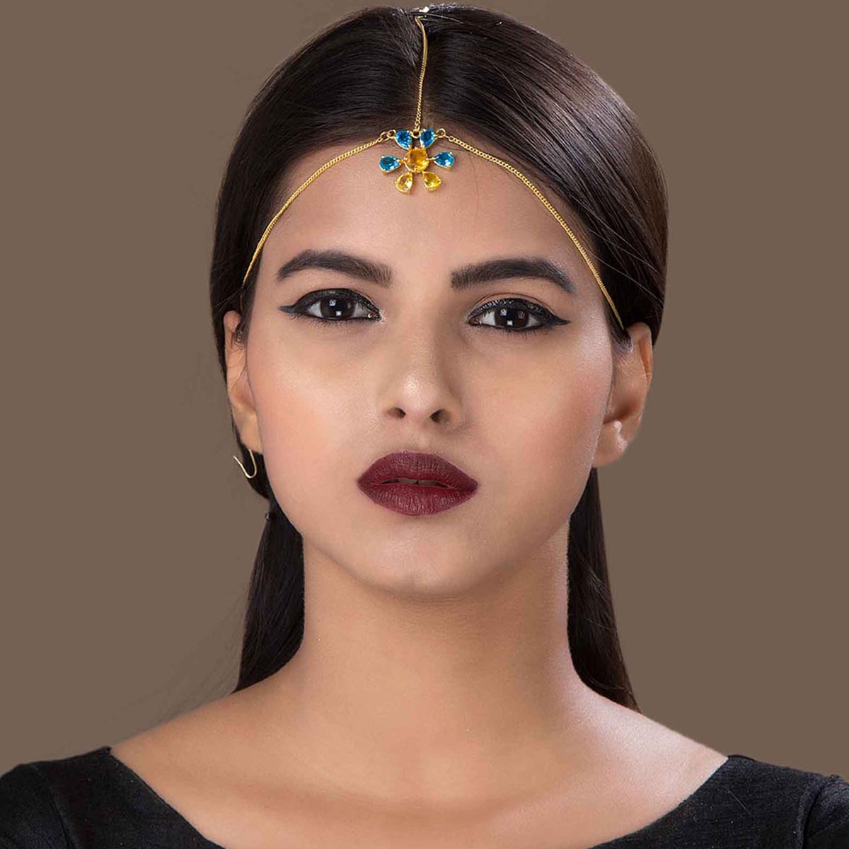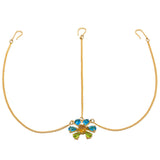 This alluring matha patti can be a perfect gift for your beloved. The brilliant gold tone and embellishment of blue green shiny stone just adds elegance to its appeal. A perfect ornament to adorn on a special occasion.