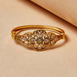 A traditional style bracelet for women, fashioned out of brass and embellished with faux kundan gemstones. Yellow gold plating adds to the charm of this piece, which can be paired with ethnic attire of all kinds.