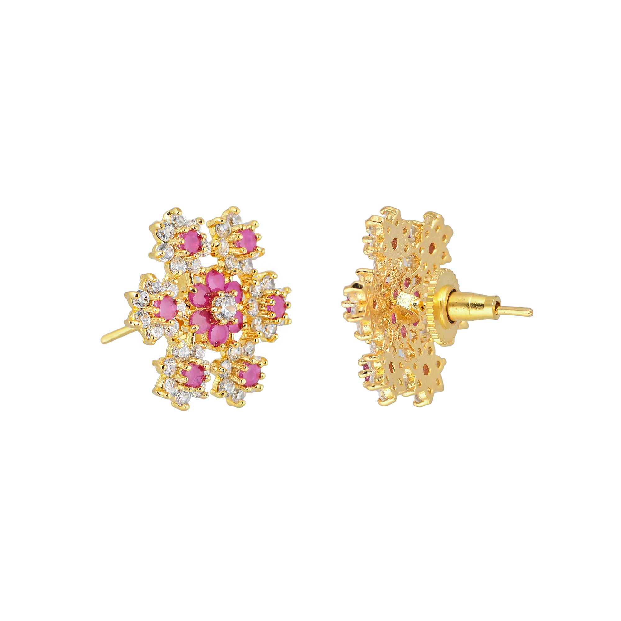 Floral bunch pattern brass stud earrings with round cut red zirconia gems. Gold plated and a good match for casual looks.