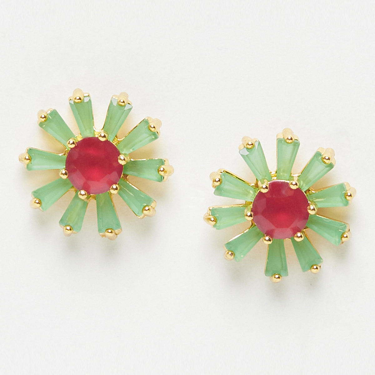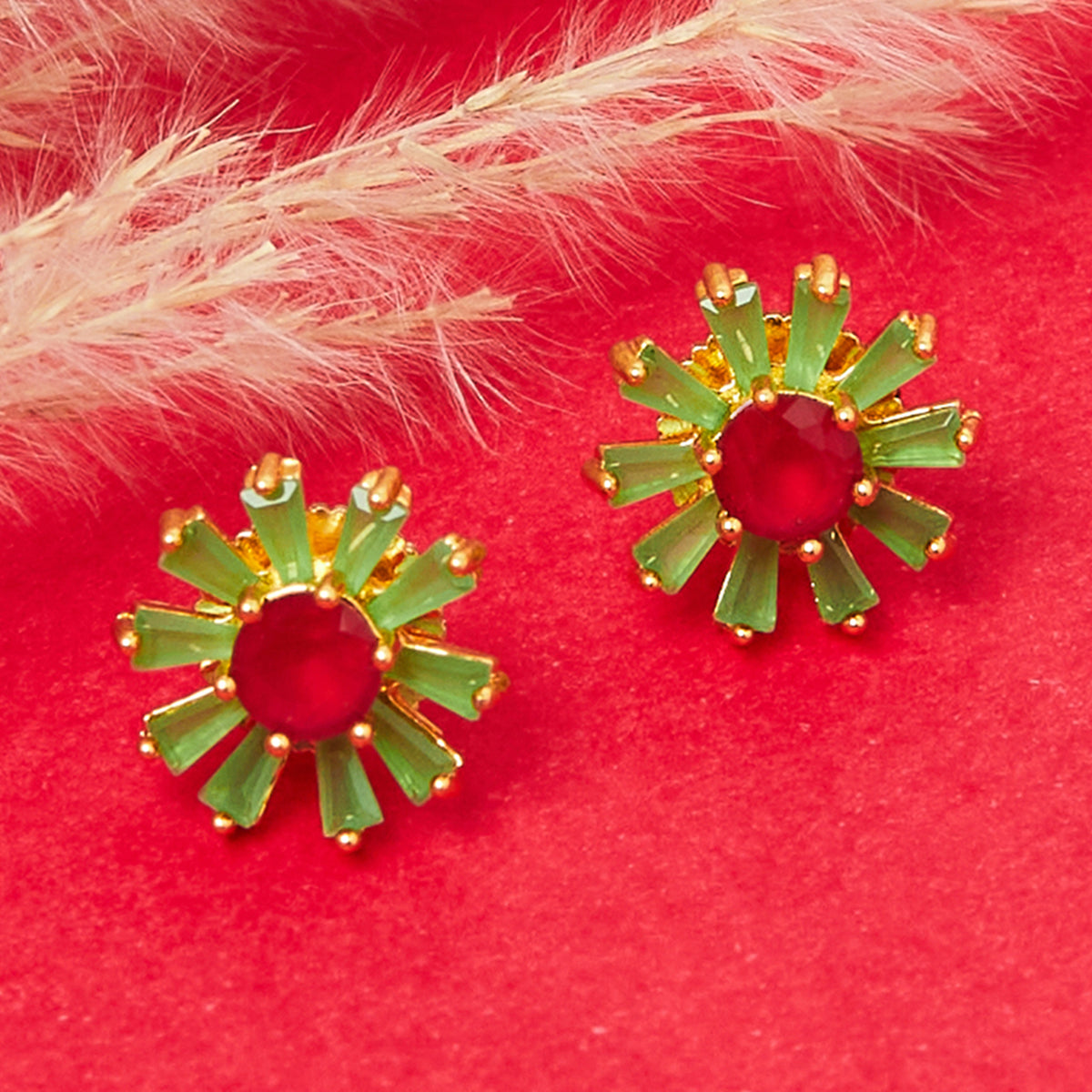 Coloured gemstones embellished floral earrings. Made from brass and yellow gold plated. Good match for ethnic attire.