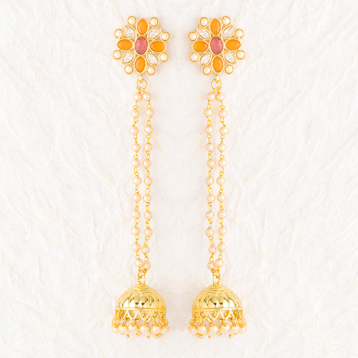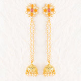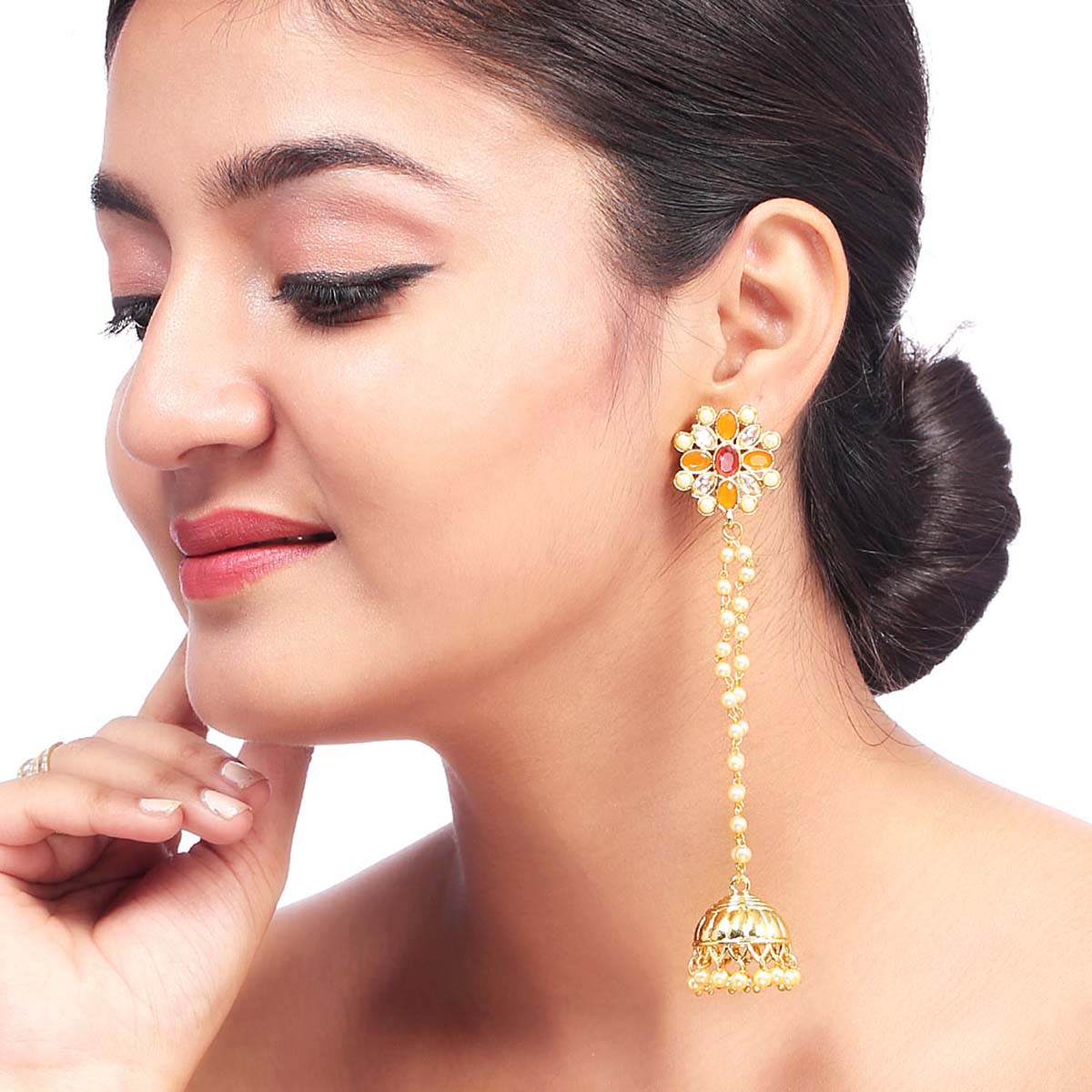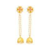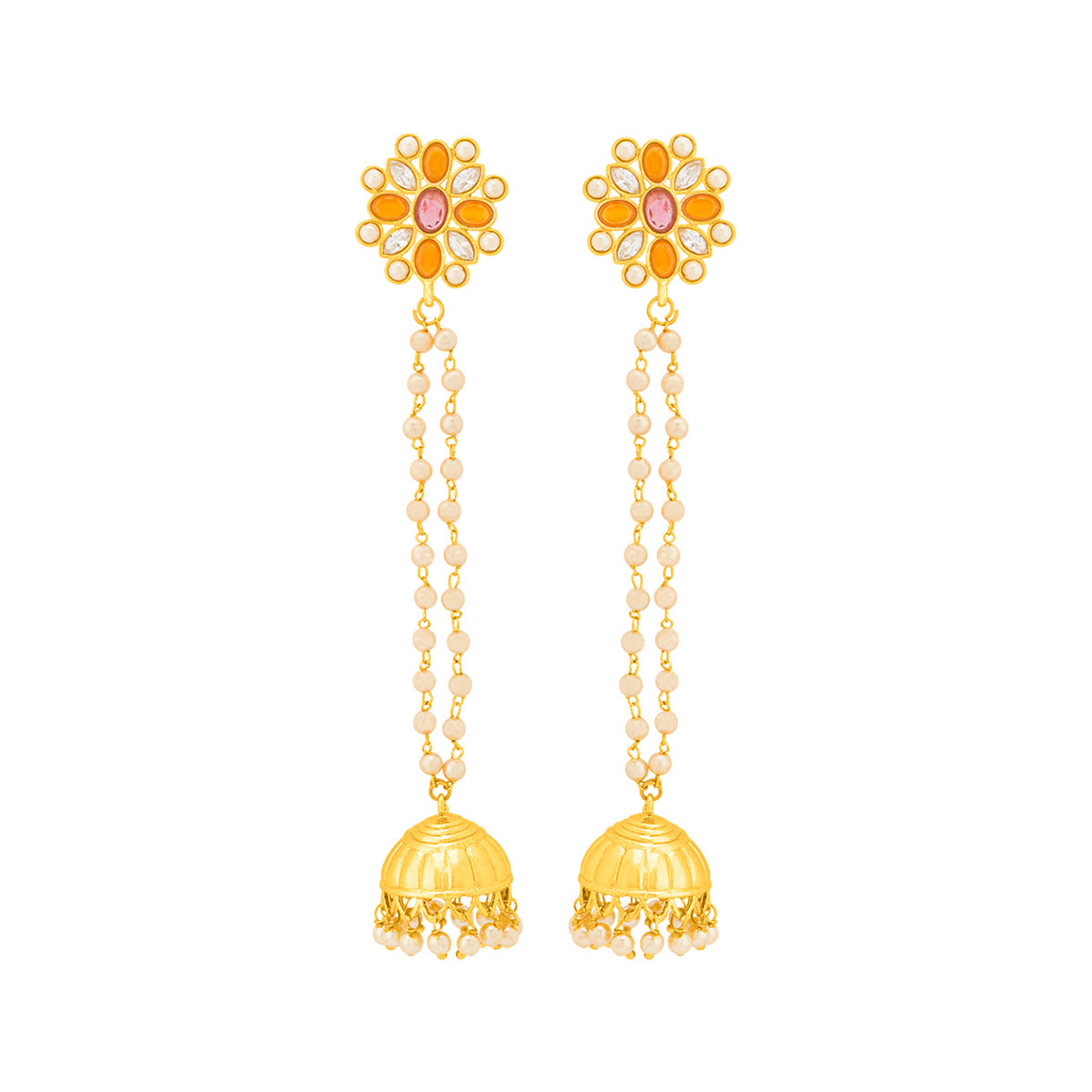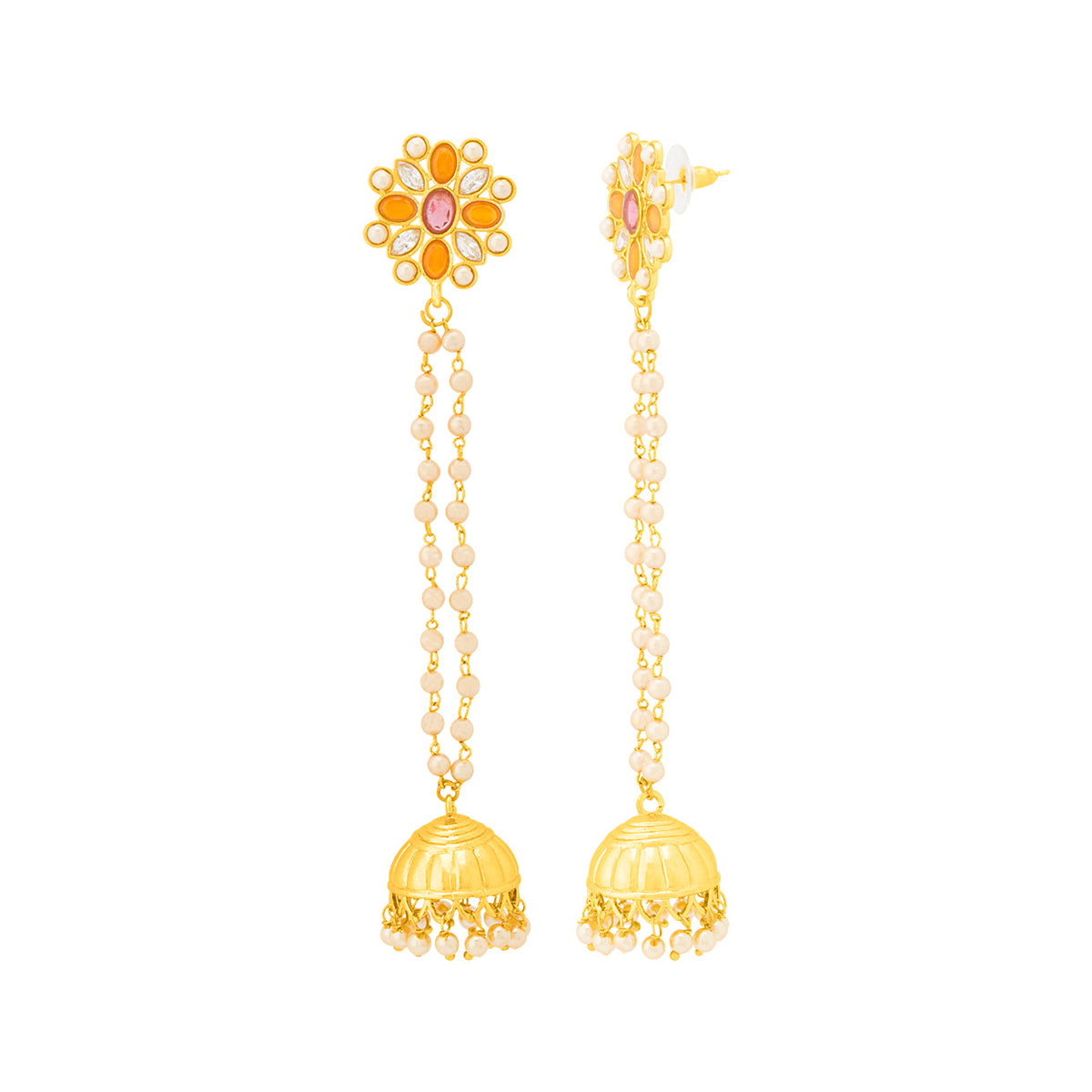 "Jazz up your style quotient with this beaded jhumkas from the house of Voylla. This pair of floral earrings adds a stroke of sparkling ethnic appeal to your look. Made from alloy, these yellow gold plated earrings are adorned with multicolored faux stones for added attraction.