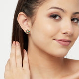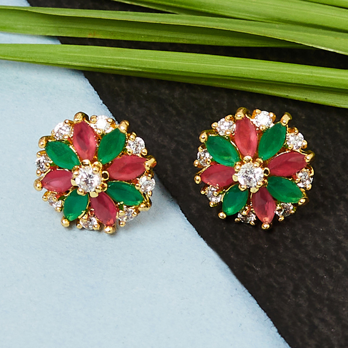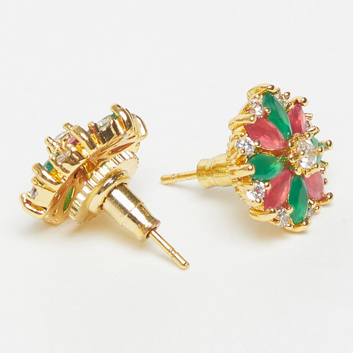A good match for casual outfits, the gems adorned floral earrings have been crafted from brass. Yellow gold plated for an authentic look.