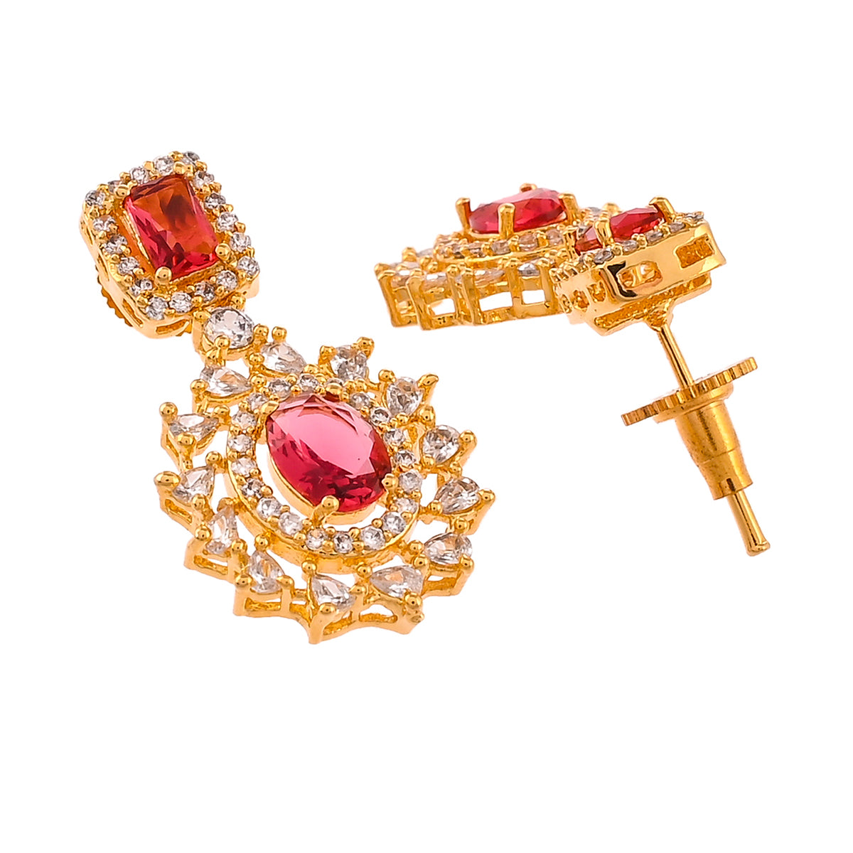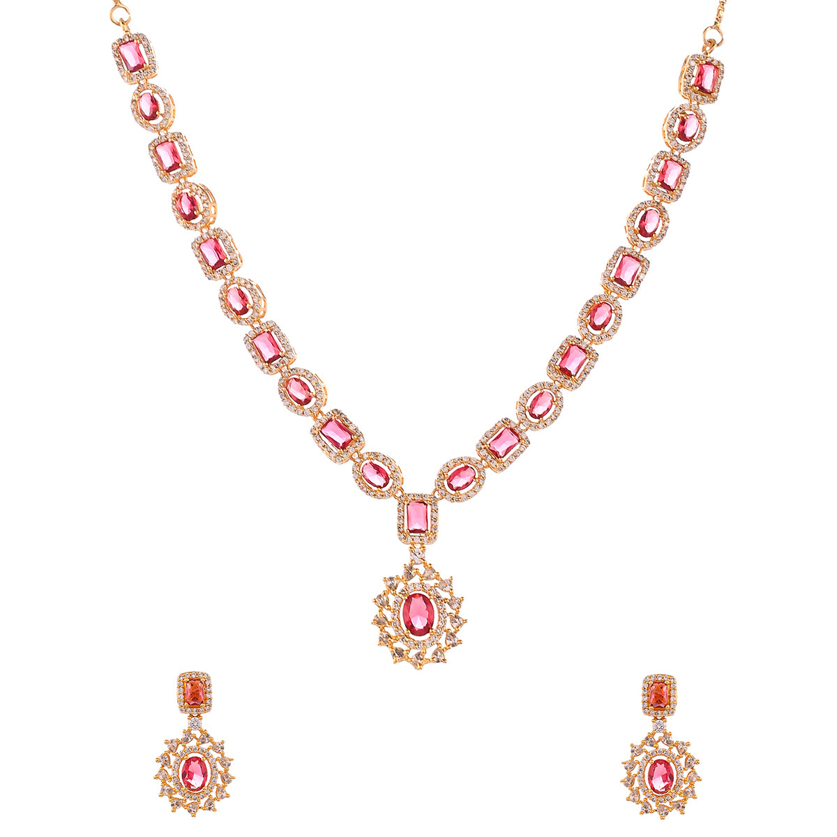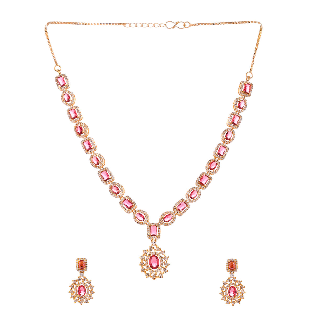 Teardrop cut zircon gemstones jewellery set. Made from brass. Gold plated necklace and drop earrings are lightweight and comfortable. Looks great to pair with a cocktail gown.