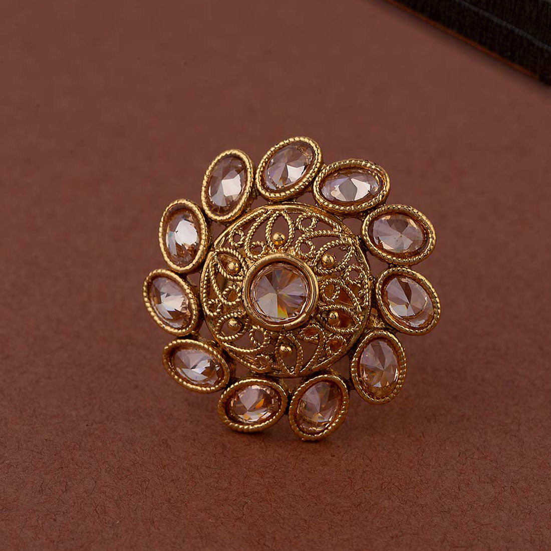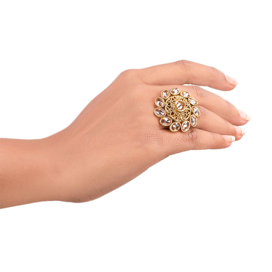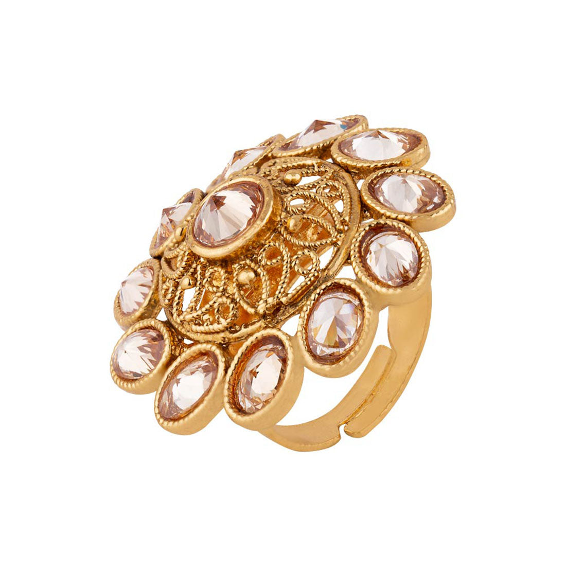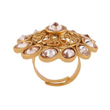 Floral motif brass ring with gemstone embellishments. Yellow gold plated, lightweight and comfortable.This piece of jewelry comes with the Voylla assurance of quality and durability.