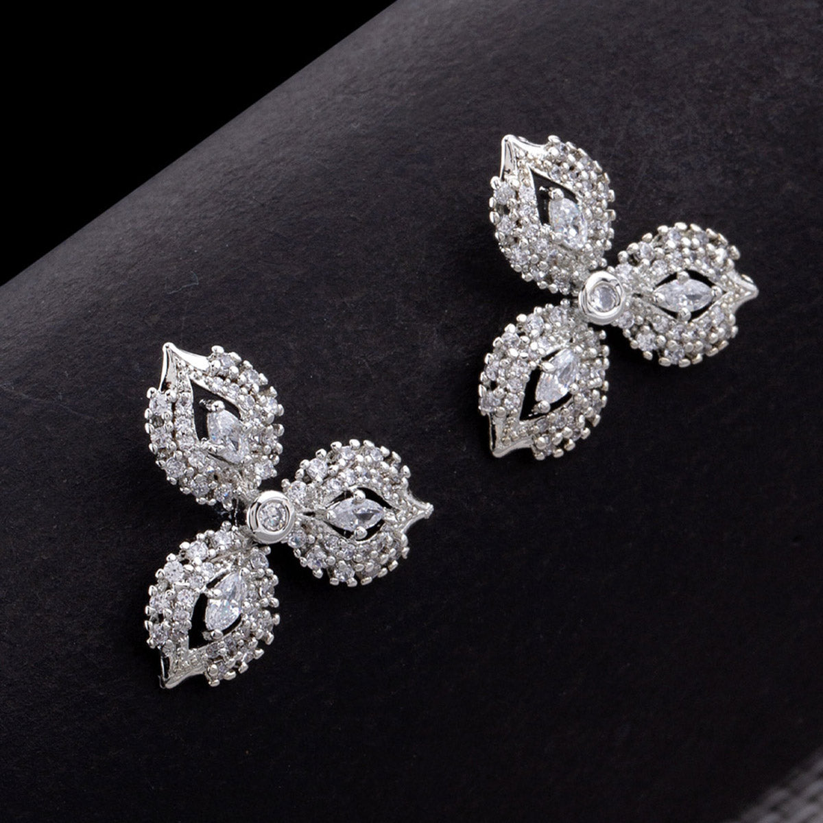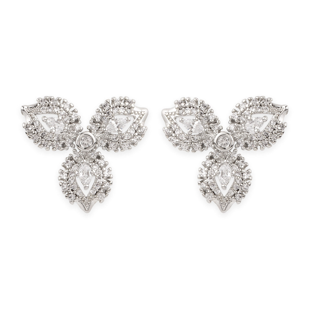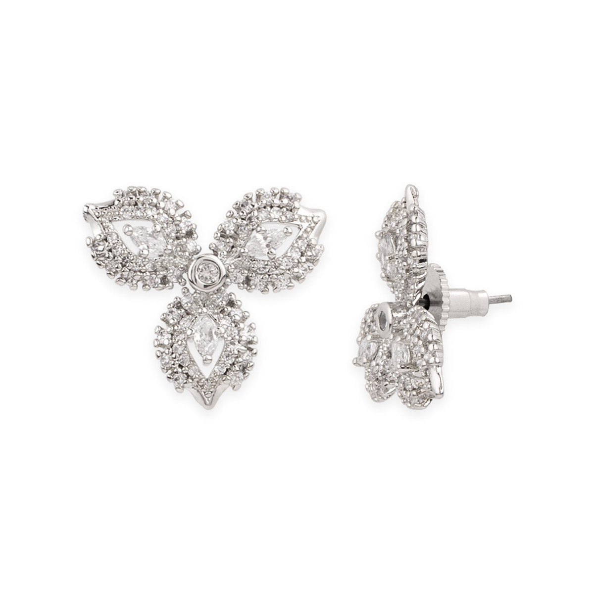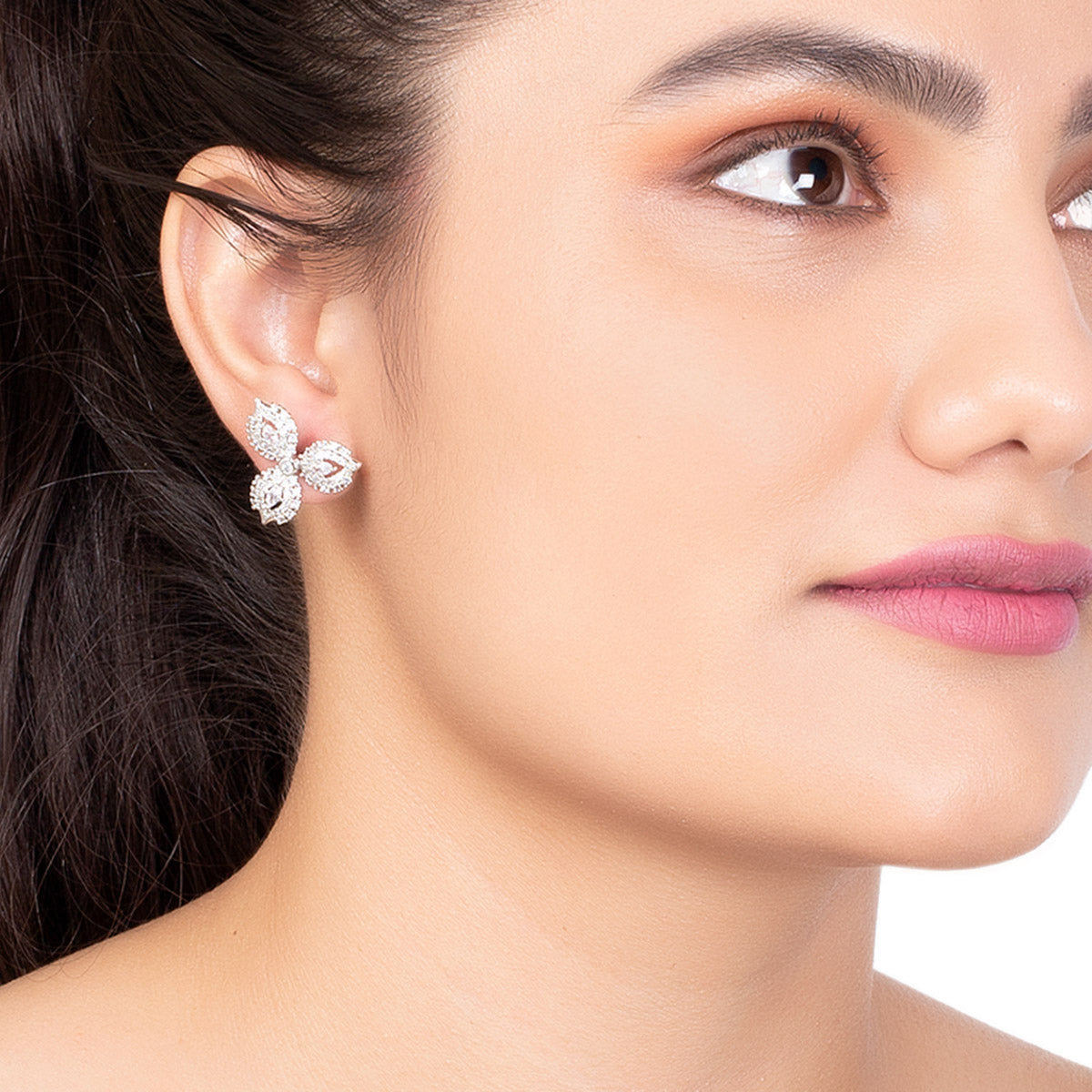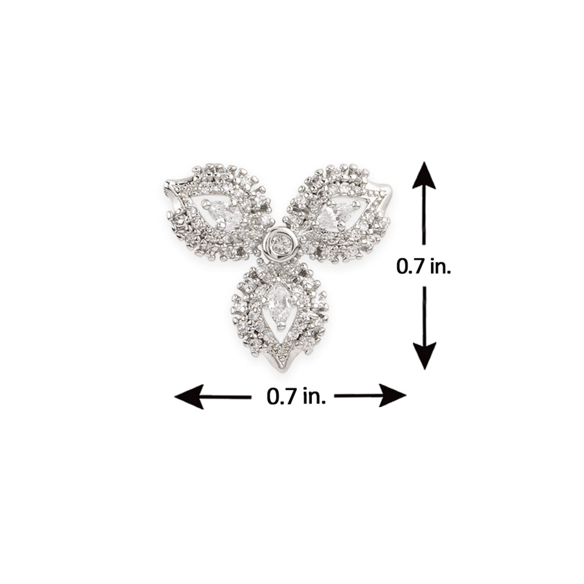 Go from glam to ultra glam and vice versa. These brass earrings feature a floral motif with all American Diamond stones set to perfection. The earrings are rhodium finished just like white gold jewelry so you get the full look, feel and experience of fine diamond jewelry.