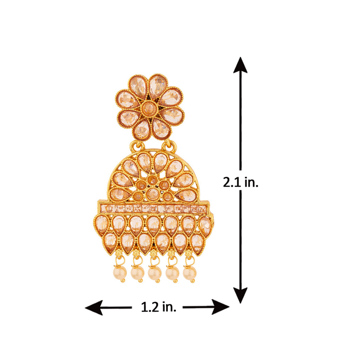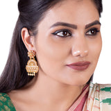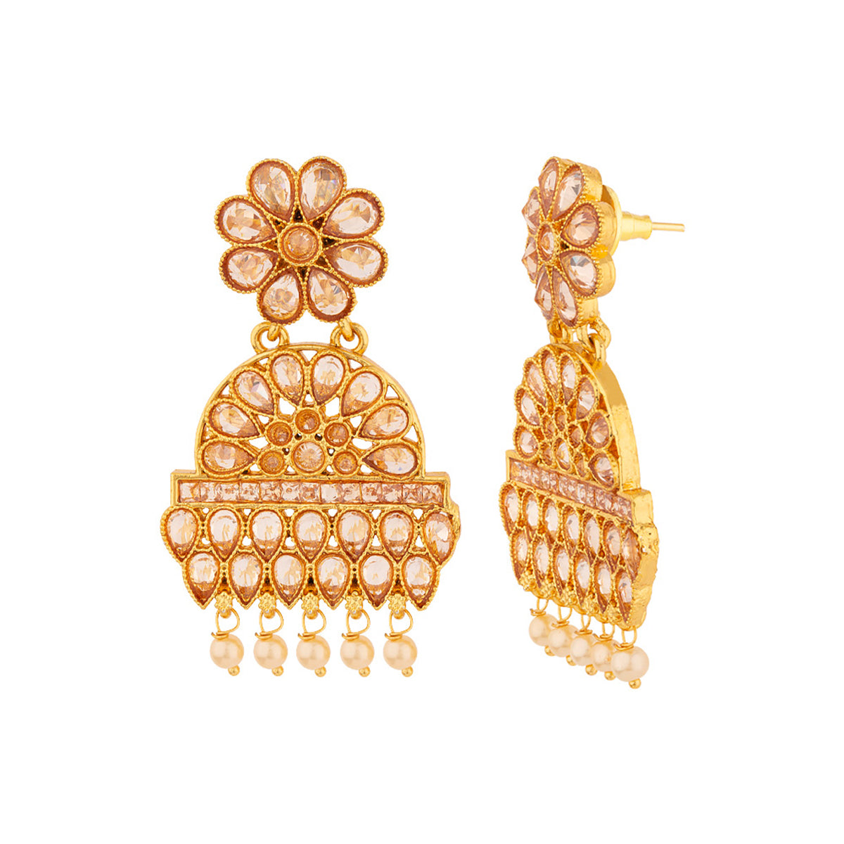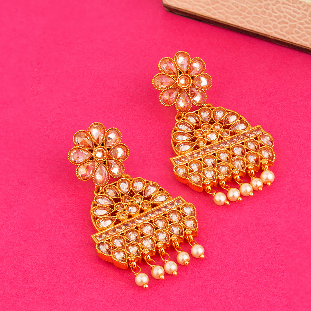 Floral motif ethnic drop earrings with faux pearls and kundan gems. Made from brass and yellow gold plated. Pair with formal Indian attire.