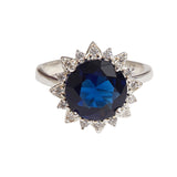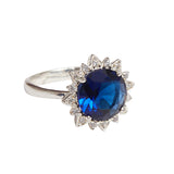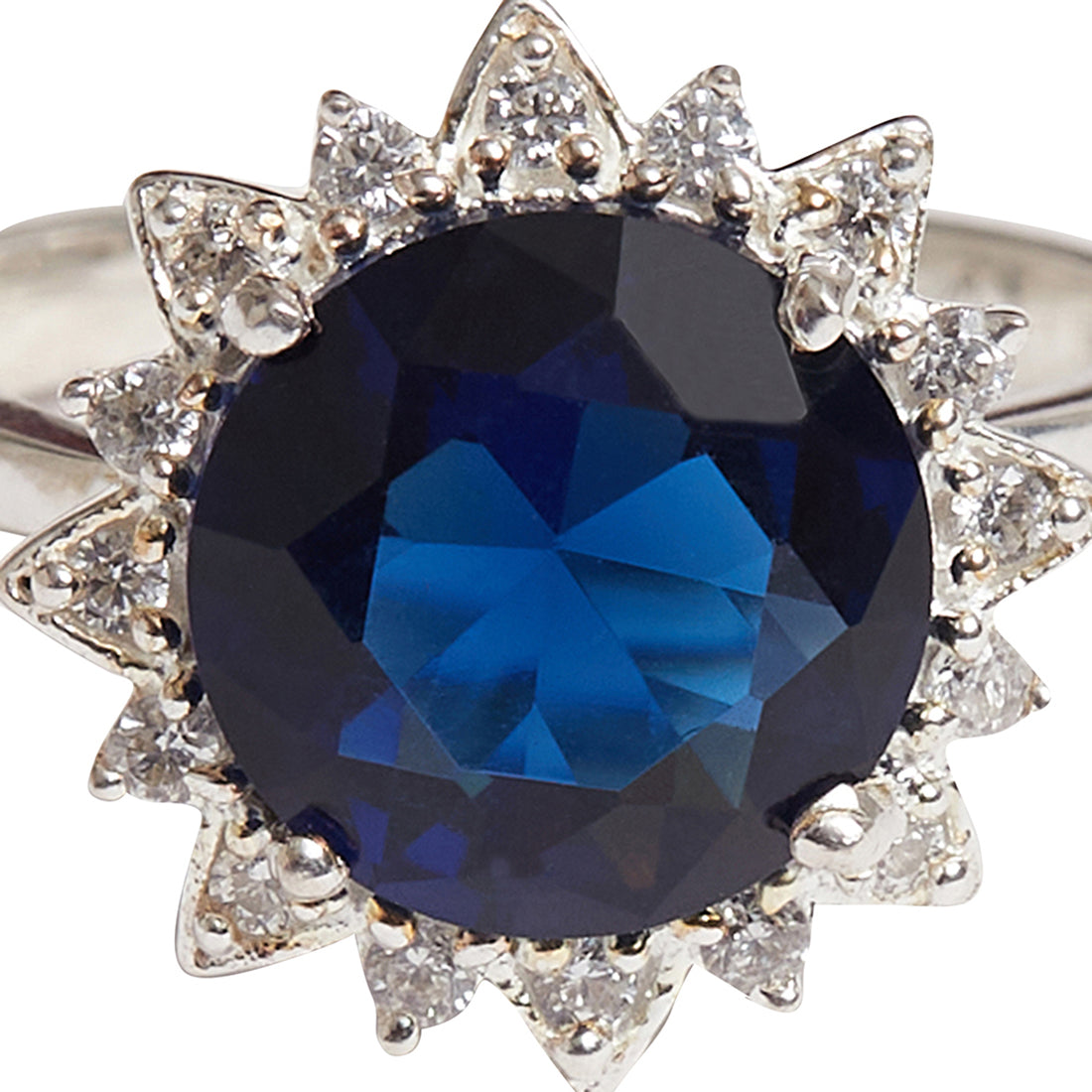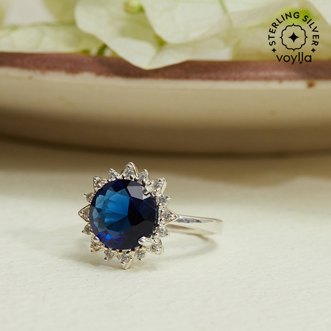 An adjustable 925 sterling silver finger ring in a floral motif, embellished with a single, large, round cut Sapphire gem. Silver plating adds to the charm of this adjustable ring, which is versatile enough to be paired with just about everything.