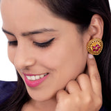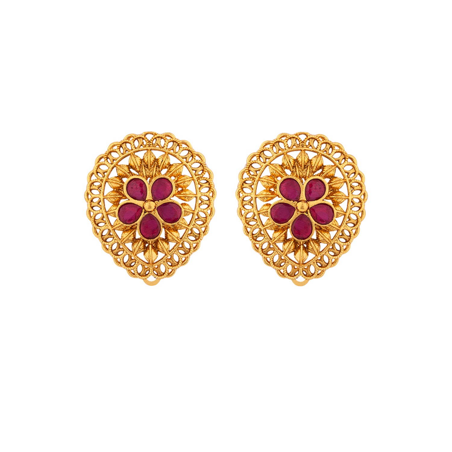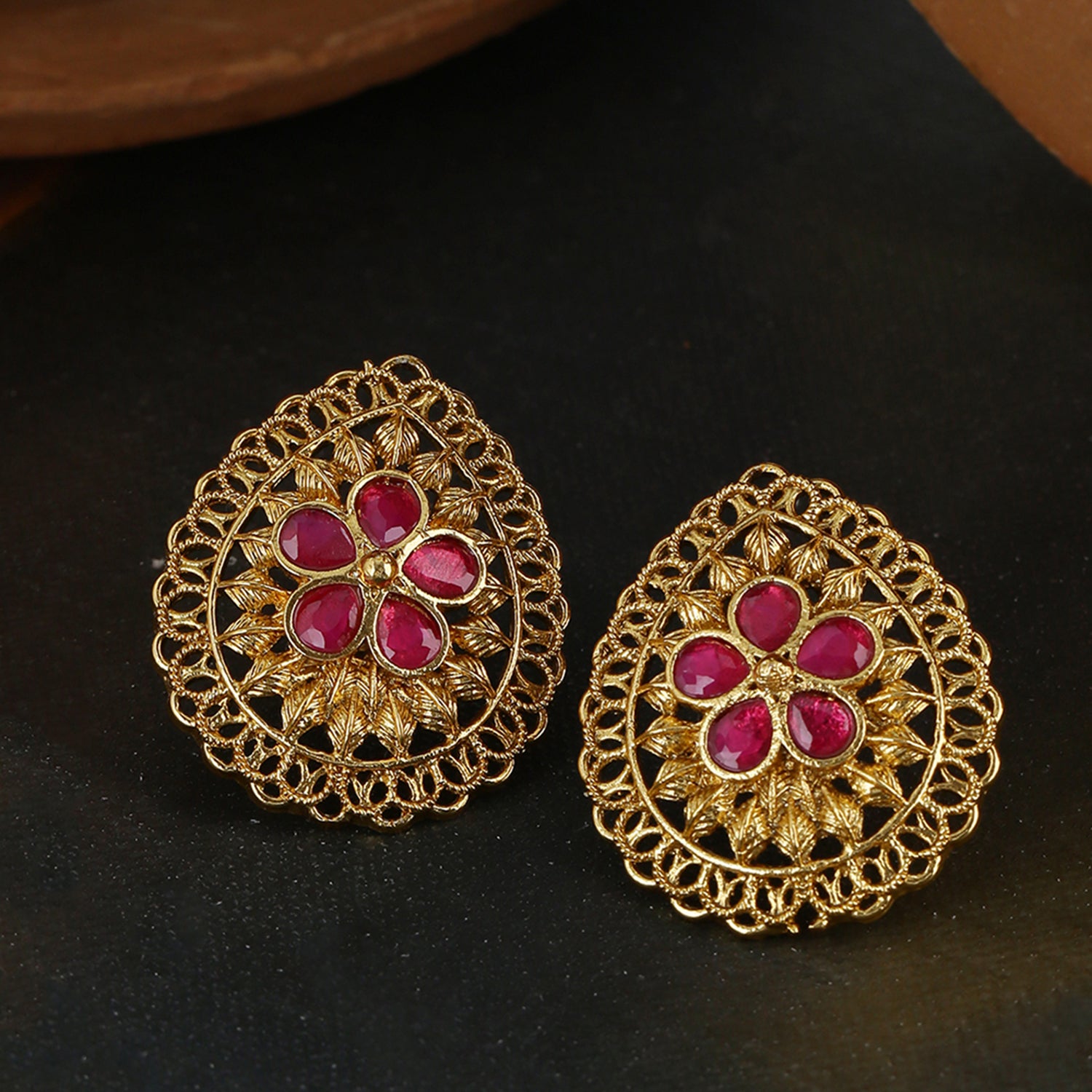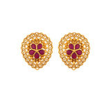 Stud style earrings with floral motif. American Diamond gems embellished and yellow gold plated. Wear the brass earrings with a casual kurta.