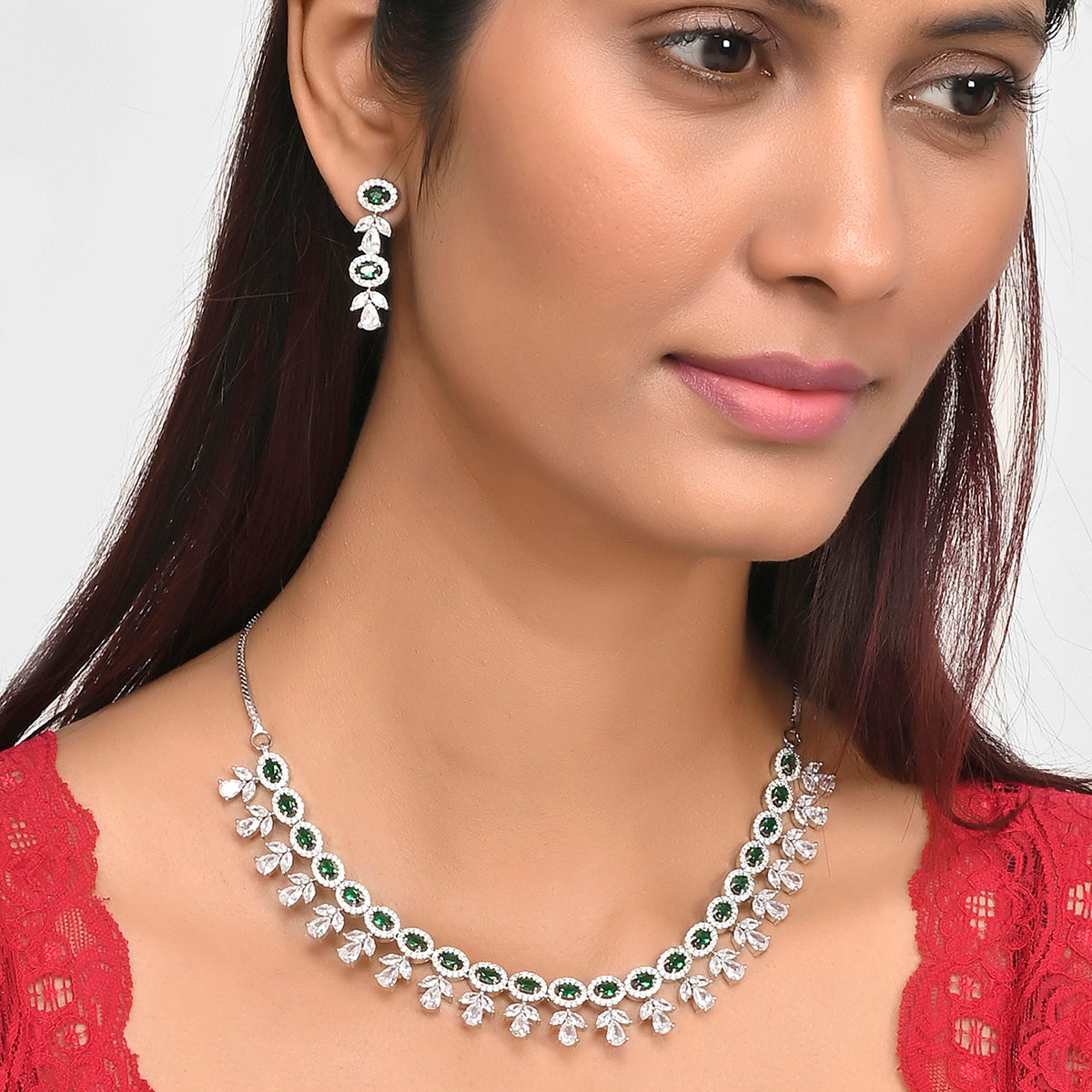 Floral Motif Teardrop and Round Cut Zircons Embellished Brass Silver Toned Jewellery Set