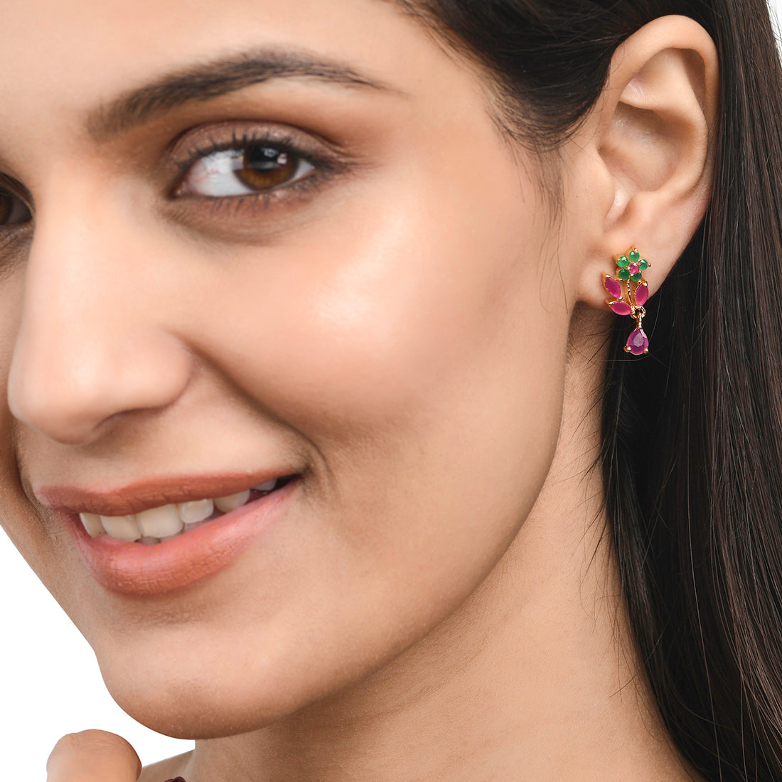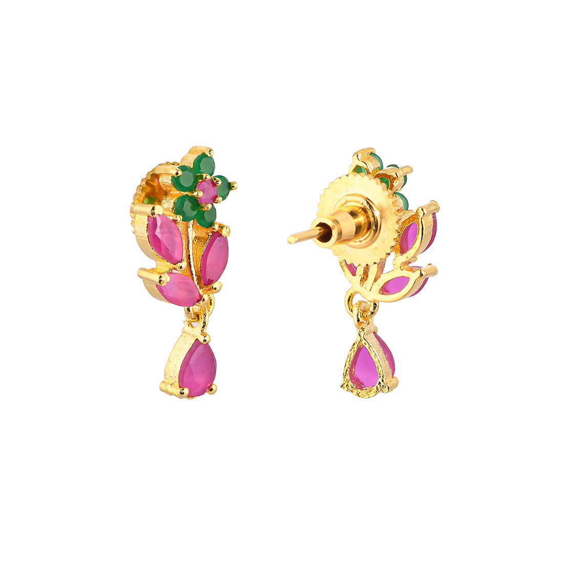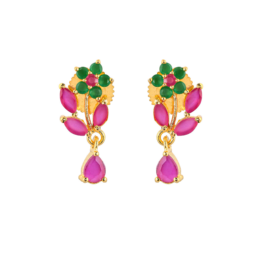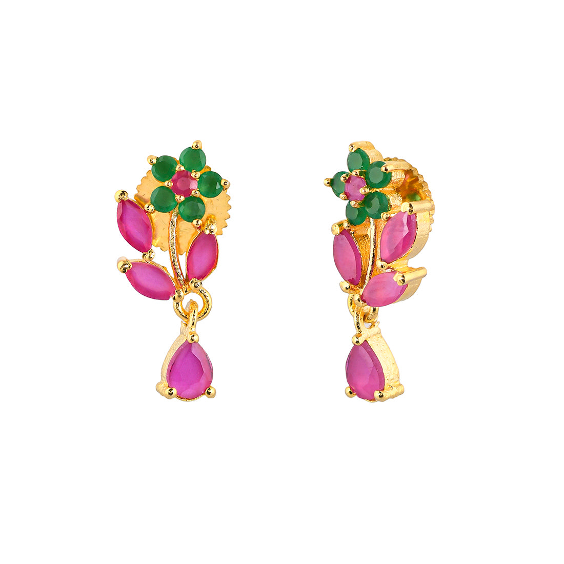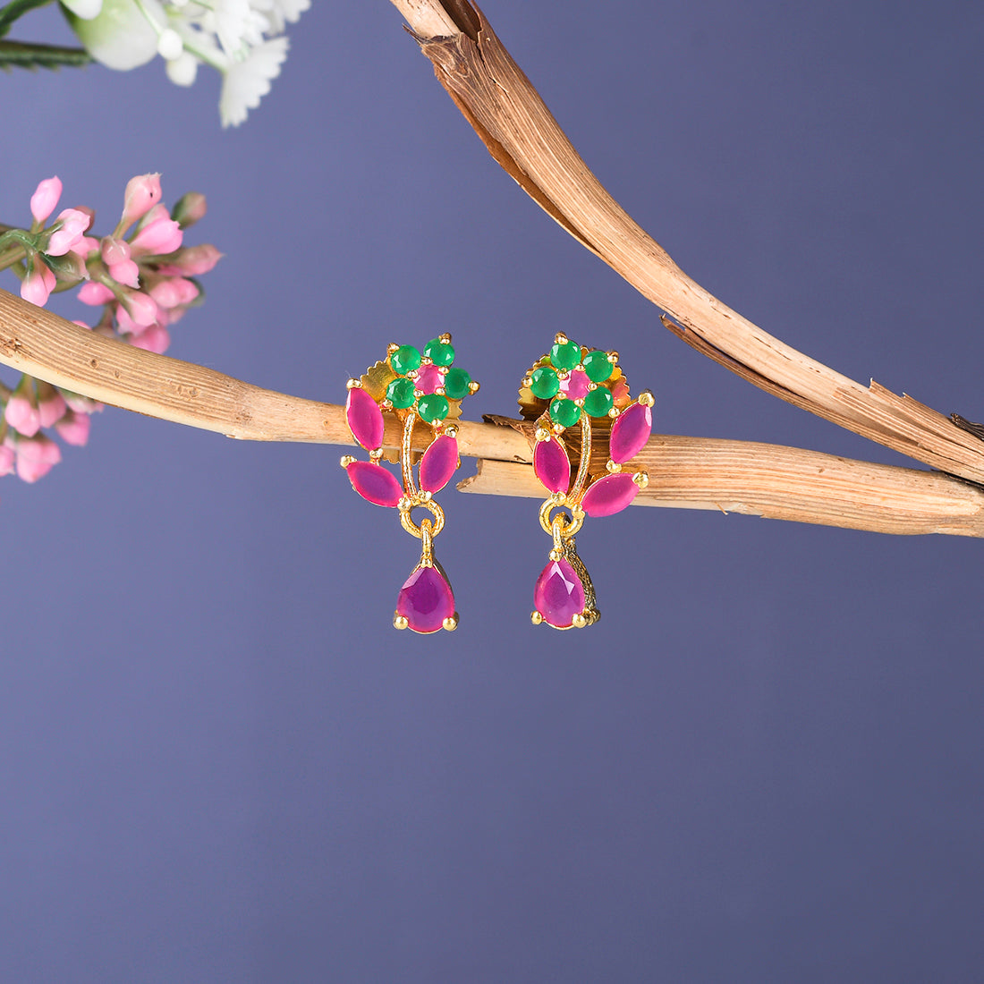 Tiny floral motif drop earrings with coloured zircon gems. Made from brass and gold plated. Wear with a causal kurta.