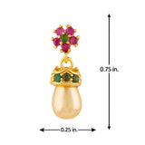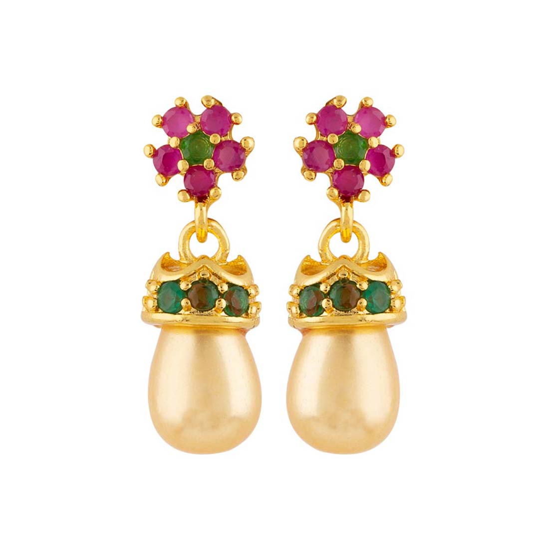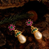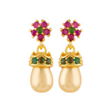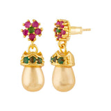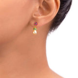 Floral motif adorned tiny brass earrings with gems and yellow gold plating. Perfect for casual wear.