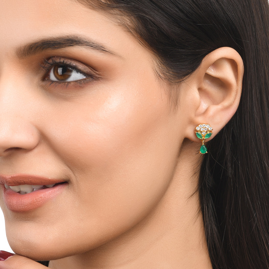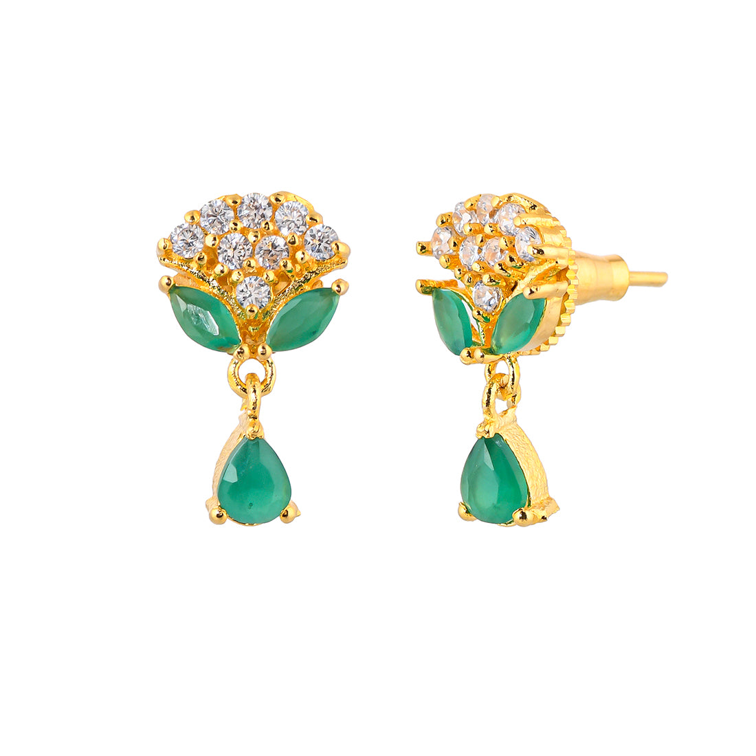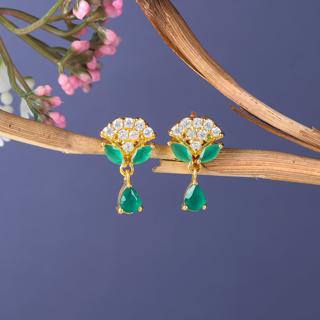 Tiny drop earrings in a floral motif with green and white CZ gems. Gold plated and crafted from brass. Pair with casual attire.