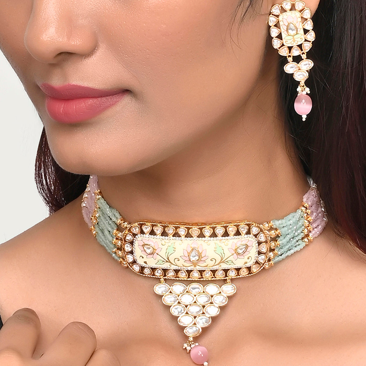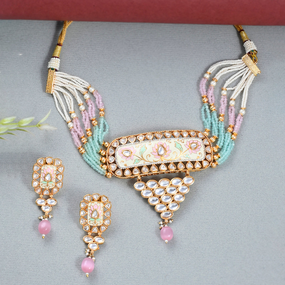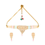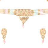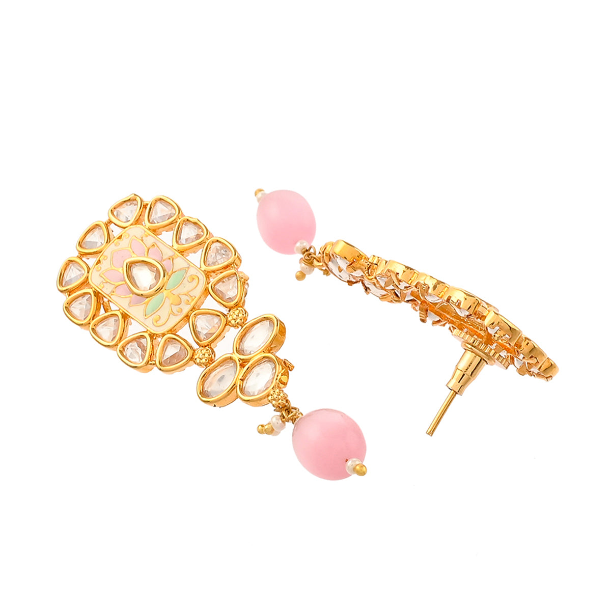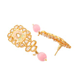 Floral Motifs Faux Kundan and Pink Pearls Brass Gold Plated Jewellery Set