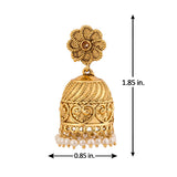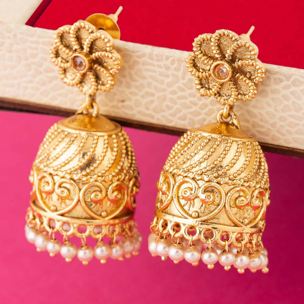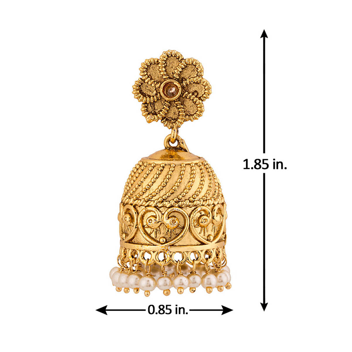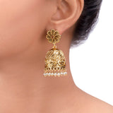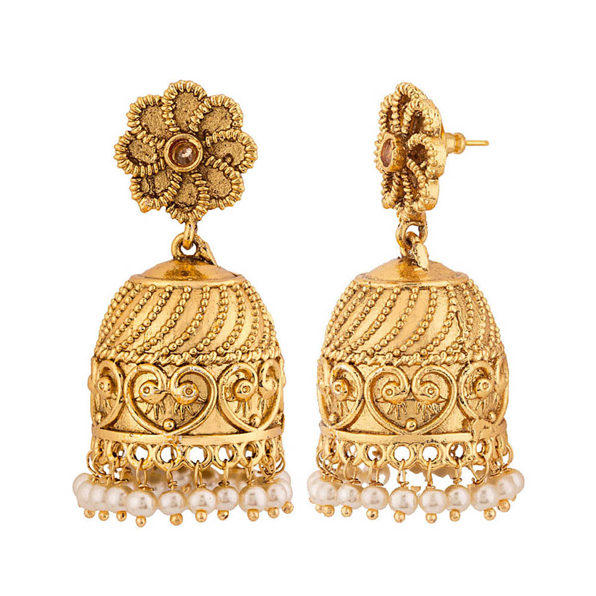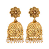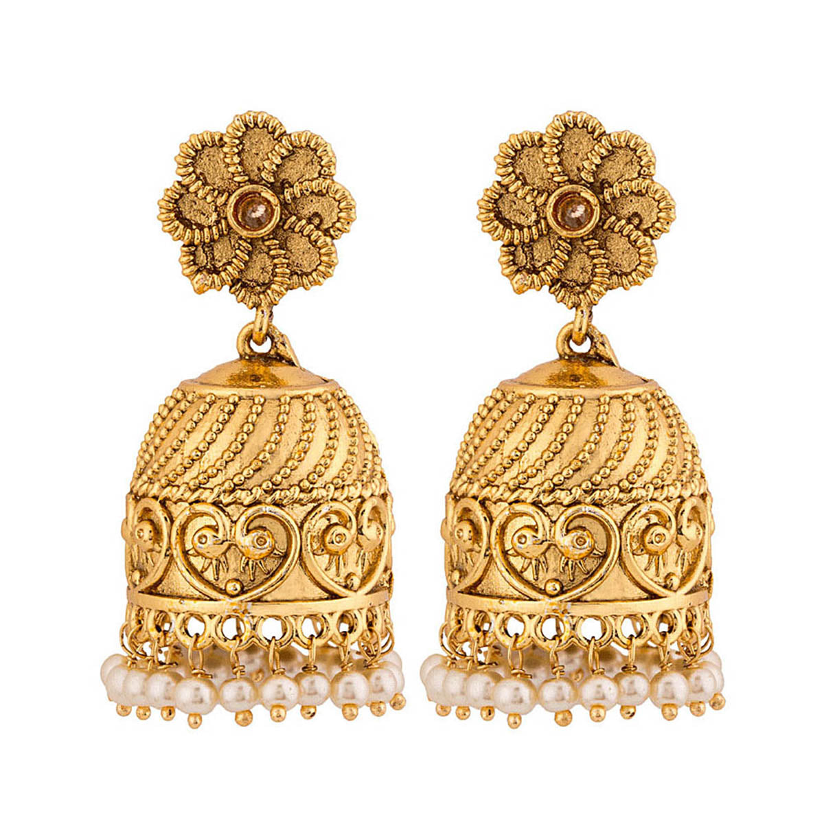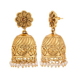 Floral motifs drop earrings made from brass and yellow gold plated. Faux pearls embellished. Pair with ethnic outfits.