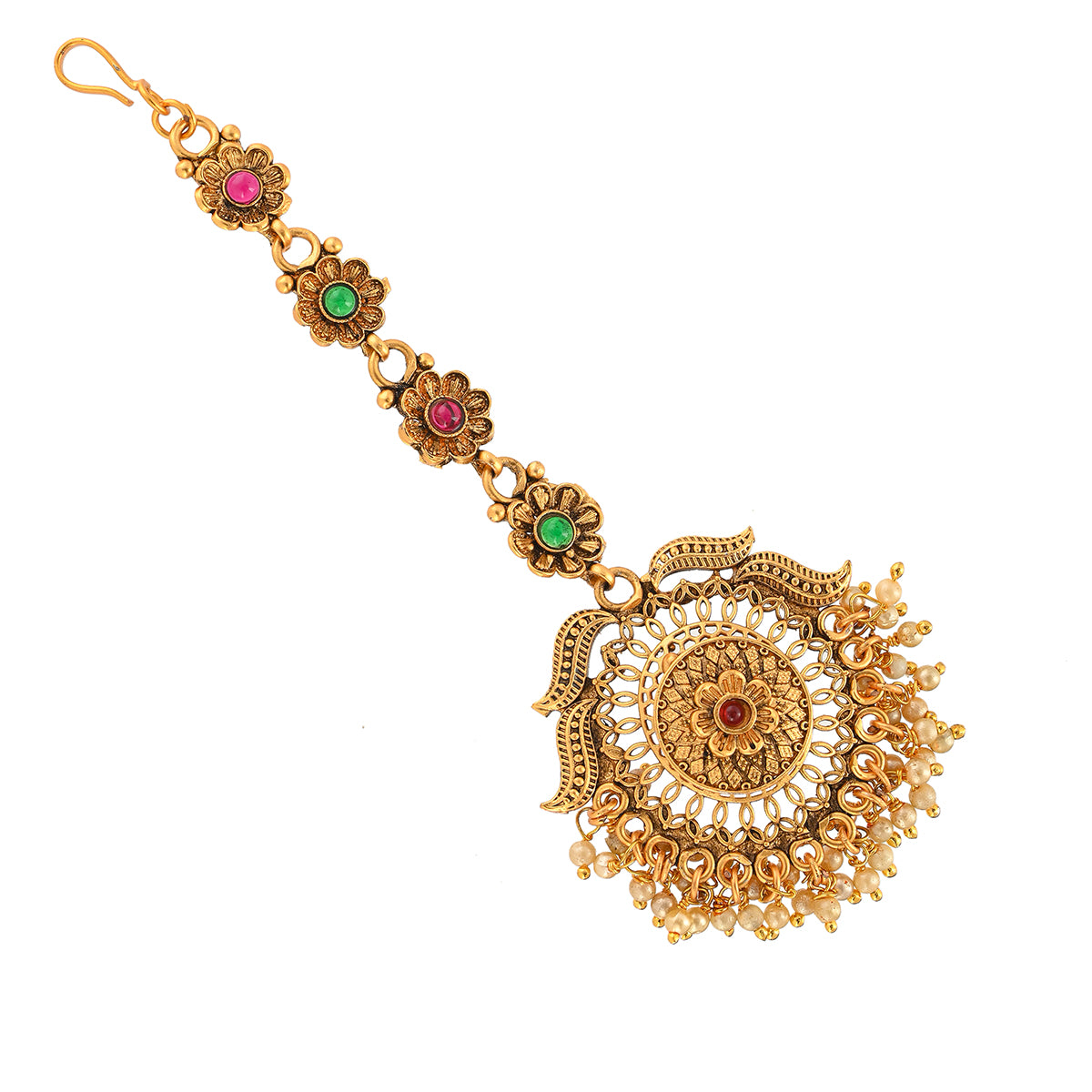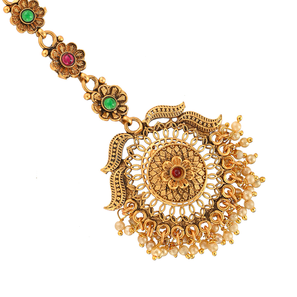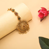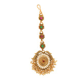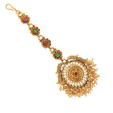 Embellished with CZ gems and faux pearls, this maang tika has been fashioned out of high quality brass. Yellow gold plating adds to the opulent allure of this piece, which features floral motifs and promises to be a comfortable wear at all times. Pair the versatile tika with any of your favourite formal Indian and Indo