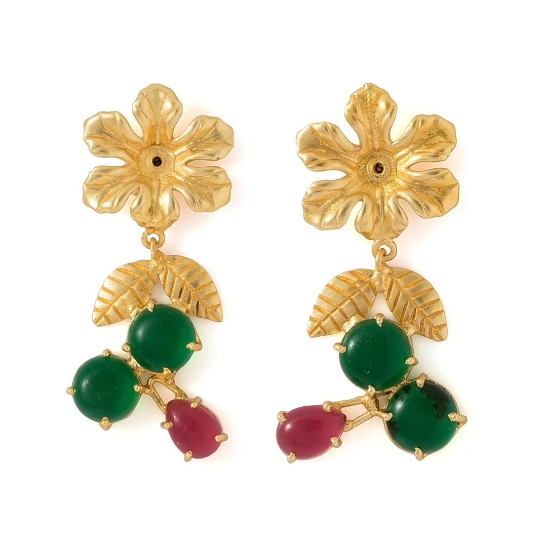 Brilliantly crafted, this pair of earrings is a perfect pick for parties. Featuring sheeny gold tone and attractive floral designs, this green and pink stones embellished pair of danglers will definitely glam up your look.