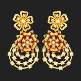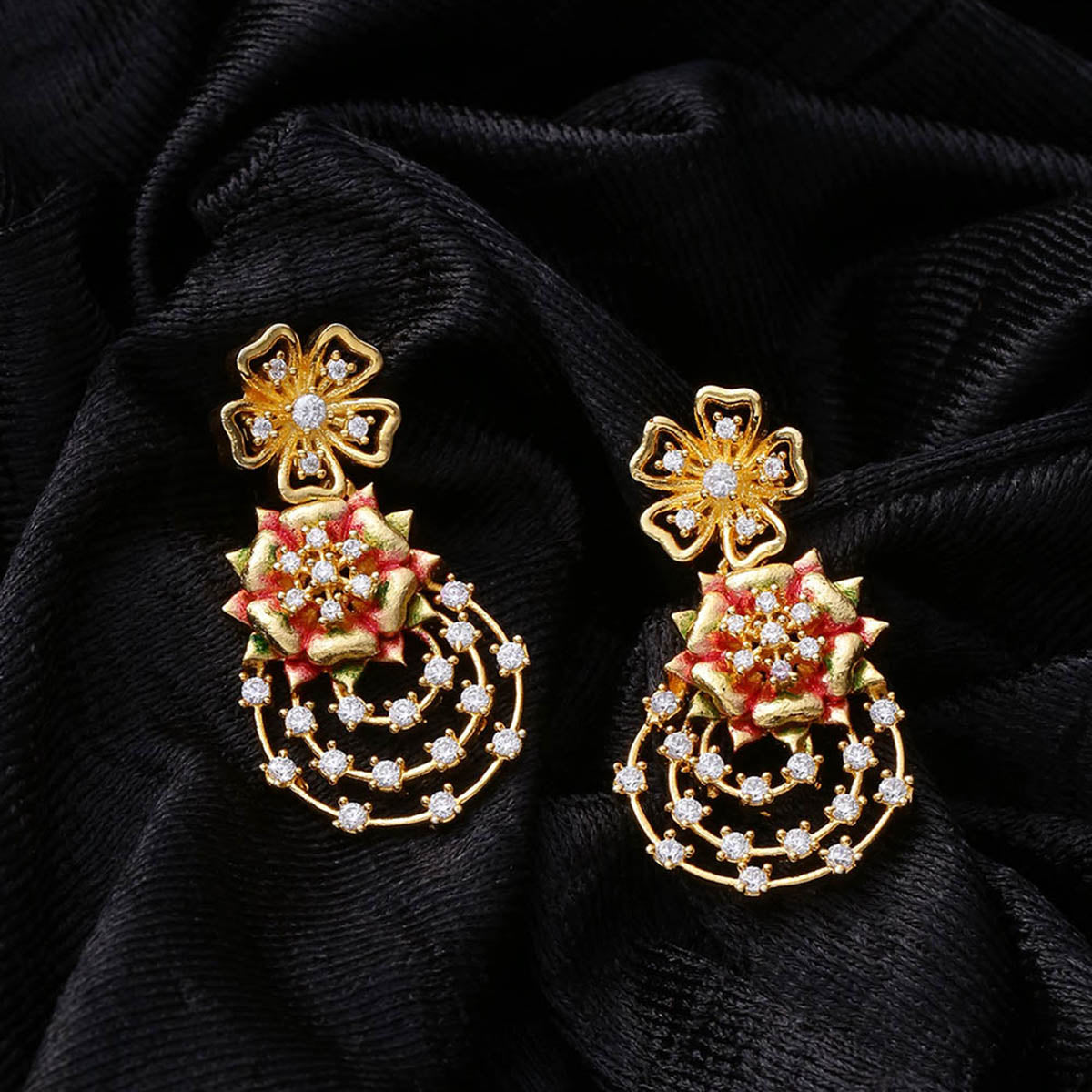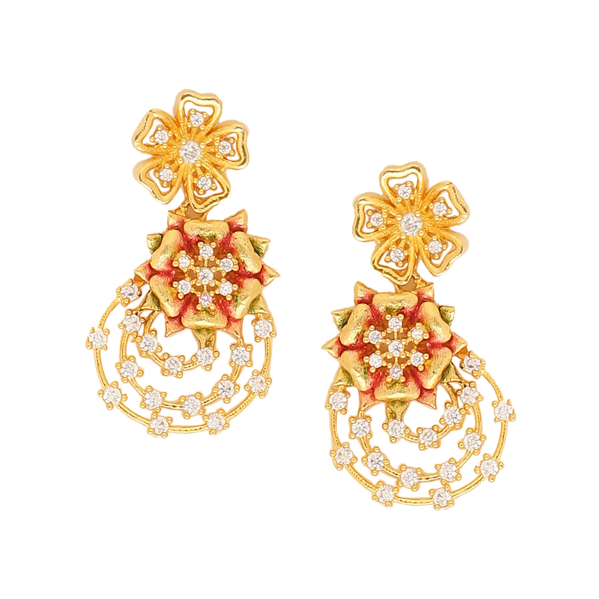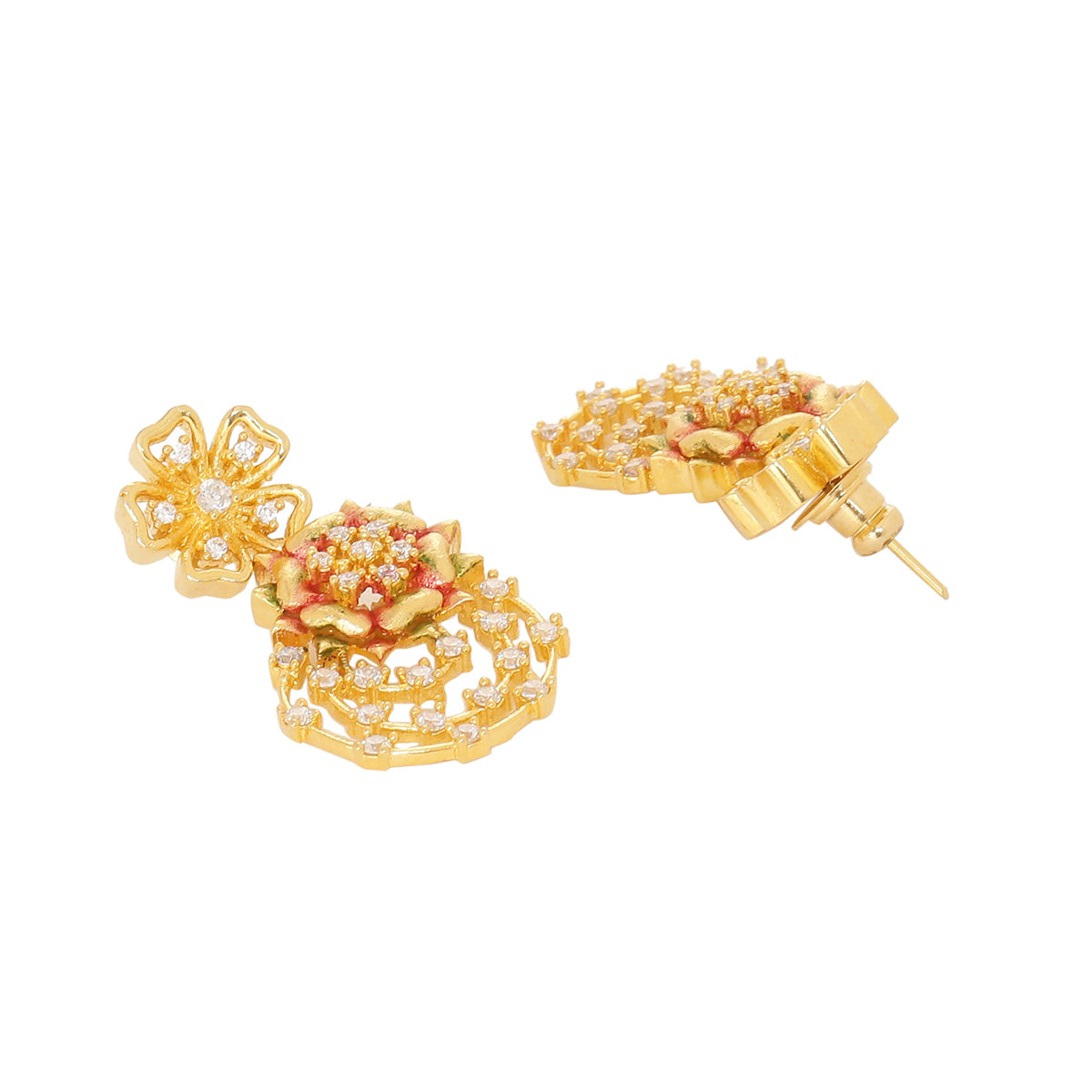 Yellow gold plated flowers inspired drop earrings. Made from brass and gemstones embellished. Pair with formal outfits.