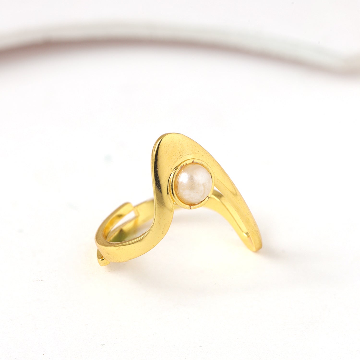 Part of Voylla’s Flow Tide Collection, the Seira Ring beautifully captures the essence of fluid movement and organic elegance inspired by ocean tides. Designed with soft sculptural curves, this ring reflects the rhythm of flowing water, effortless, graceful, and naturally feminine. The open silhouette creates a modern negative-space effect, giving it a contemporary yet timeless appeal. Crafted in high-quality brass and finished with rich yellow gold plating, the ring radiates a warm golden glow that enhances its smooth flowing form. The design features a delicate pearl accent nestled within the curve, symbolizing purity and calmness much like a pearl formed within ocean waves. The asymmetric structure adds a bold artistic touch while maintaining minimal sophistication. Lightweight and comfortable, the adjustable open design ensures an easy fit, making it suitable for everyday wear as well as special occasions. Whether styled with western dresses, office wear, festive outfits, or fusion ensembles, this stylish women’s ring effortlessly elevates your look. Wear it solo as a statement piece or pair it with delicate bands for a layered aesthetic. Perfect as a pearl ring gift for lover, girlfriend, wife, or someone special, it makes a meaningful choice for Valentine’s Day rings, anniversary gifts, birthday surprises, or propose day gifts. Elegant yet expressive, the Seira Ring celebrates modern femininity with a fluid twist.