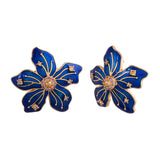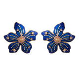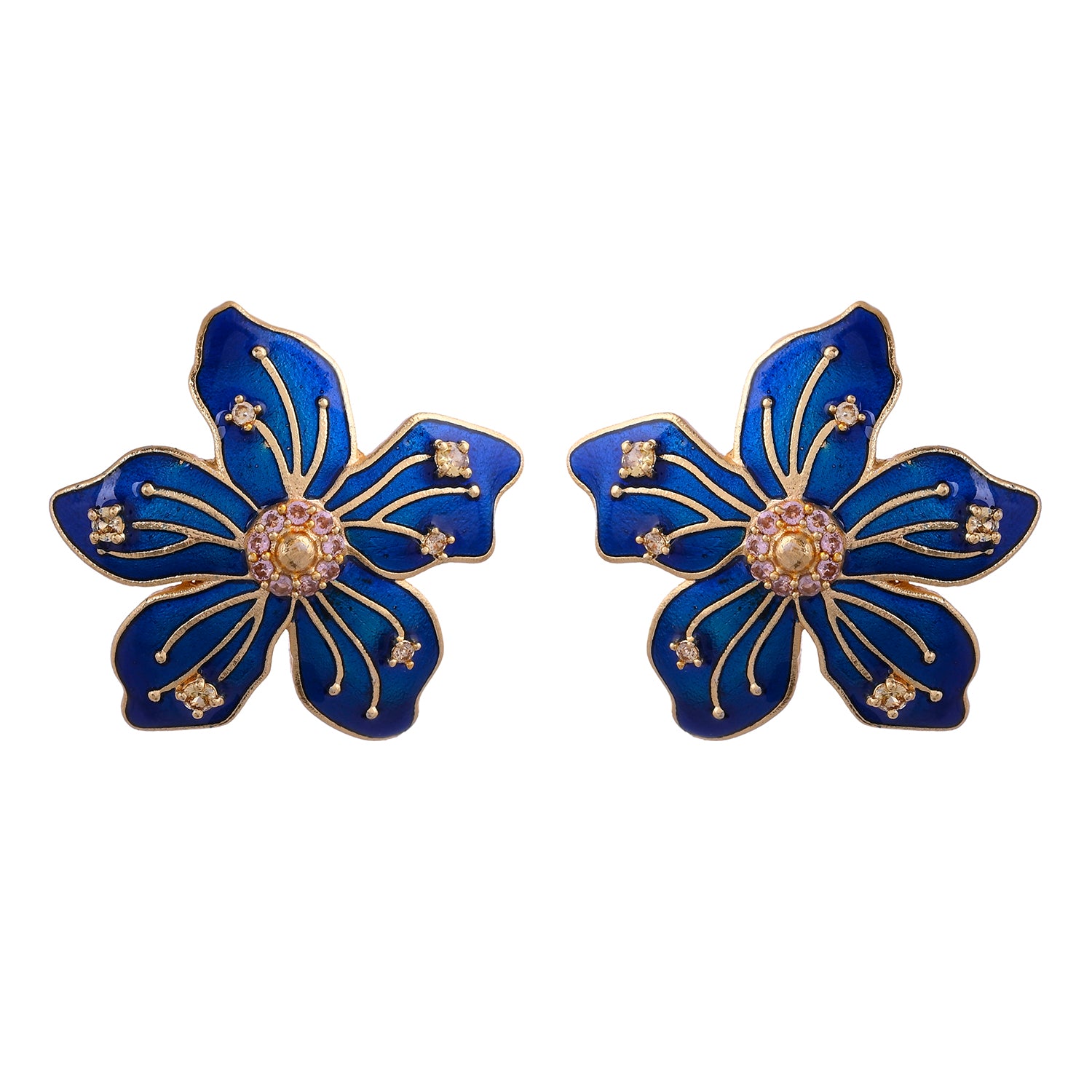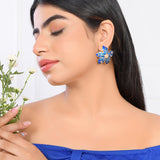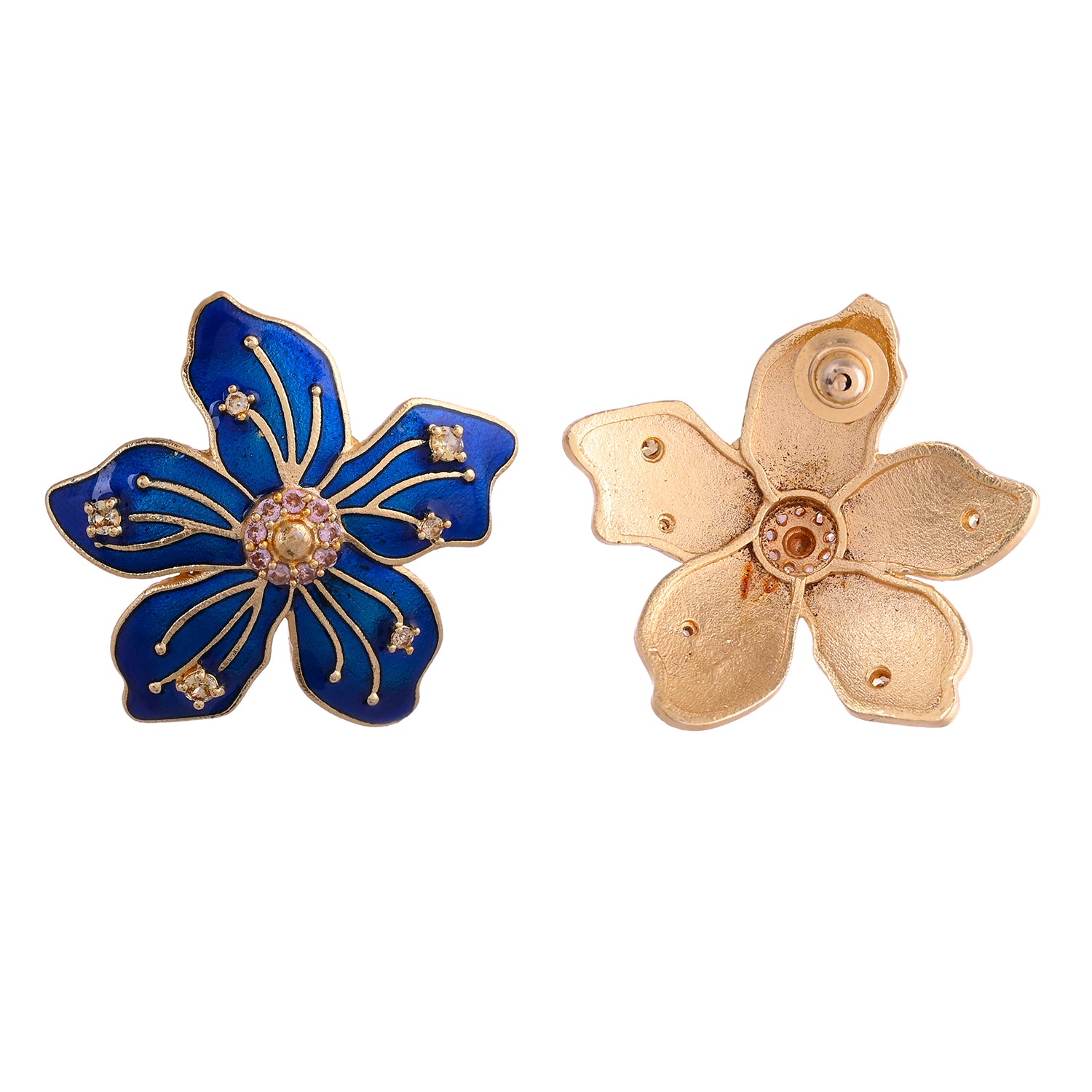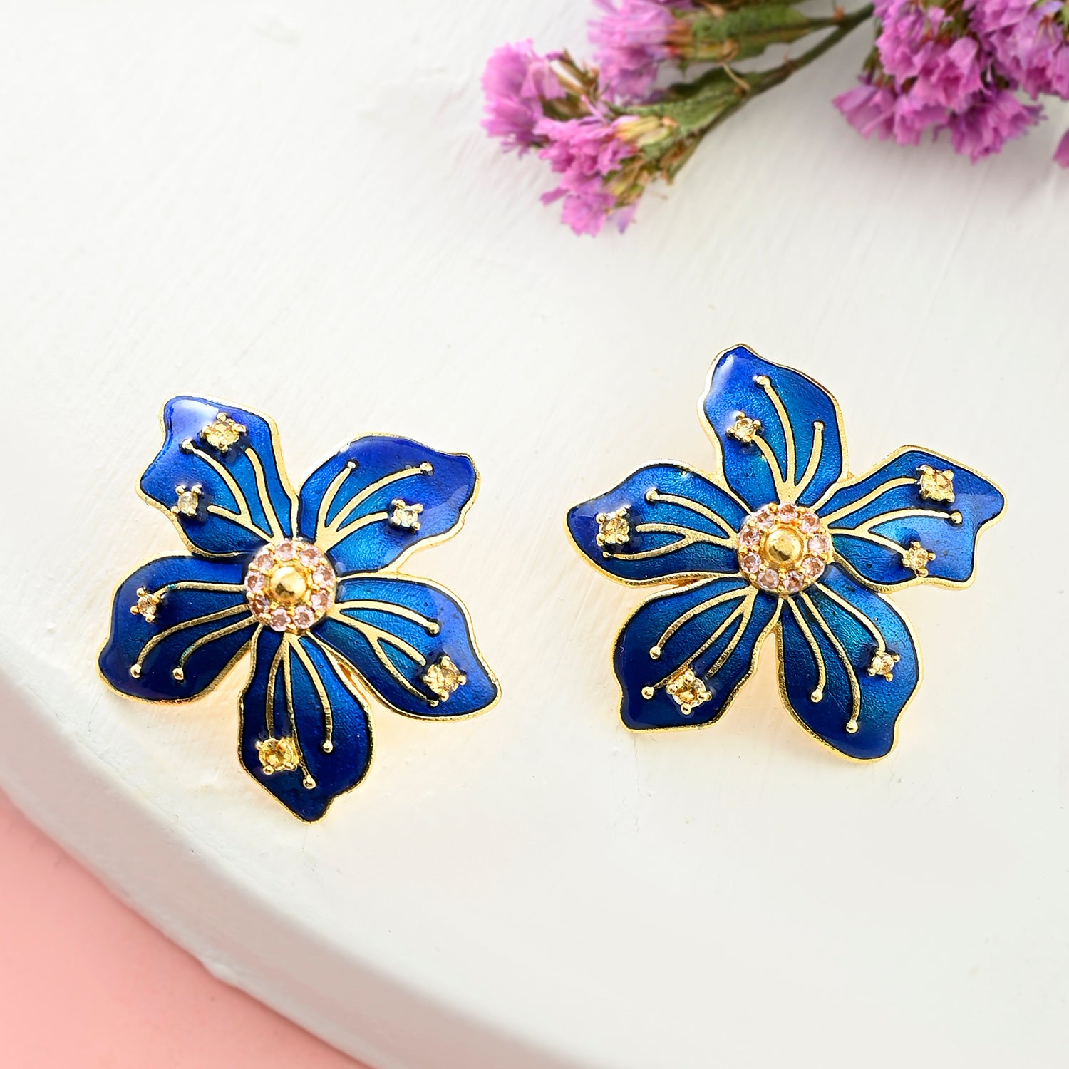 Make a statement with our Azure Blossom earrings. Crafted from brass with a lustrous gold plating, these big studs feature intricate blue floral designs accented with sparkling CZ stones in the center. Elevate your look with a touch of elegance and sophistication!