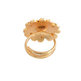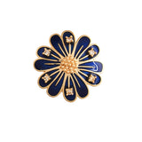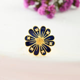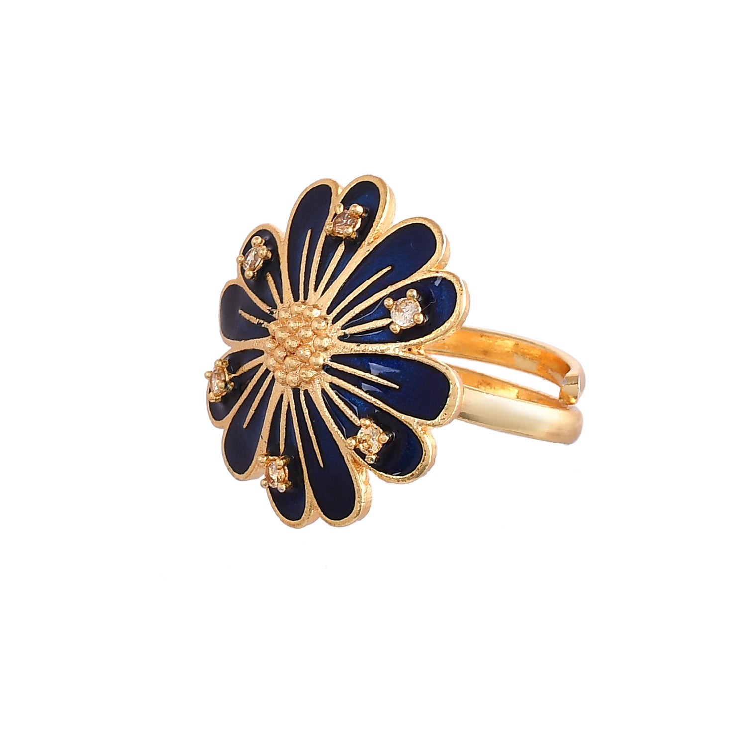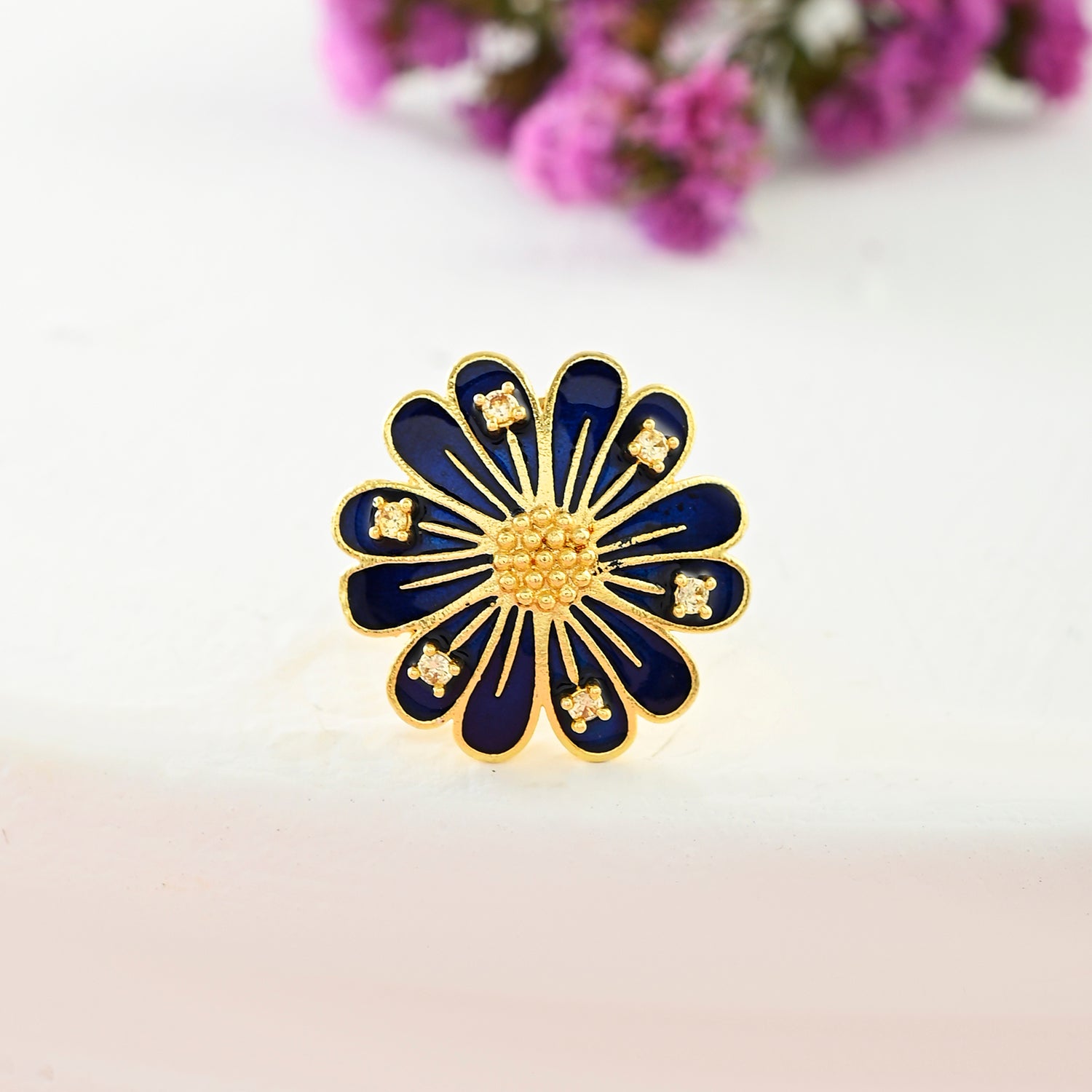 lluminate your style with our Azure Glow ring. Crafted from brass with a radiant gold plating, this ring features a captivating blue hue accented by small yellow stones at the center. Elevate your look with a touch of vibrancy and elegance